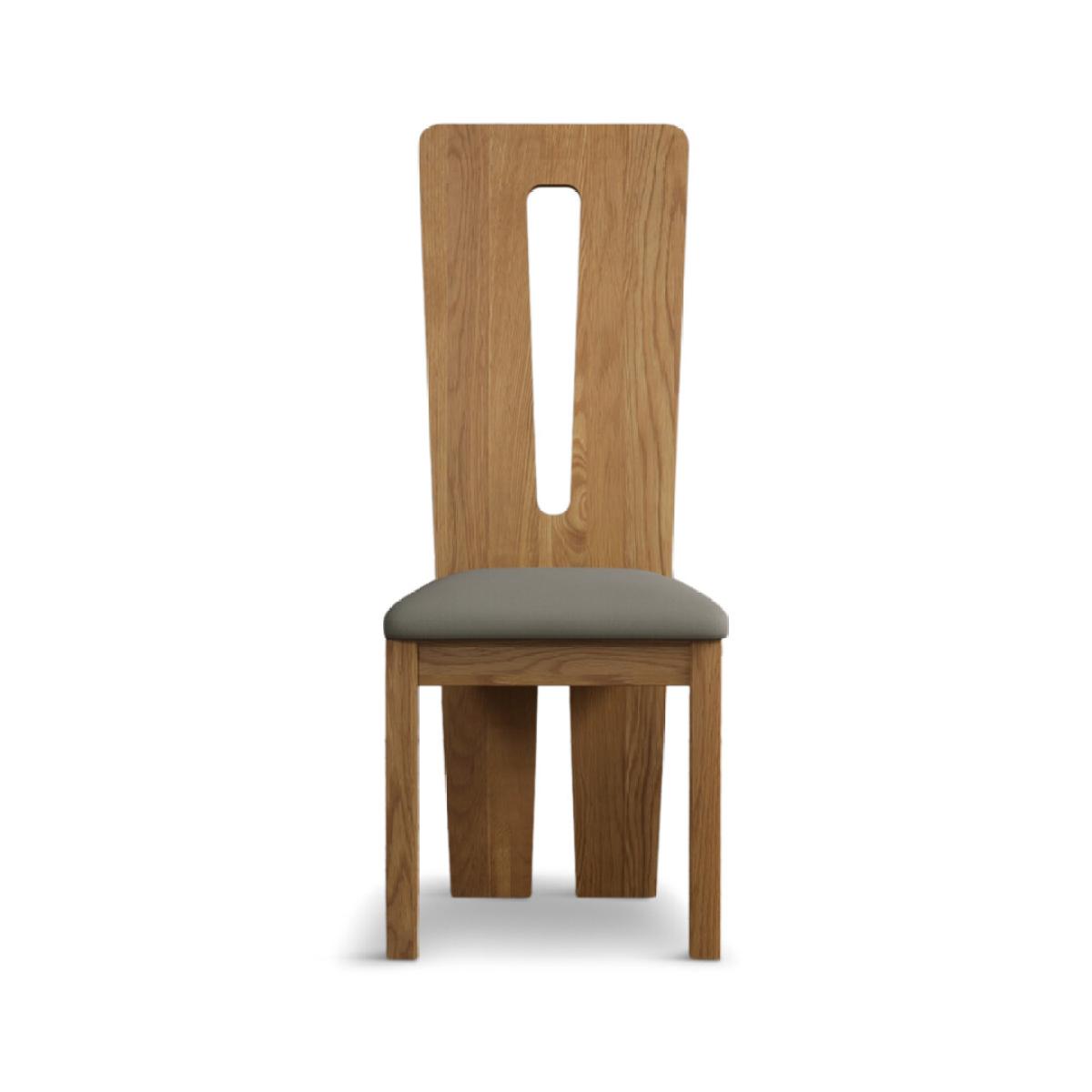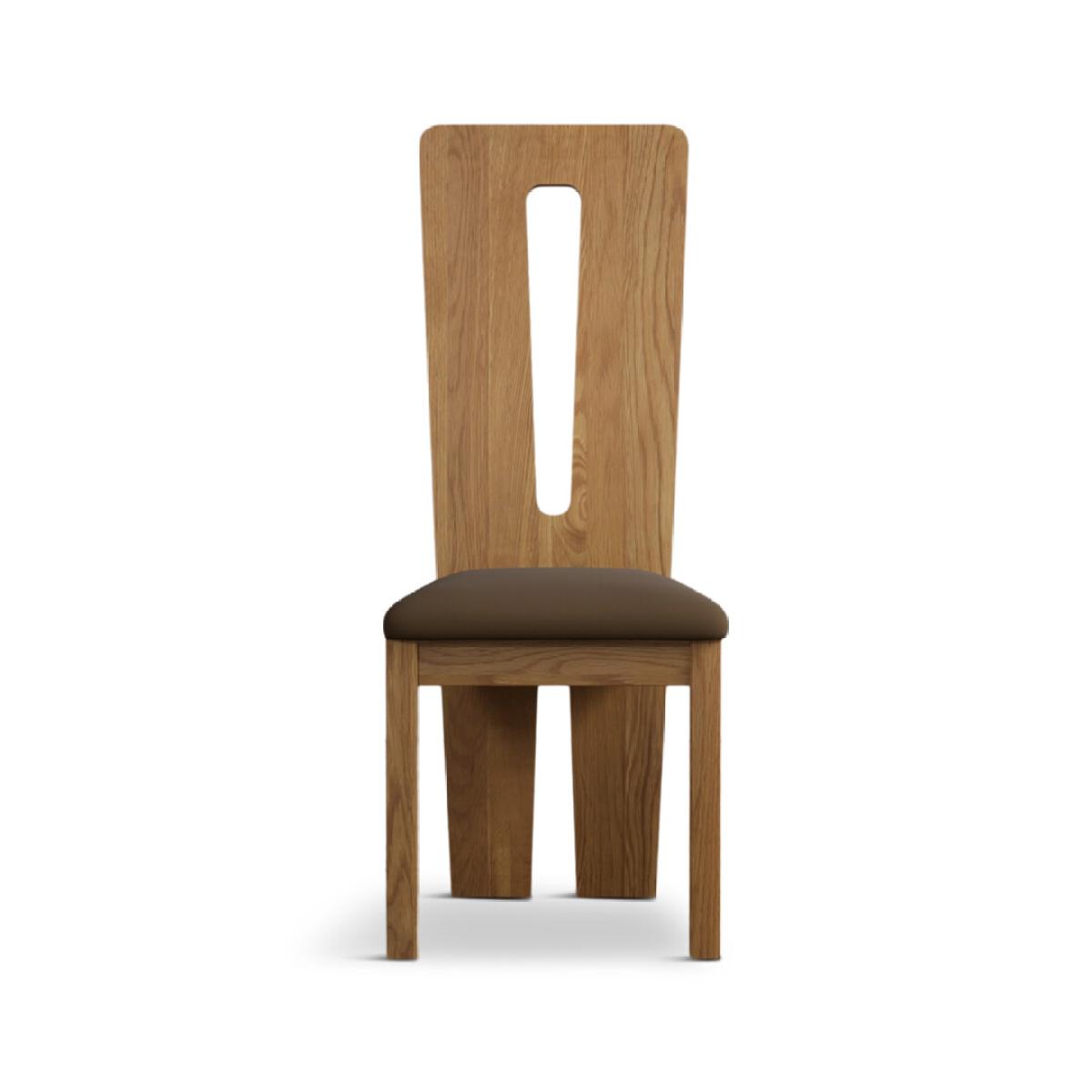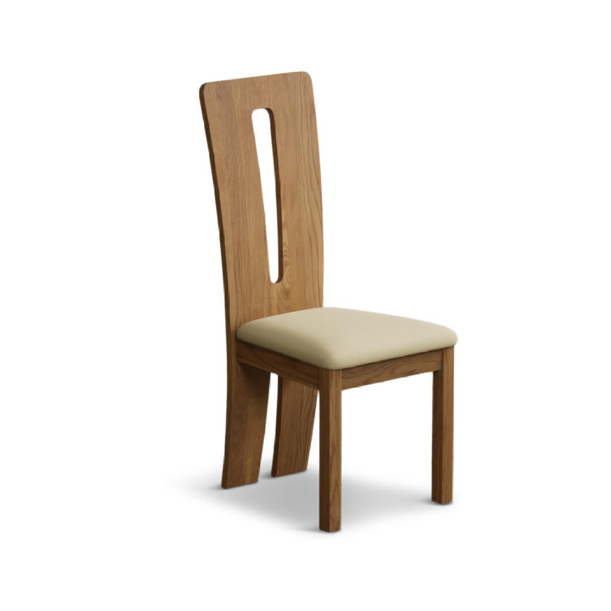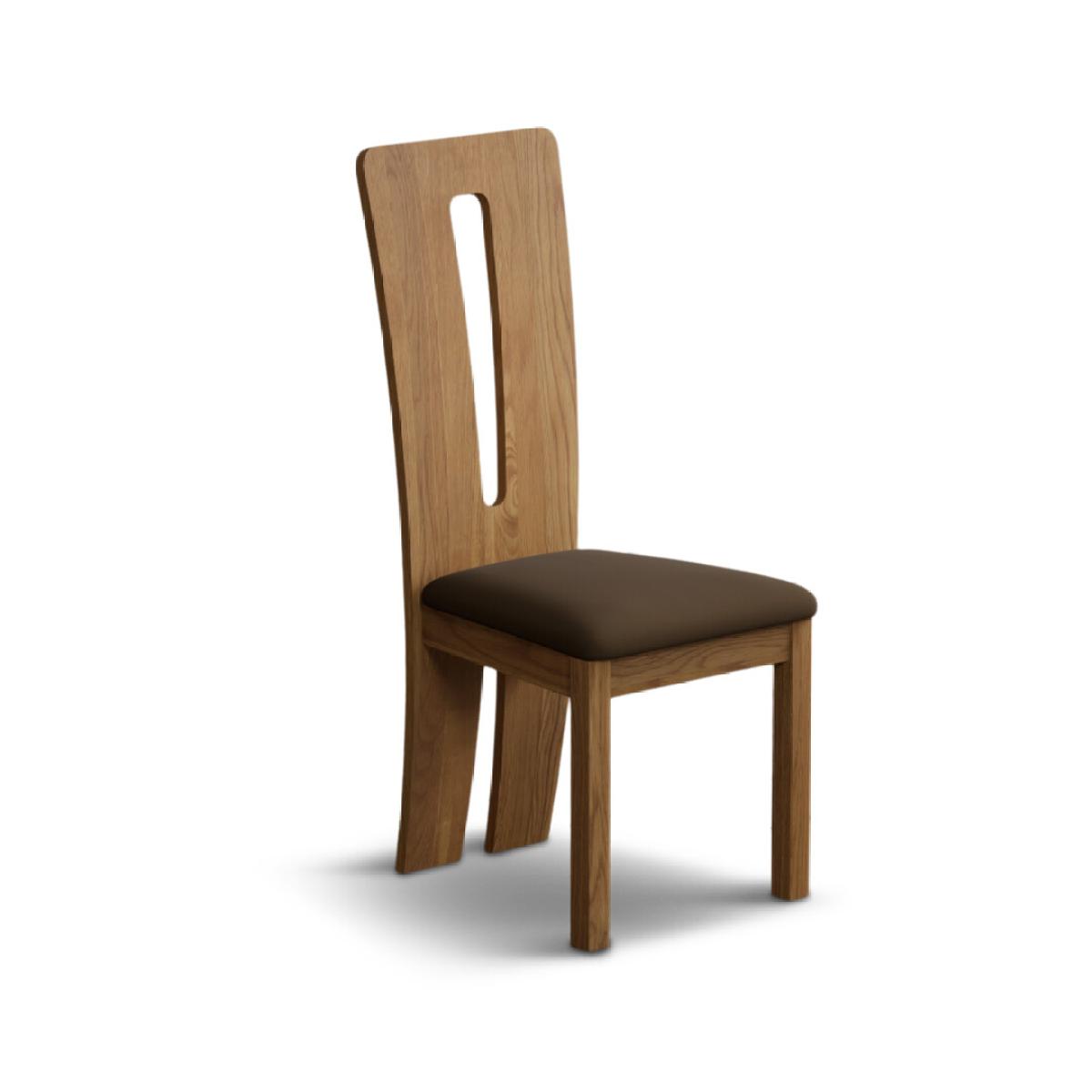 The Lucca Solid Oak Dining Chairs with Faux Leather Seat Pad are crafted from 100% solid oak, with a curved floor-length backrest with a cut-out design and faux leather seat pad.