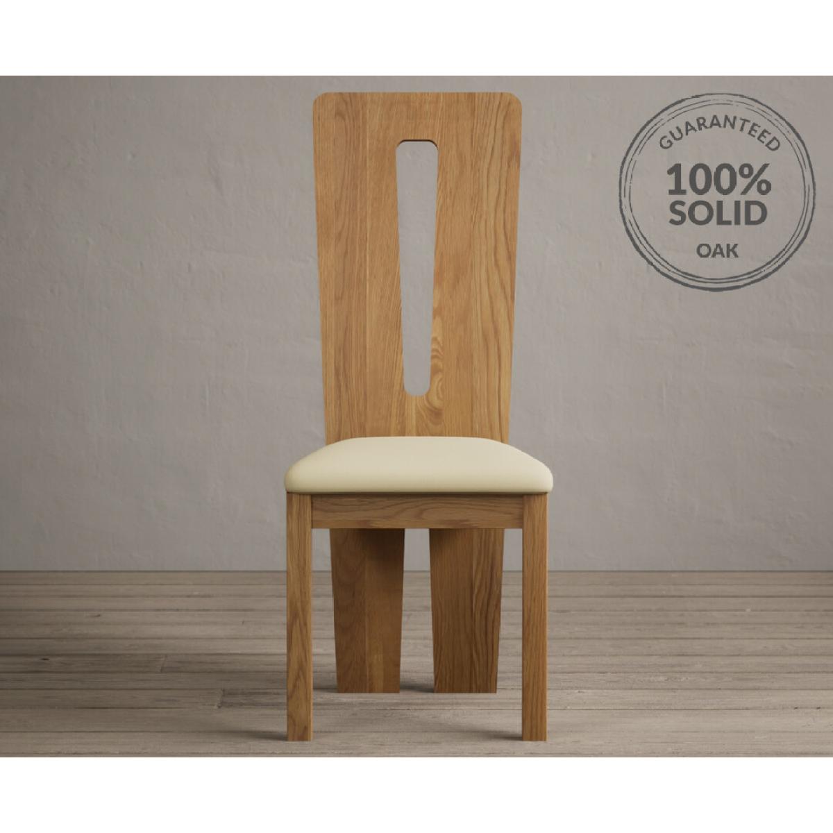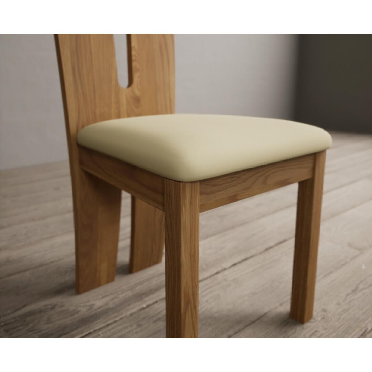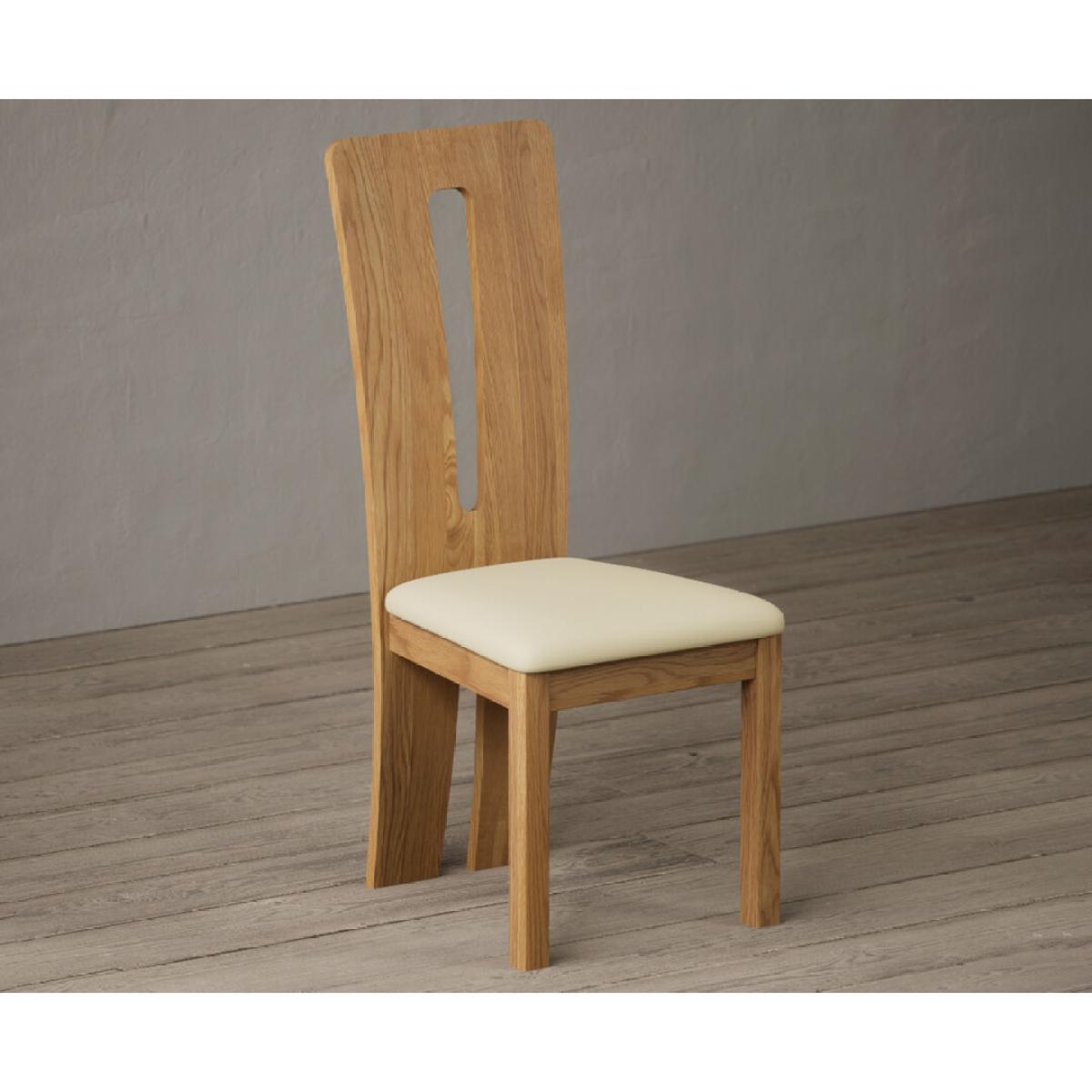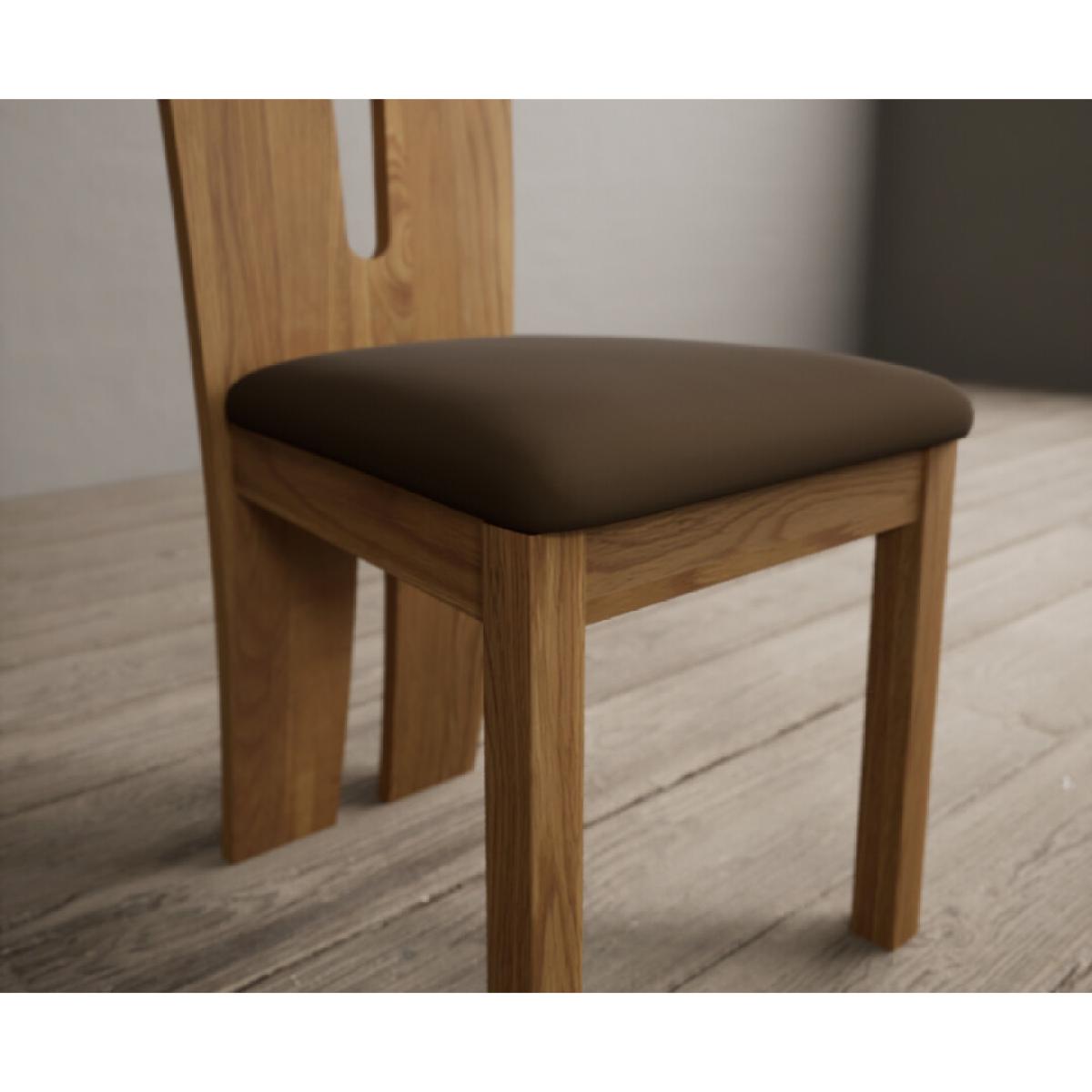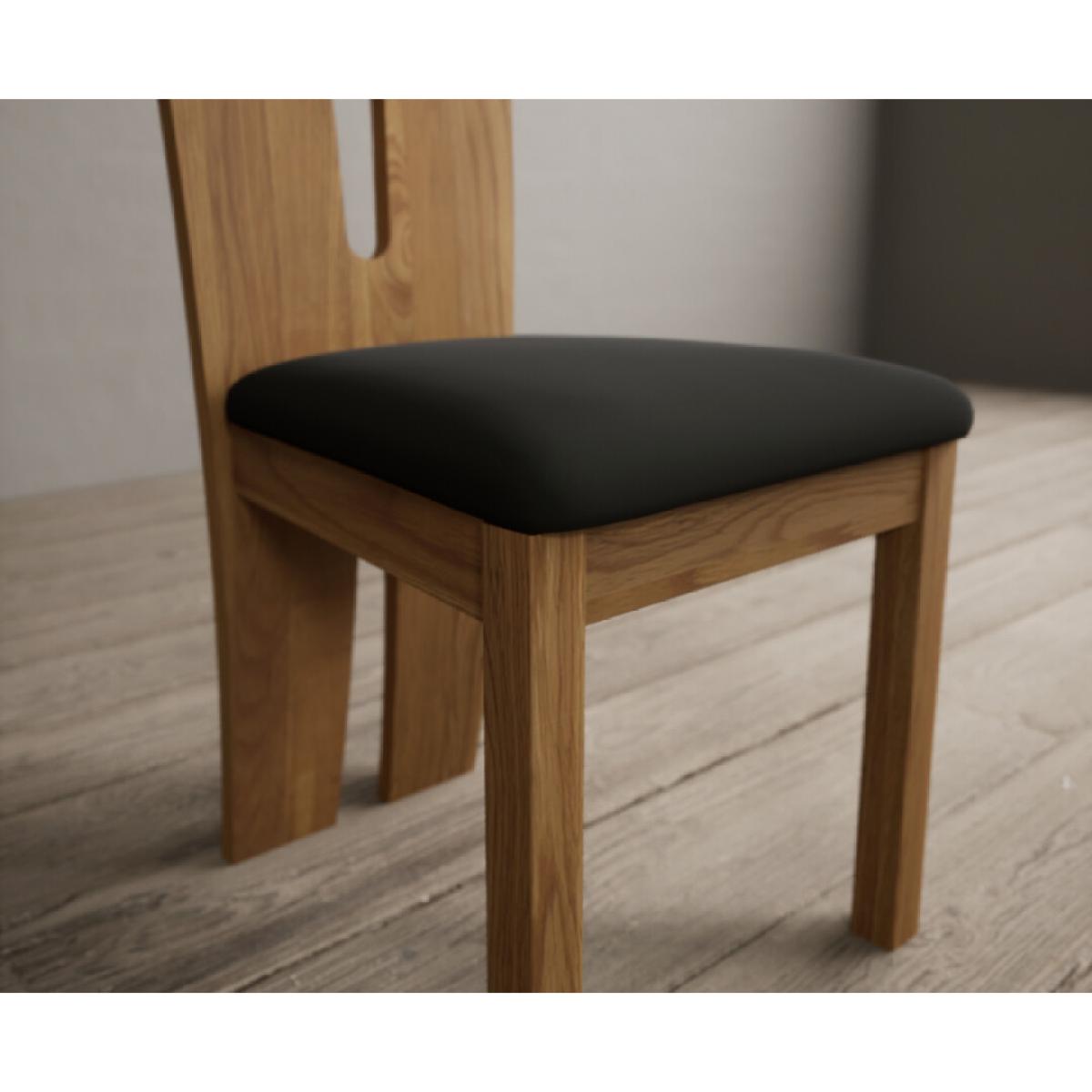 The Lucca Solid Oak Dining Chairs with Faux Leather Seat Pad are crafted from 100% solid oak, with a curved floor-length backrest with a cut-out design and faux leather seat pad.