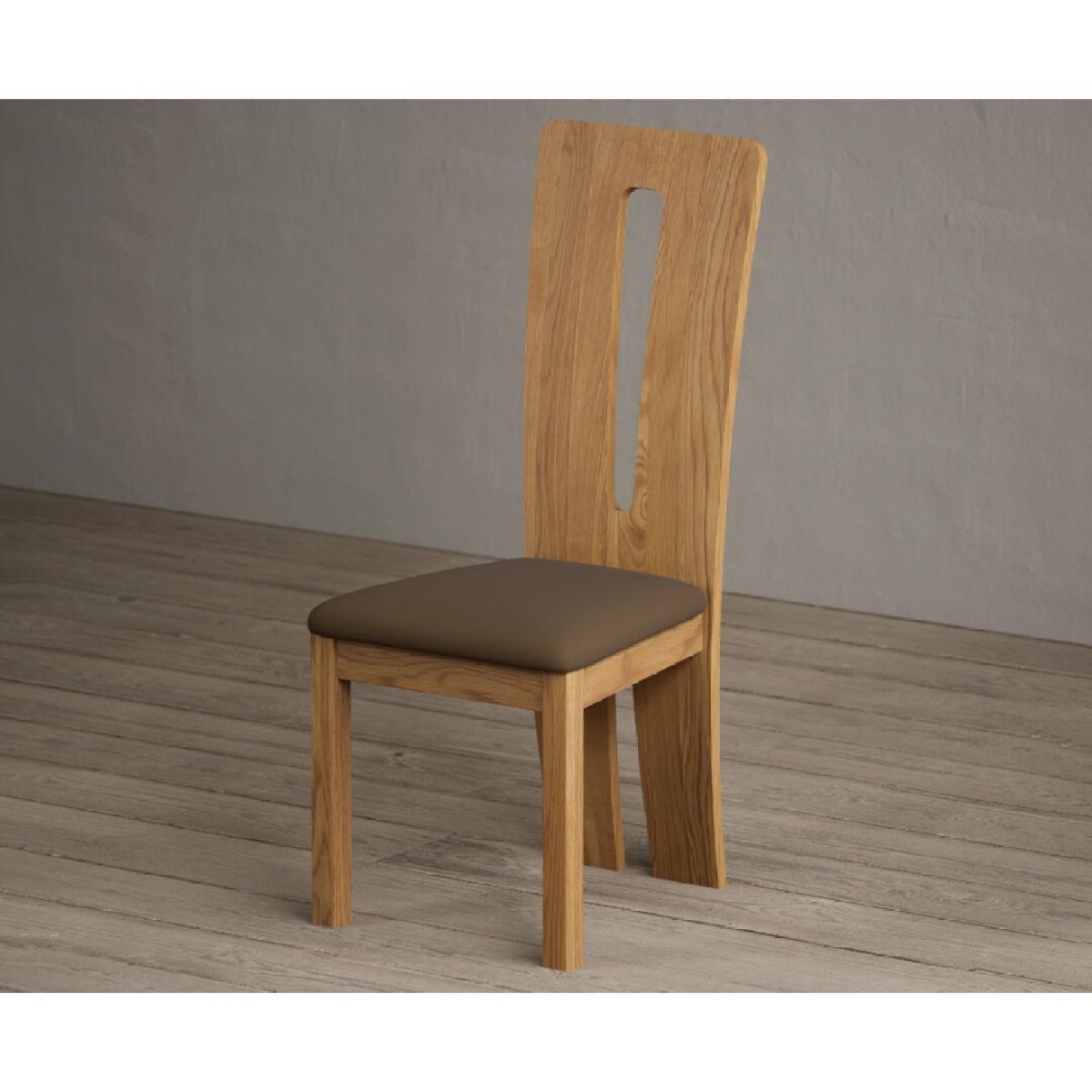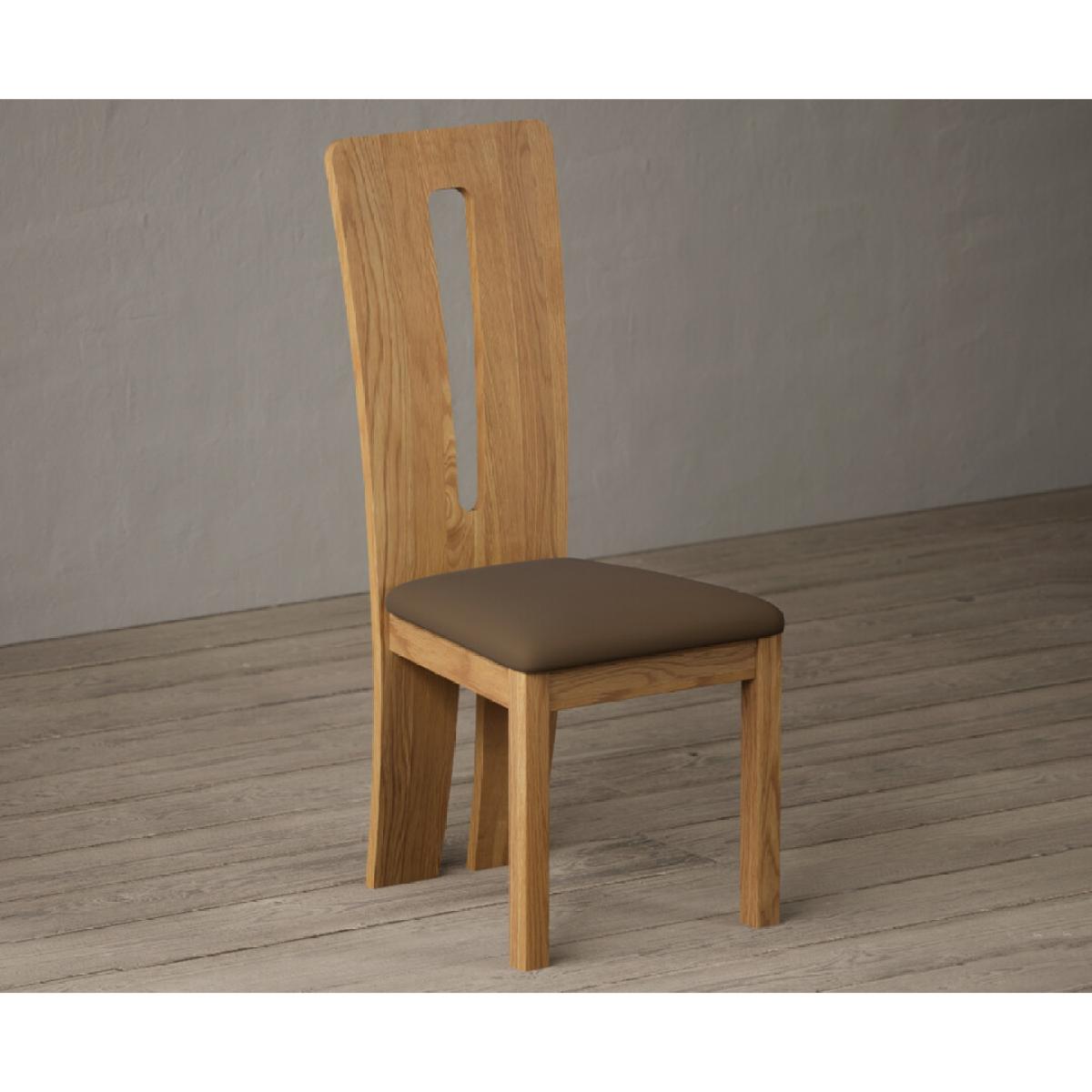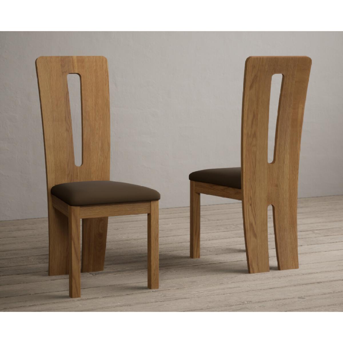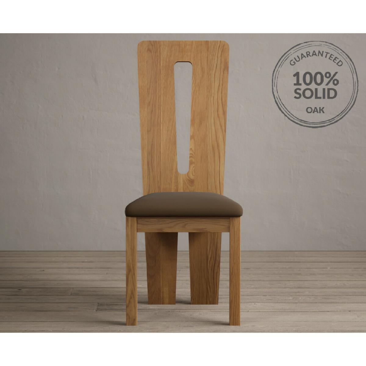 The Lucca Solid Oak Dining Chairs with Faux Leather Seat Pad are crafted from 100% solid oak, with a curved floor-length backrest with a cut-out design and faux leather seat pad.