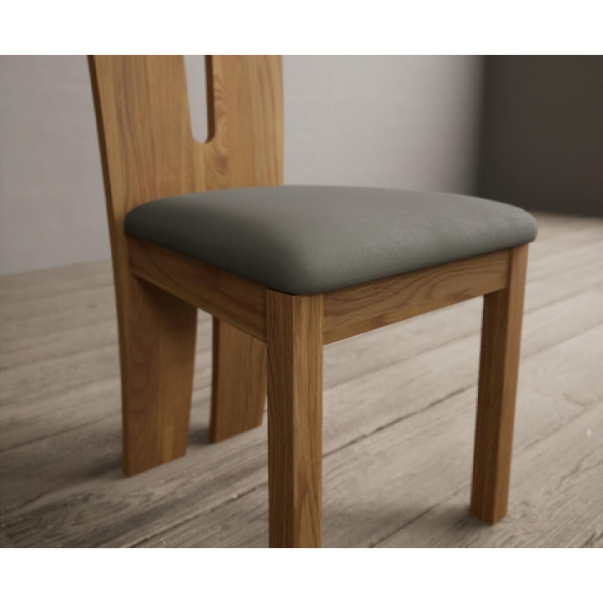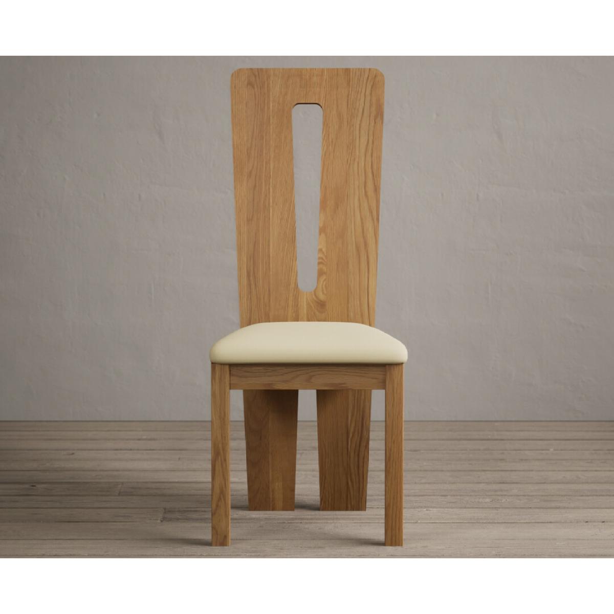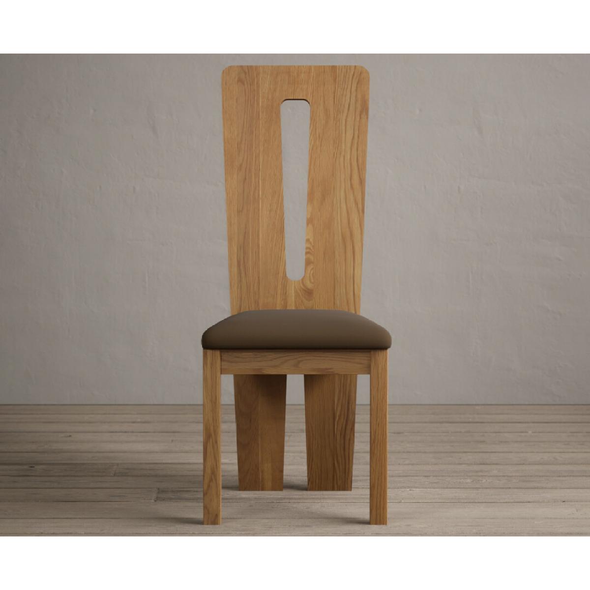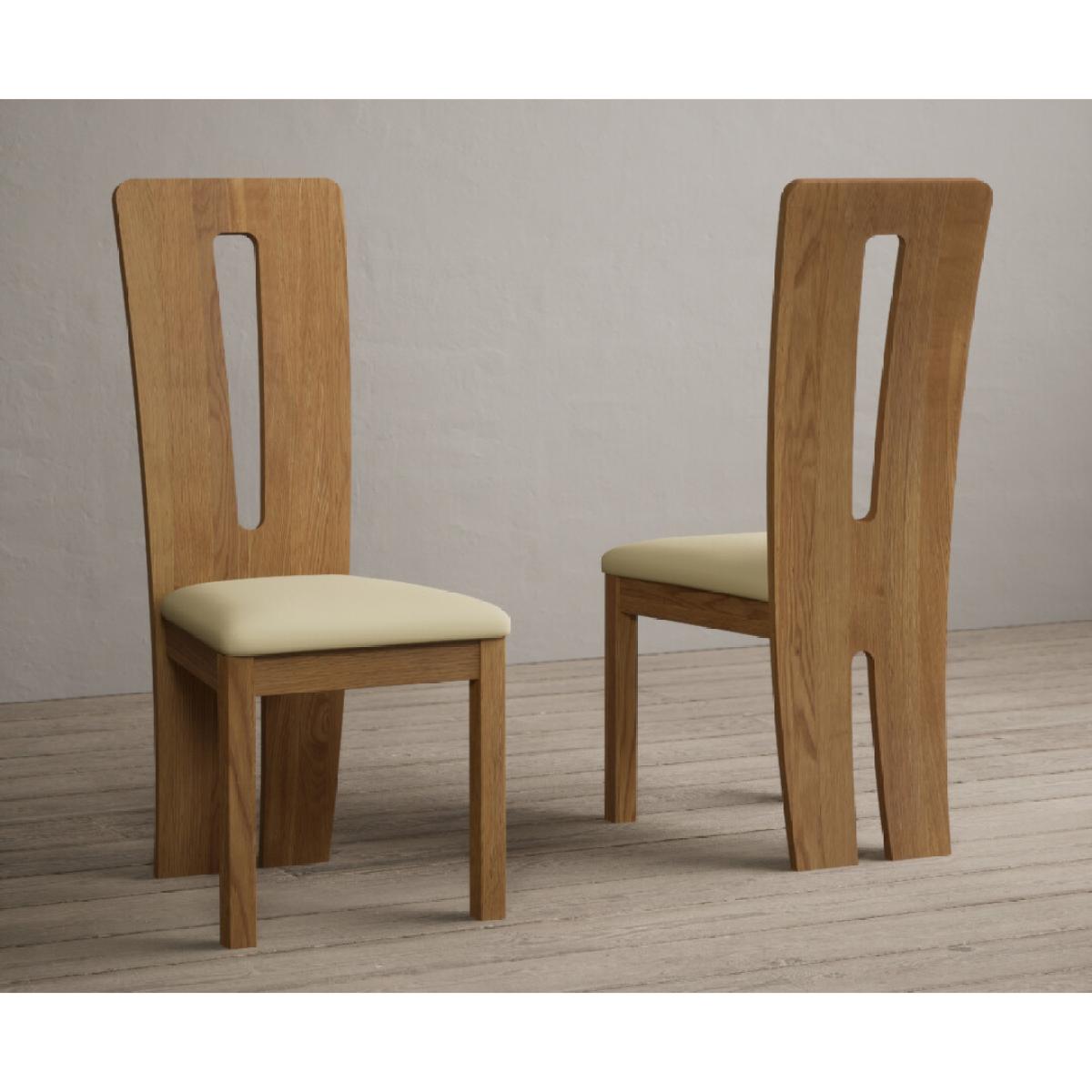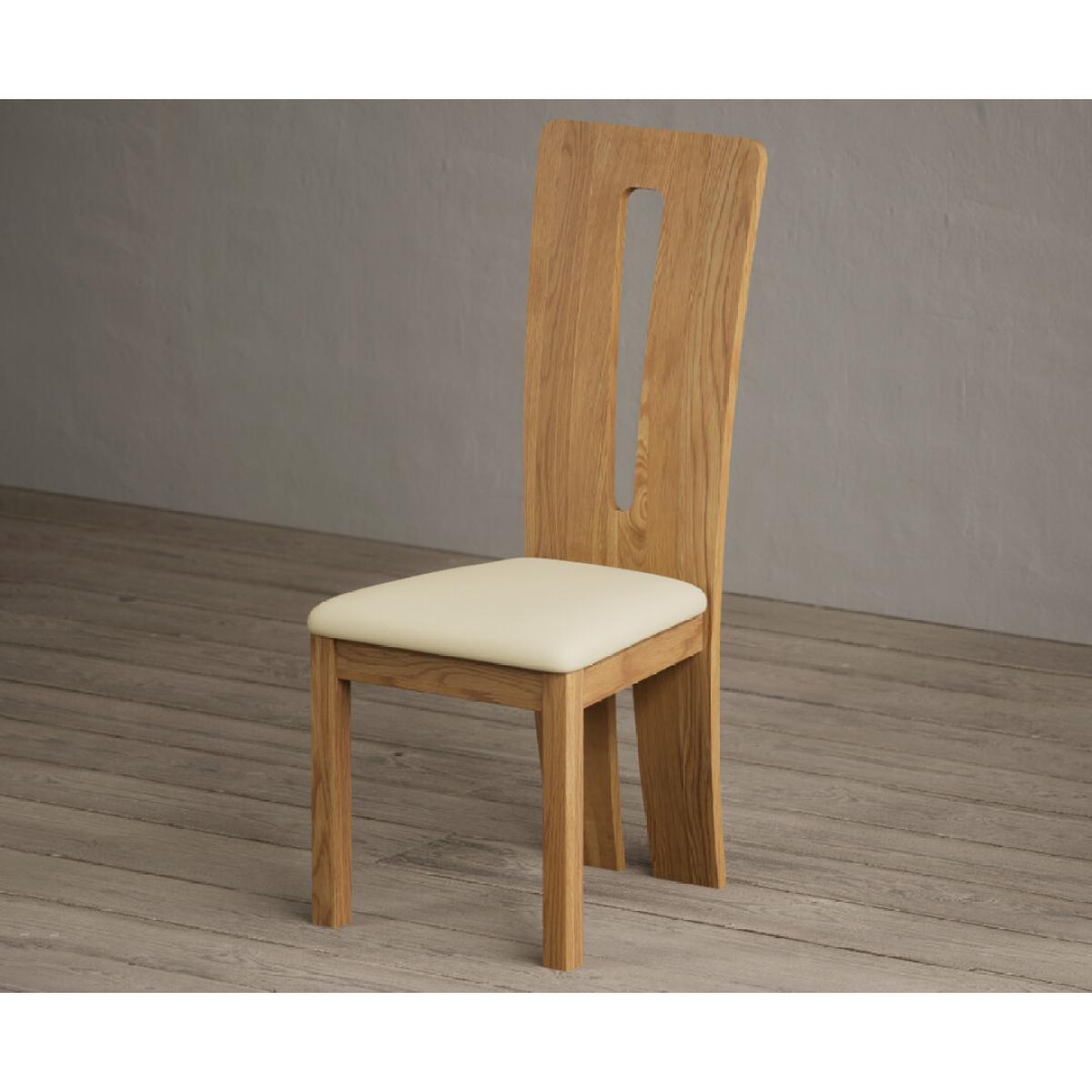The Lucca Solid Oak Dining Chairs with Faux Leather Seat Pad are crafted from 100% solid oak, with a curved floor-length backrest with a cut-out design and faux leather seat pad.