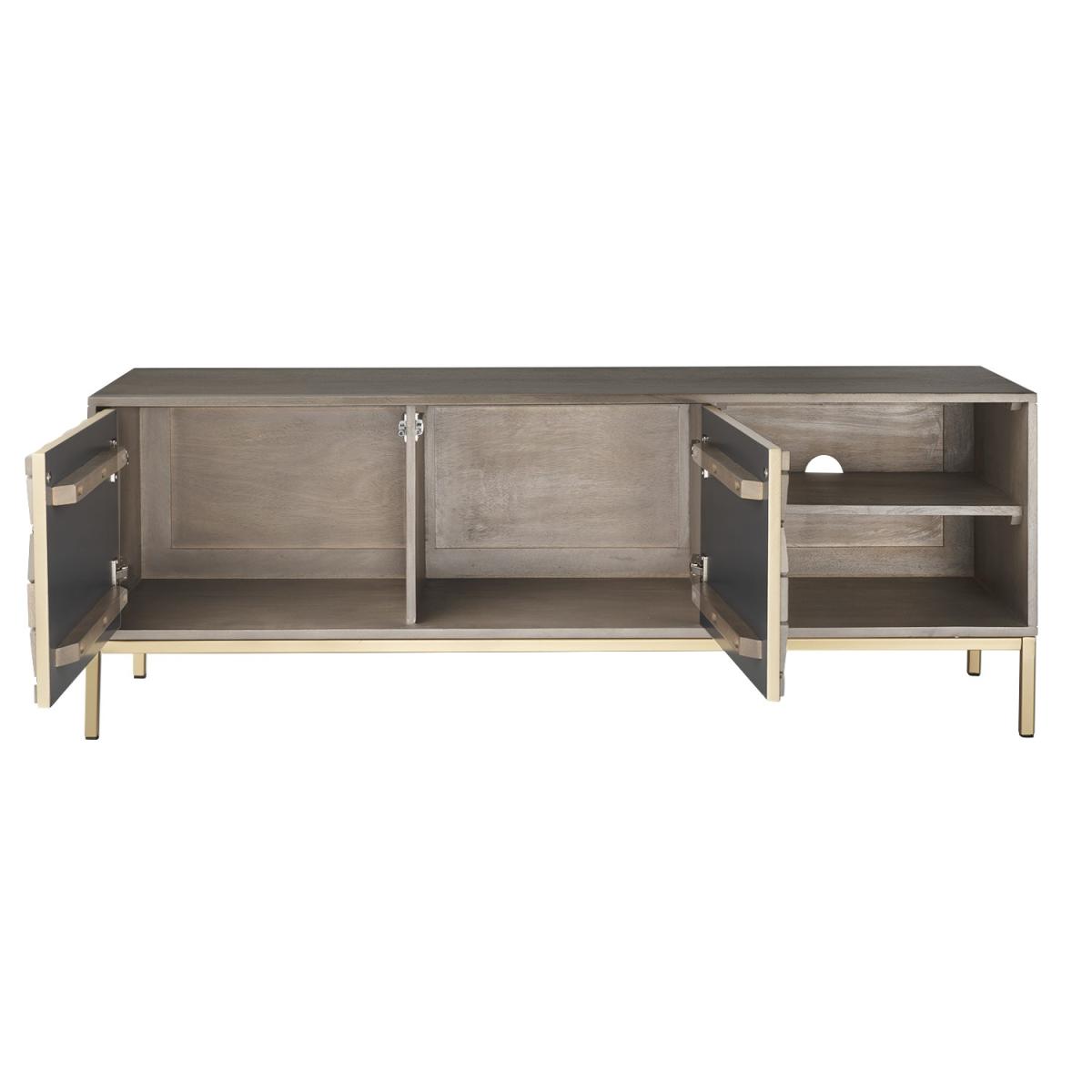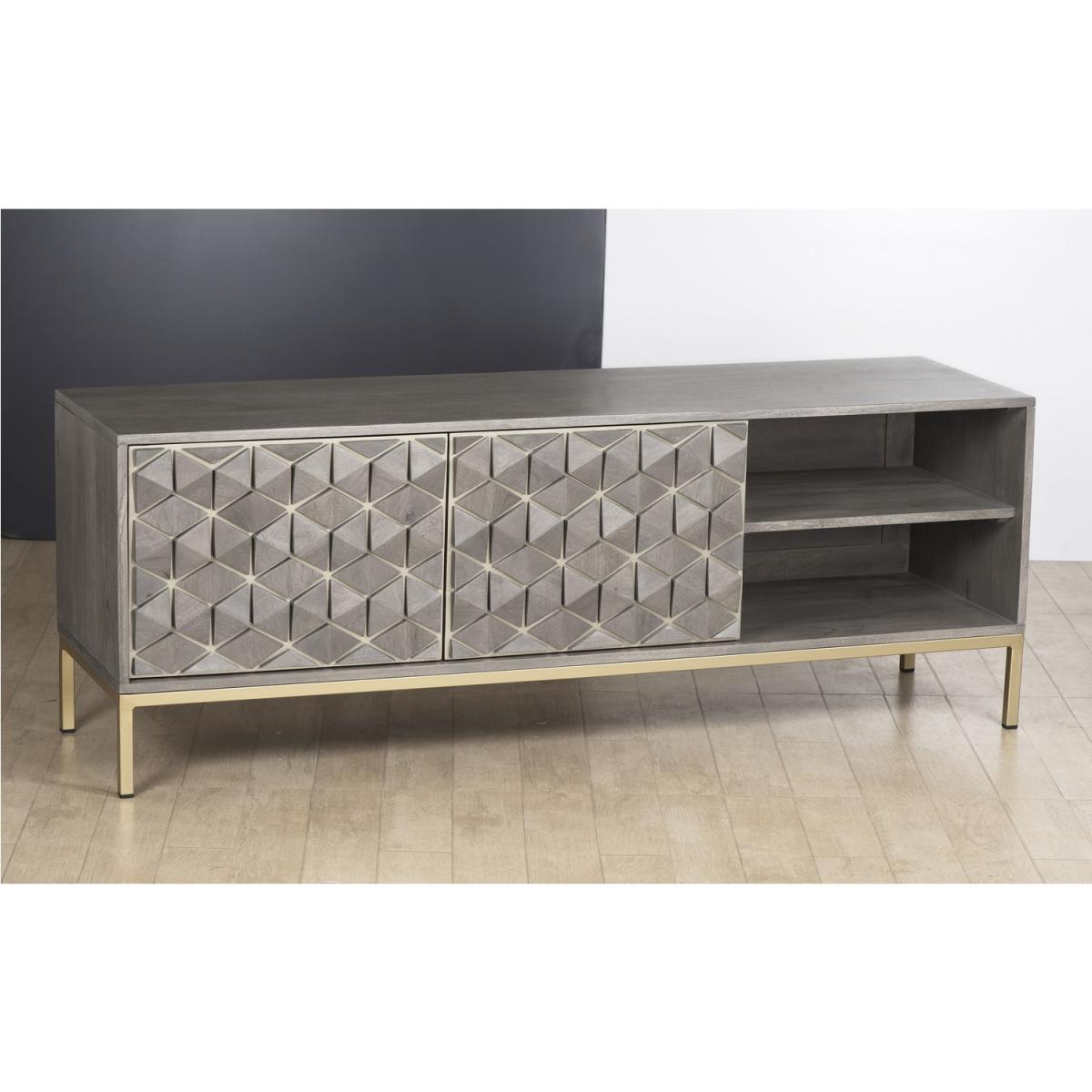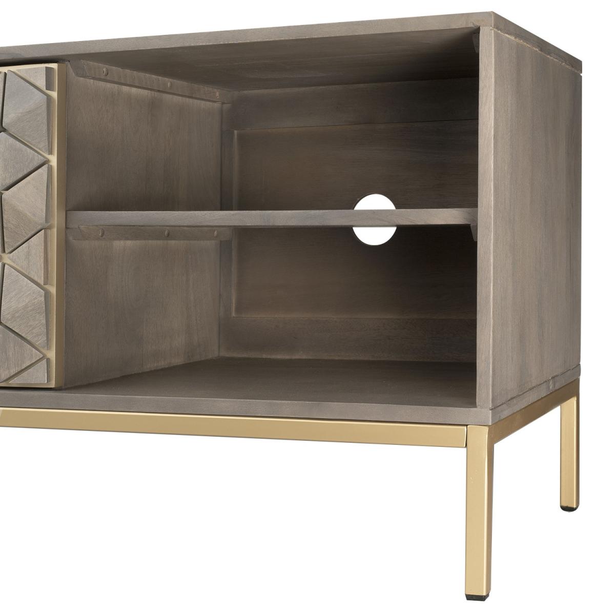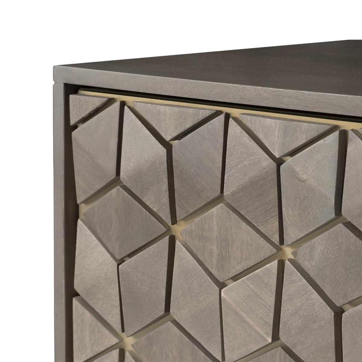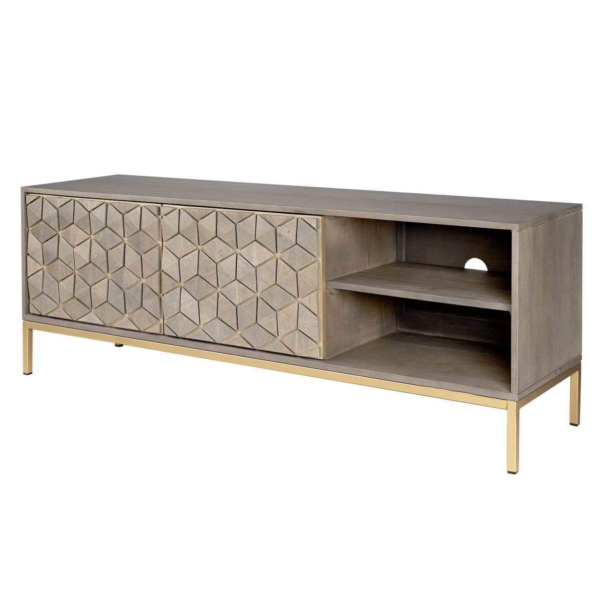 TheAlice collection of occasional furniture adds a stylish touch to your home as this stunning range offers some exquisite hand carved pieces that are not only unique in design but also beautifully executed. Made of natural mango wood with yellow tones, each Alice piece is unique and varies slightly in shade. Mango is the choice of wood which lends itself well to the intricate pattern, stained in a grey wash the natural features of this hardwood shine through giving each piece its one-off status. Enhanced by the gold tone on the legs and handles. Includes rear hole for cable managment.