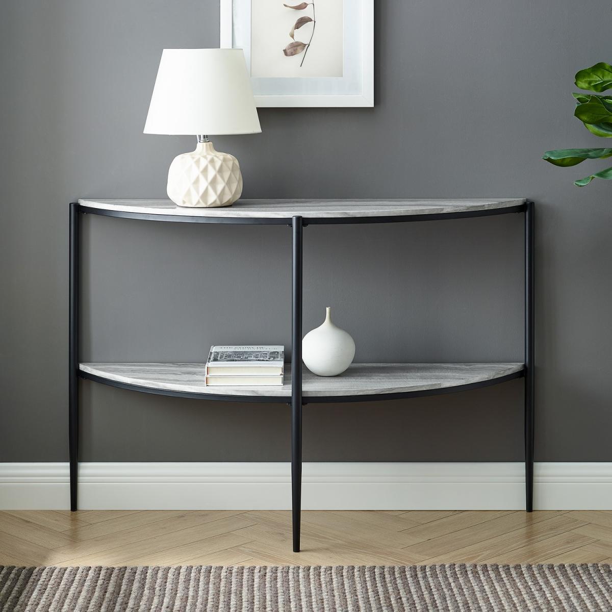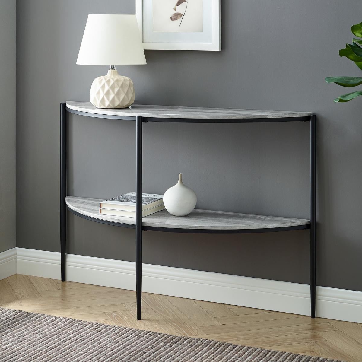 Small-space living is made modern and sleek by this half-circle entry table. The two spacious shelves lend surface space to house your keys, hats, scarfs or display décor or plants etc. Elegant, tapered legs help offer an instant contemporary upgrade to your home.