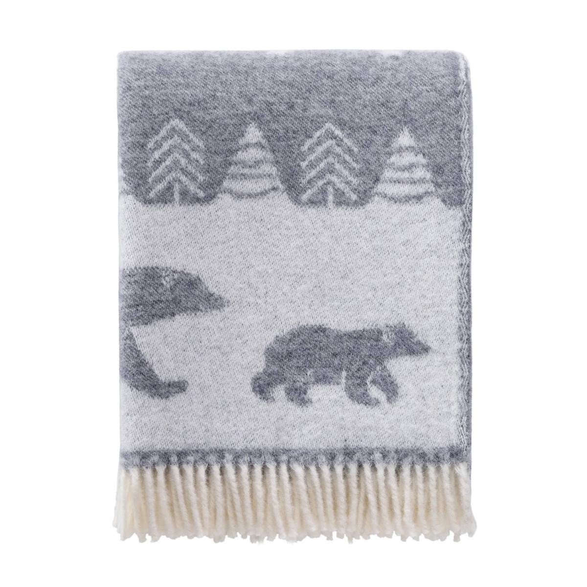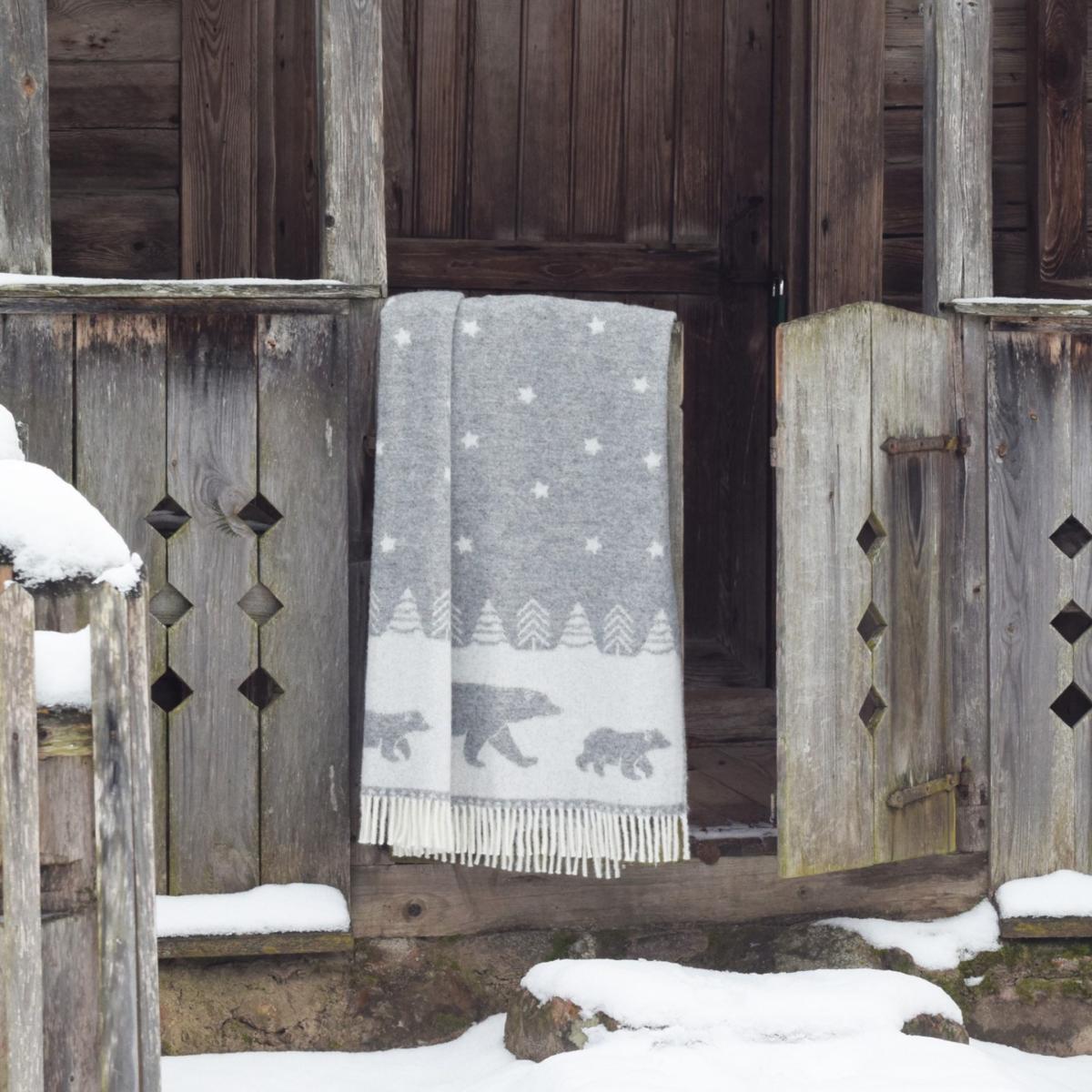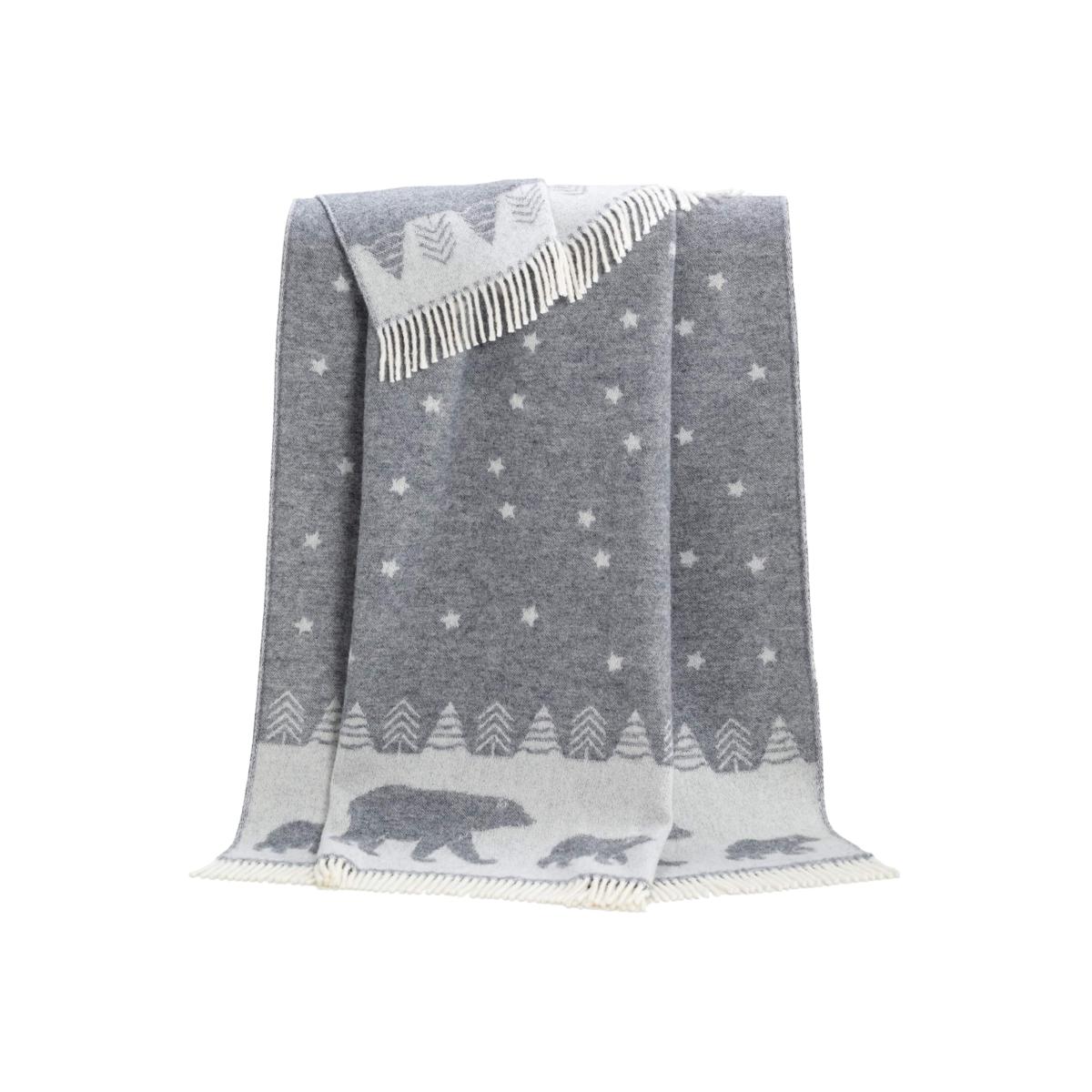 A throw woven in a soft grey colour scheme, with a fringed edging to perfectly frame the design. This family of bears walking through a winter wonderland is reminiscent of a storybook cover! Made from 100% wool, you may be forgiven for mistaking this for a warm hug when you wrap yourself up in it! A perfect addition to that reading snug by the fireplace this winter.