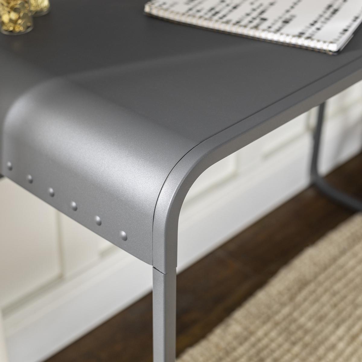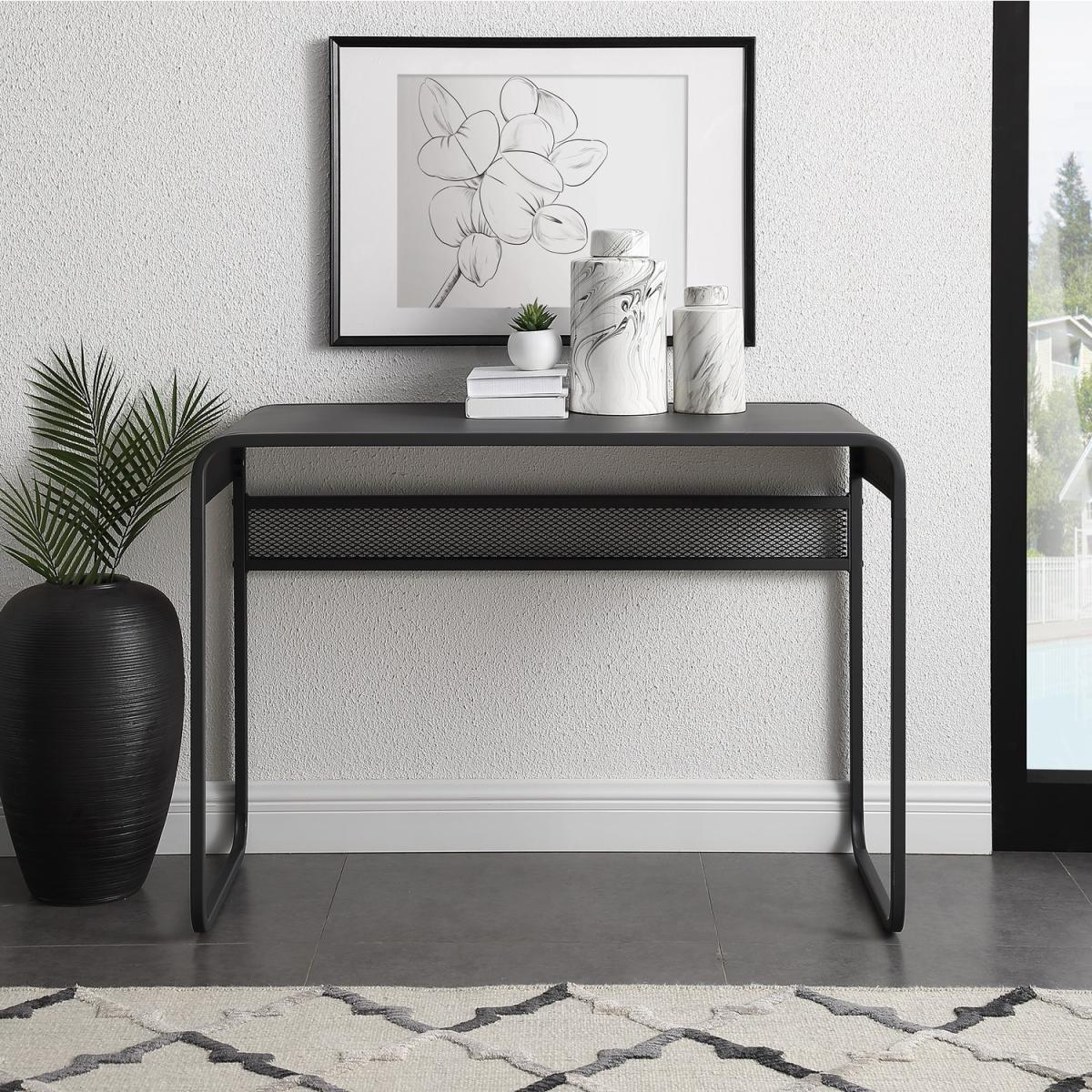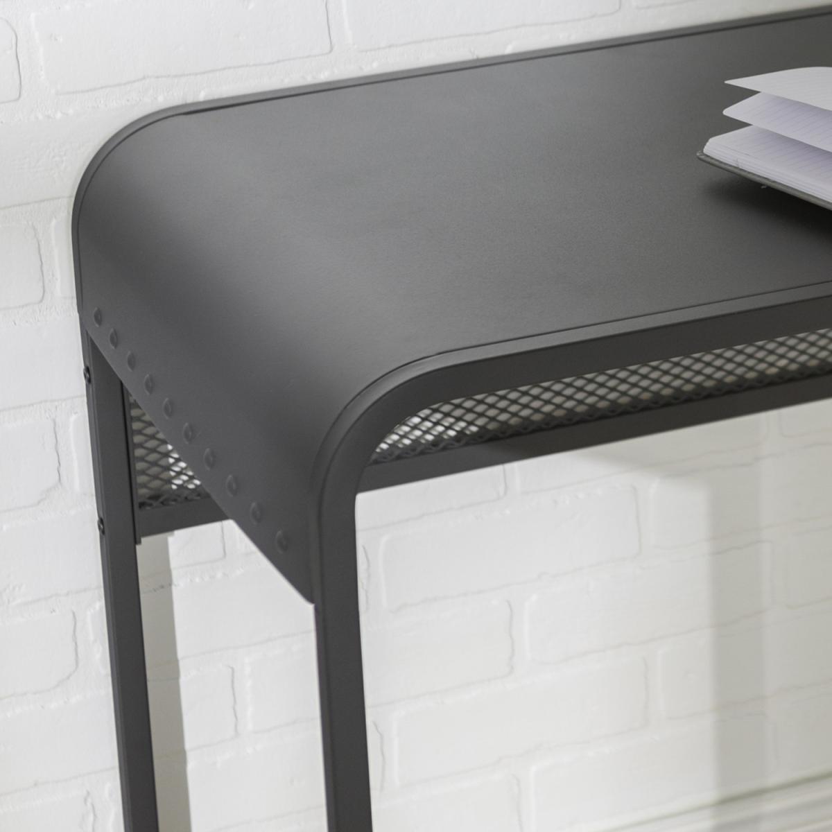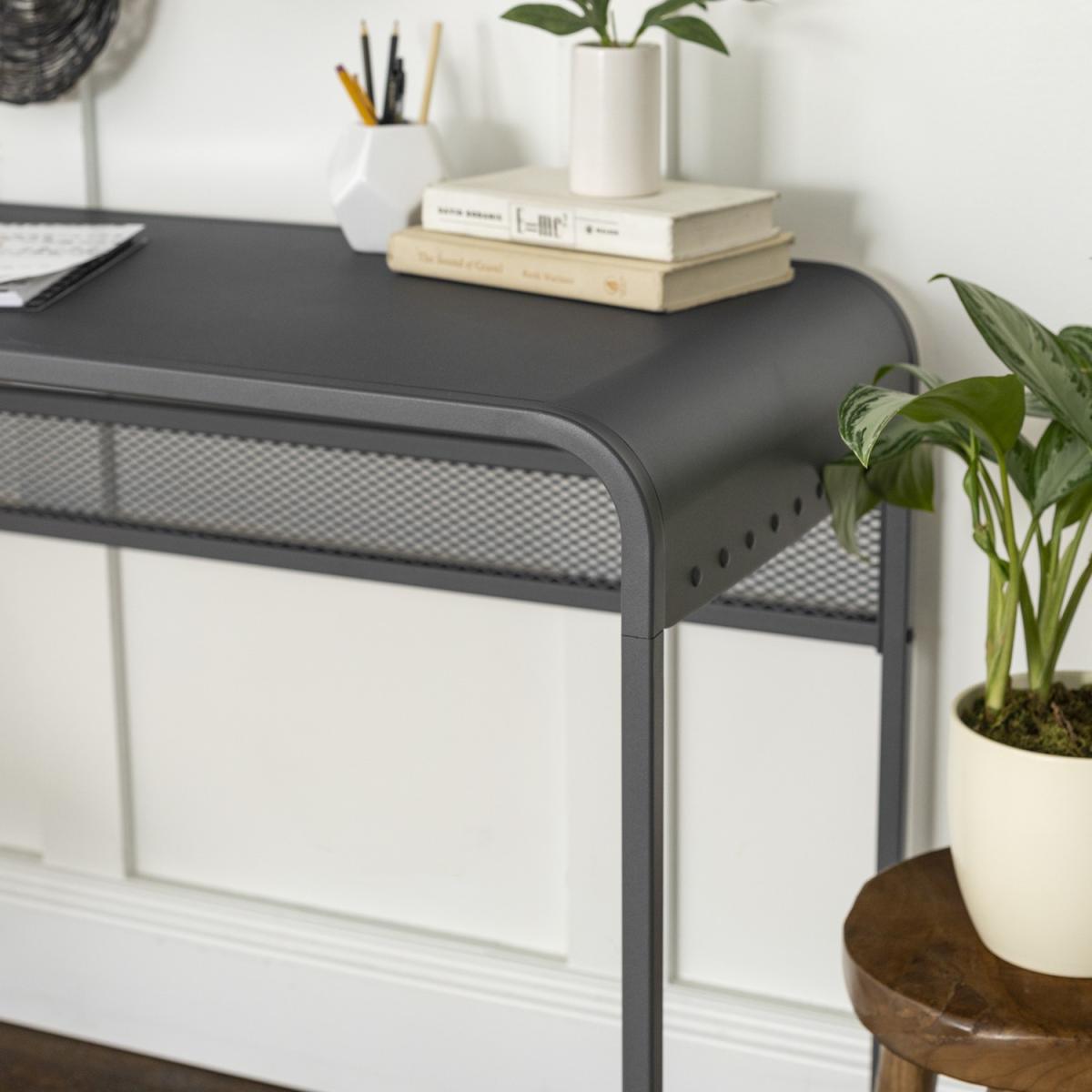 The simplicity of this desk makes an ideal workspace for anything from writing to working on your computer. The smooth curving of the design combined with the rectangular mesh back panel and overall metal composition, create a more modern approach to an urban industrial piece. For the teens in your home or adults, as this can easily fit into most small spaces, from a bedroom, dorm room, to an office. The open space underneath gives you plenty of leg room and a place for storing your work essentials in bins or a cabinet.