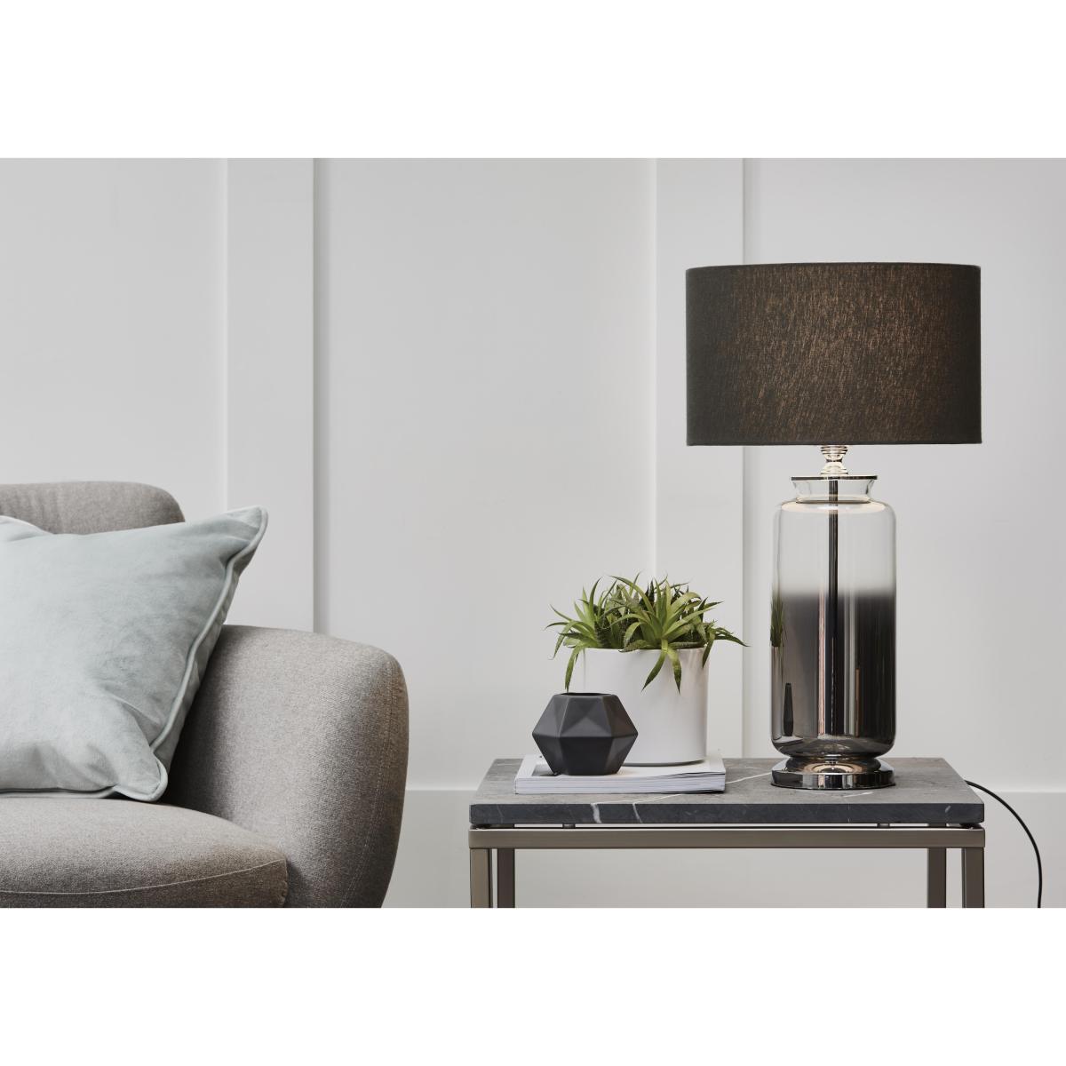 Add chic elegance and beautiful mood lighting to your living space with the Grey Ombre glass table lamp. This beautifully stylish contemporary glass table lamp has a vase like base with an ombre finish rising from grey to clear. The lamp is finished with a grey cylinder shaped shade. Elegant lamp with an ombre glass base. Ombre finish goes from grey to clear. Cylinder shade in a dark grey colour. Lovely in the living room, hall or bedroom. Suits both classic and contemporary interiors. Dimensions. Width: 30cm (12 in). Height: 52cm (20 in).