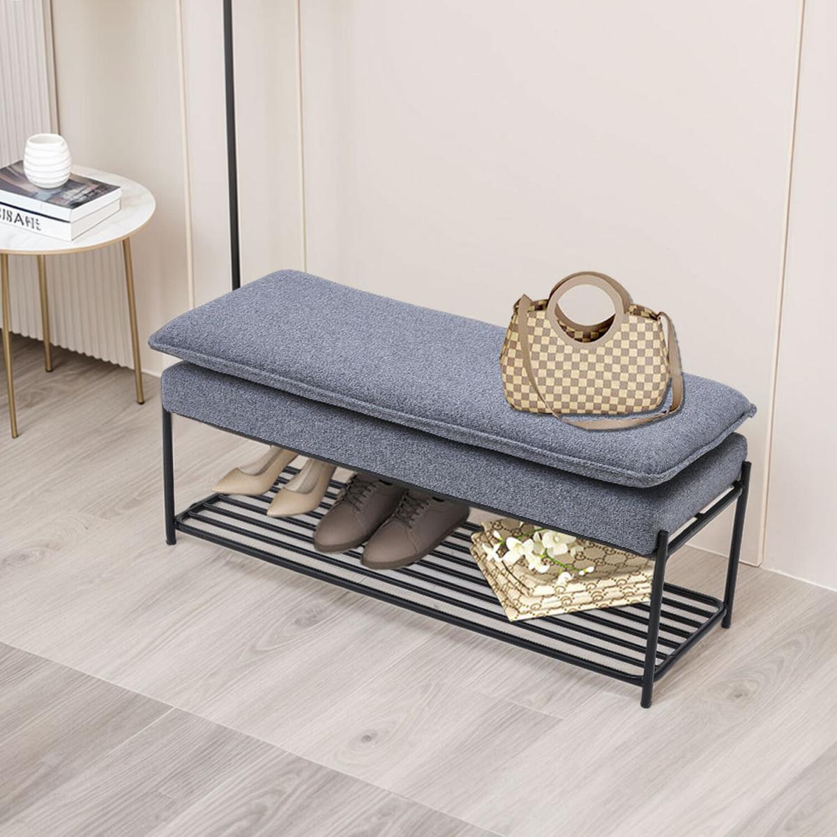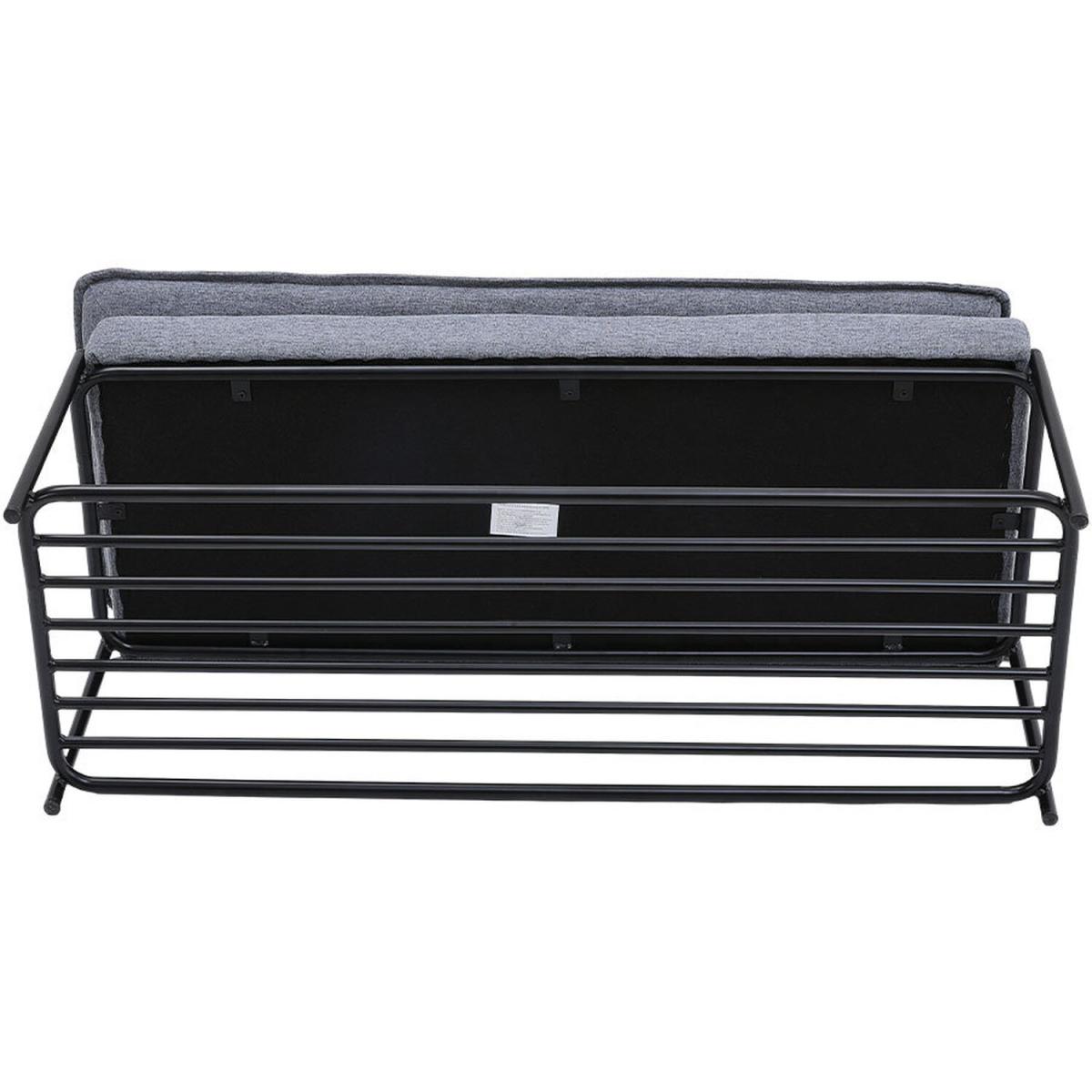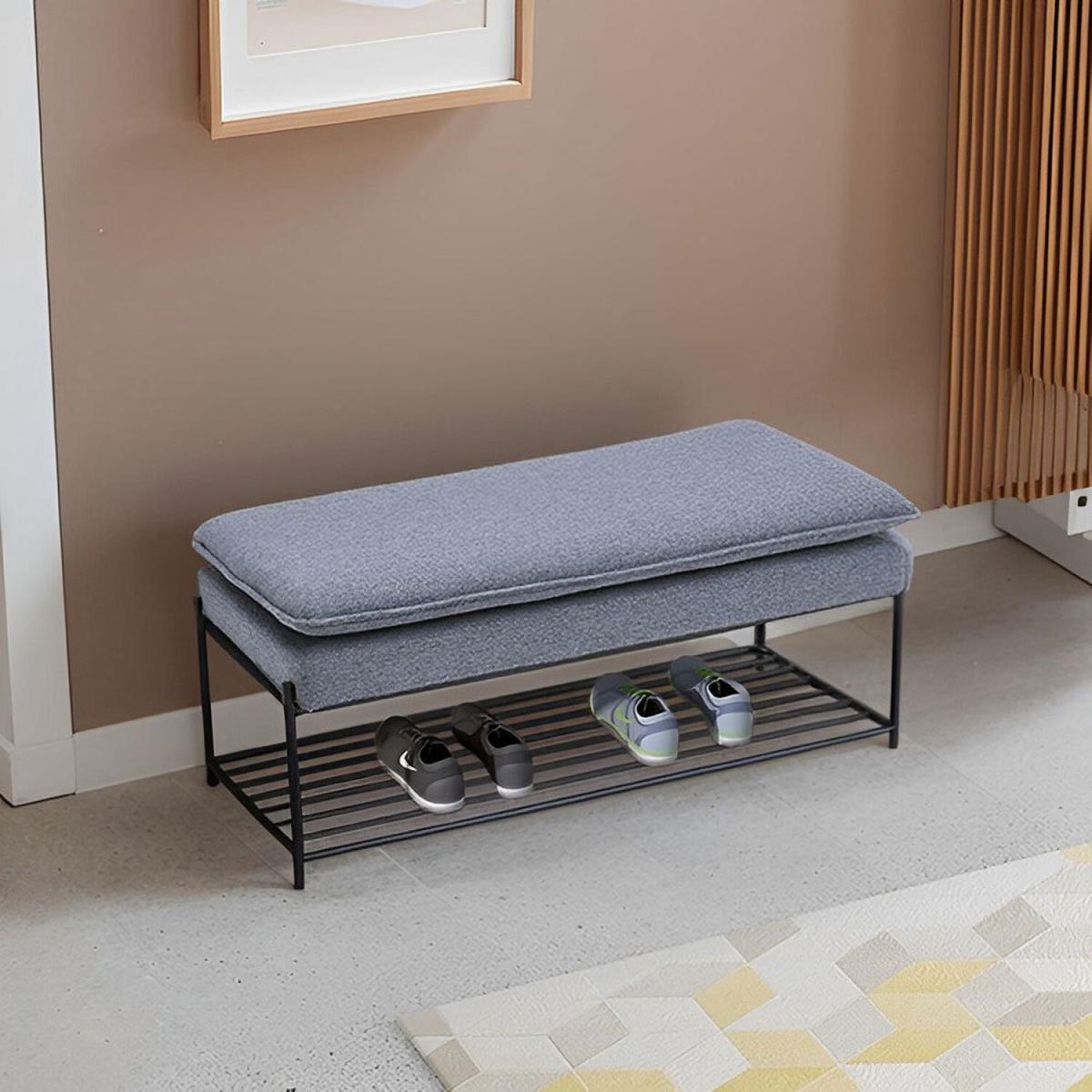 Fall in love with the contemporary style and comfort of the Grey Padded Shelf Bench by Livingandhome. This bench features a strong metal frame for stability and a cushioned seat upholstered in a chic grey fabric for added comfort. The integrated lower shelf provides a convenient spot to store shoes, baskets, or other items, making it an excellent addition to your entryway or hallway.