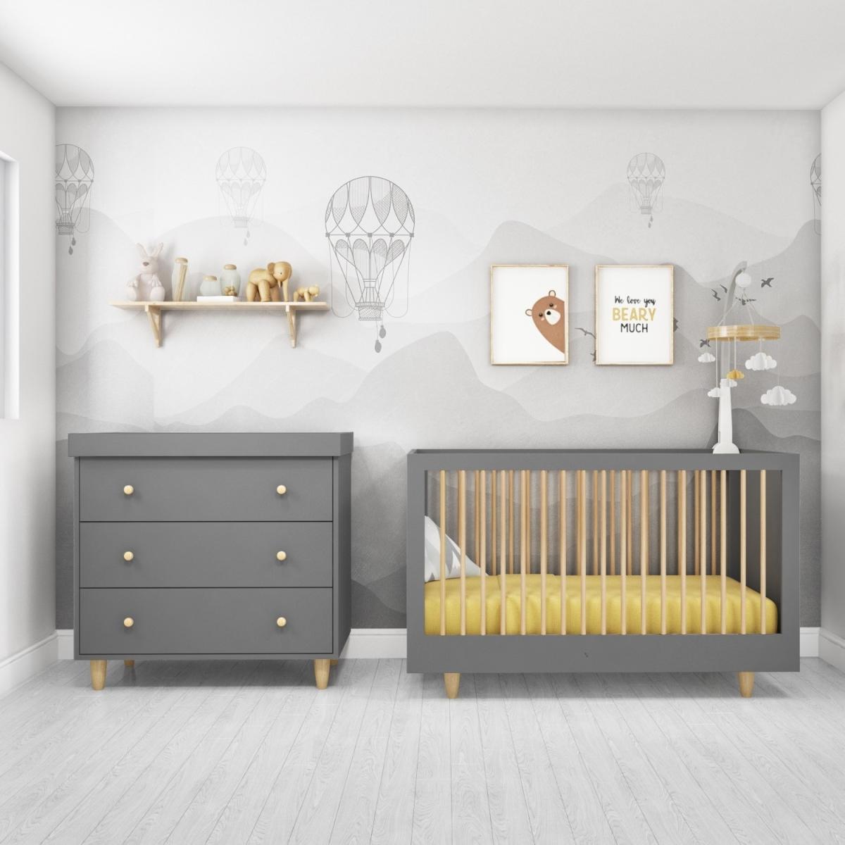 Features we love Scandi inspired nursery set that grows with your child Cot converts to junior bed up to approx. six years old. Three cot base heights make it easy and accessible. Remove the changing tray to transform into a dresser. The three drawers offer plenty of room to store items. Grey finish with contrasting pine handles and legs. Made from sustainably sourced New Zealand Pine Need to know. Cot bed. Packaging dimensions. Box 1 W46 x D82 x H11 cm / Box 2 W75 x D148 x H11 cm Packaging weight. Box 1 15.5kg / Box 2 21 kg Product dimensions. W75 x D148 x H91.7 cm Product weight. 36.5kg Bed mattress size. 140 x 70 cm Bed base. Wooden slatted Age range. 0+ to approximately 4 years old Changing station. Packaging dimensions. Box 1 W68 x D111 x H17 cm / Box 2 W53 x D105 x H18 cm Packaging weight. Box 1 36.5kg / Box 2 28 kg Product dimensions. W102 x D57 x H98.5 cm Changing space dimensions. W98.4 x D53.4 x H6.5 cm Inner drawer dimensions. W89.6 x D43.5 x H16 cm Number of drawers. 3 Product weight. 64.5kg Includes. Anti-tilt strap for the wall Age range. 0+ to approximately 12 months More info. Colour. Grey and natural pine Finish. Painted and natural Material. Solid pinewood For use. Indoors Assembly required. Yes Mattress included. No. Conforms to European safety standard EN 716 2008+A1 2013 and British safety standard BS 8509 2008+A1 2011 );.