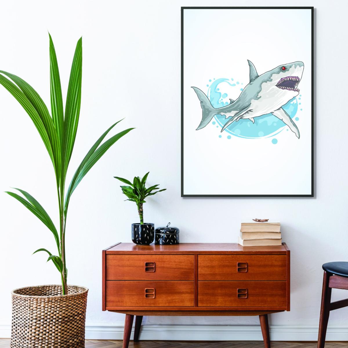 I really like the shark print for adding a touch of humour and personality to a space. It works particularly well in contemporary or eclectic interiors, especially in kids’ bedrooms, playrooms, or even a quirky office corner. The grey tone allows it to blend seamlessly with neutral palettes or monochrome schemes, making it versatile without overpowering the room. For styling, consider pairing it with minimalist furnishings or simple colour accents to let the artwork stand out. Hanging it at eye level with a slim frame keeps it looking modern and clean. Overall, this piece is great for injecting a fun, lighthearted vibe-just make sure it complements the existing colour scheme and mood of your space.