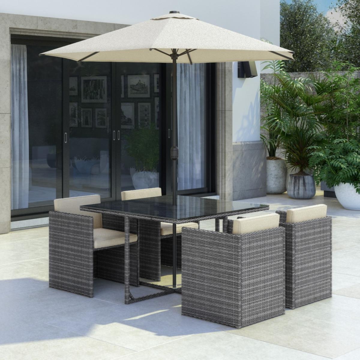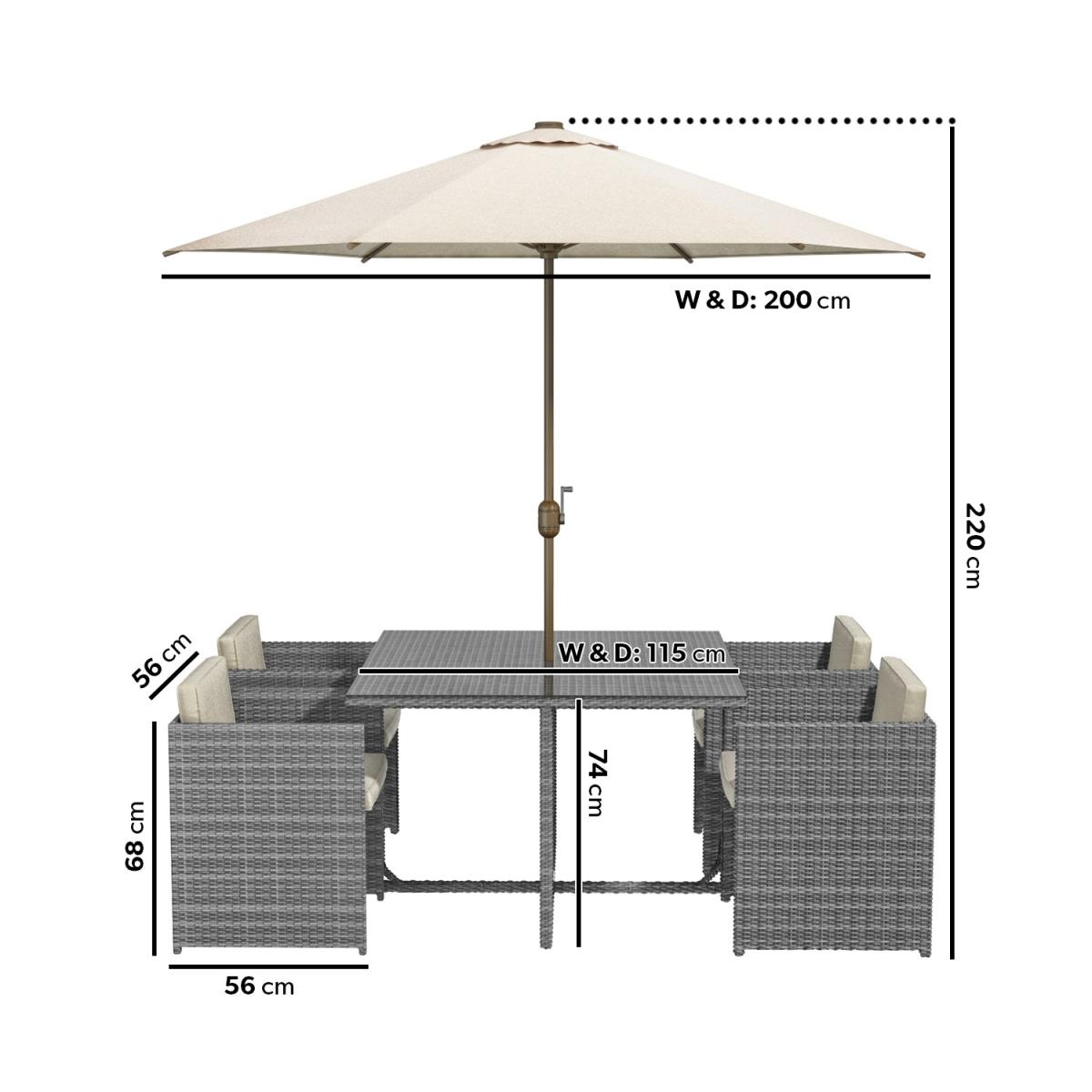 Features we love Compact cube dining set for outdoor dining and relaxing. Includes 4 chairs dining table and parasol with cover. Made from synthetic weather-resistant handwoven rattan. Tempered glass tabletop with sucker cups ensures stability. Chairs complete with wipe-clean back and; seat cushions All about me. Enjoy garden dining with our stylish 4-seater cube dining set. It’s a versatile option thanks to its compact design; once you’ve finished dining or lounging the seats can be tucked neatly underneath the table to form a tidy cube shape saving you on garden space. In addition it includes a parasol with an easy crank mechanism to protect you from sun and light showers. It slots easily in the table’s central parasol hole so there’s no need to worry about securing a freestanding one. Made with UV resistant water-proof rattan; it'll make a durable addition to your garden. Enhance the life of your garden furniture-. This product has been designed to be used outdoors. To make the most of your furniture we recommend that you store it indoors move it in a sheltered position or protect it by covering it up in bad weather and over the winter period. Why not invest in one of our garden stores super handy if your furniture comes with any upholstery (cushions) which must always be kept dry. Need to know. Table dimensions. H74 x W115 x D115 cm Chair dimensions. H68 x W56 x D56 cm Parasol dimensions. H220 x W200 x D200 cm Table top thickeness. 5mm Colour. Grey mix and cream (upholstery / parasol) Finish. Rattan and upholstery Material. Clear tempered glass (tabletop) synthetic rattan fabric (cushions / parasol) and powder-coated steel (frames) Seats. 4 people For use. Outdoors Assembly required. Yes Due to the hand-woven rattan finish each piece will feature slight variations in colour and pattern. What's in the box? 1 x Table4 x Chairs1 x Parasol1 x Parasol cover.