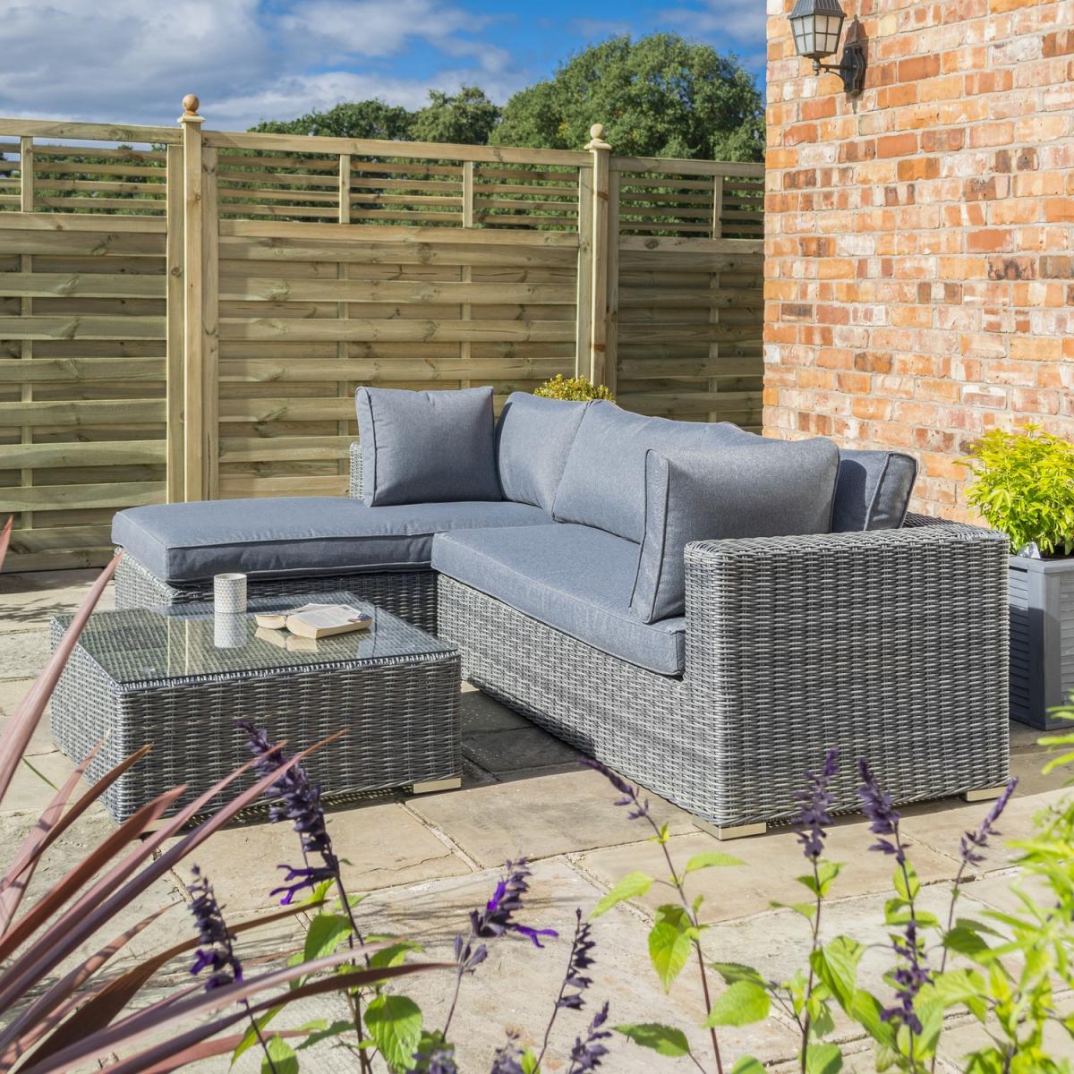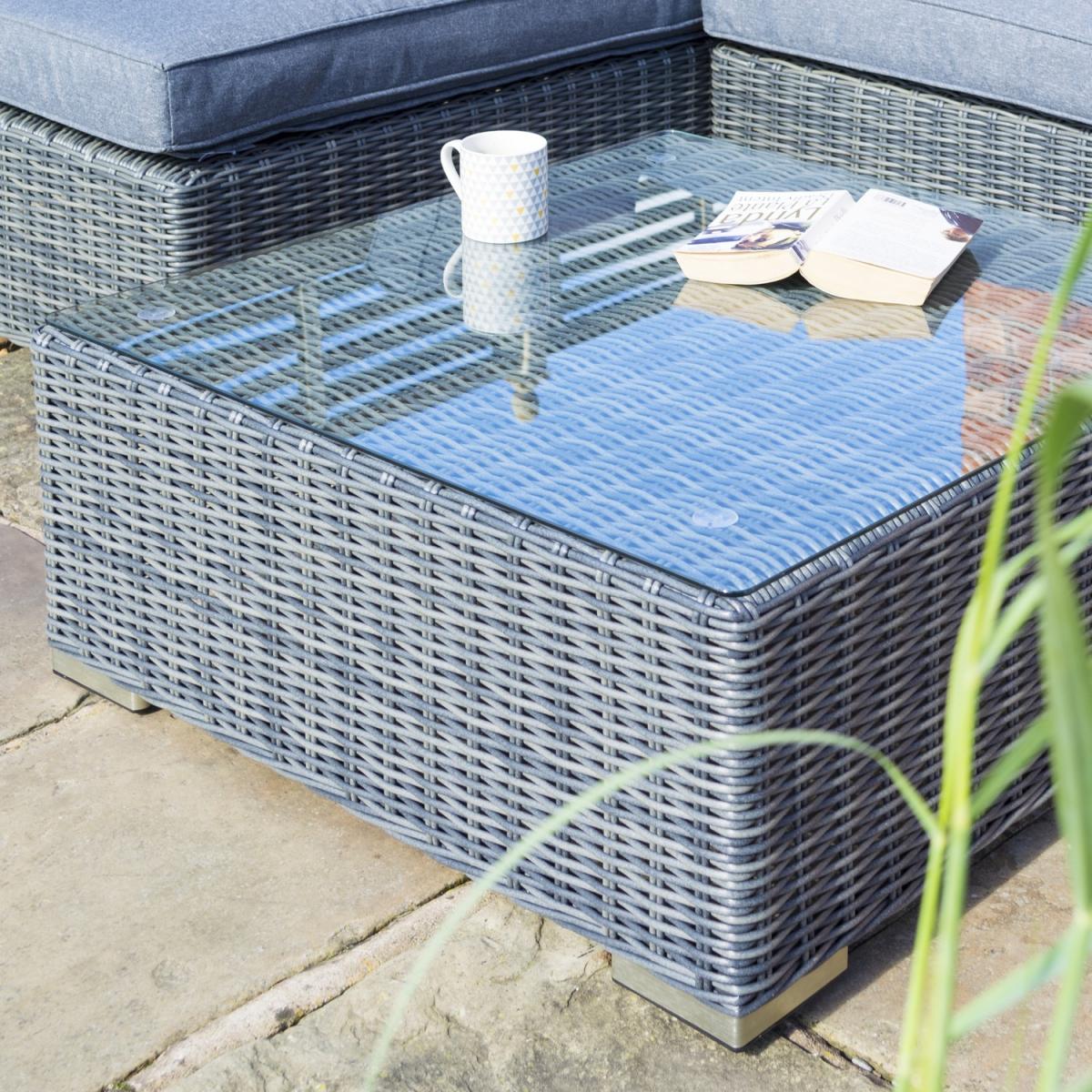 Dimensions H32 x W80 x D80 cm Please note We are unable to deliver to Ireland The Vienna Lounger Set is finished in grey weave and grey cushions. Features. Table dimensions Height 320mm / Width 800mm / Depth 800mm. Sofa dimensions Height 740mm / Width 2400mm / Depth 1600mm. Three piece set. Weatherproof rattan effect weave. For indoors or outdoor use. Powder coated aluminium frames6.5mm half round wicker Glass top table cushions and seat pads included. Assembly required..
