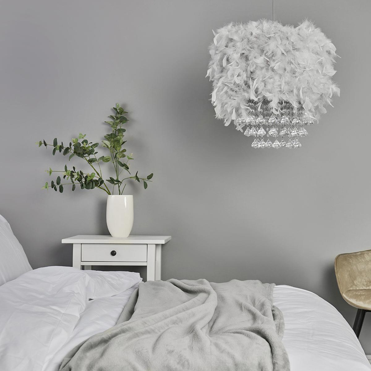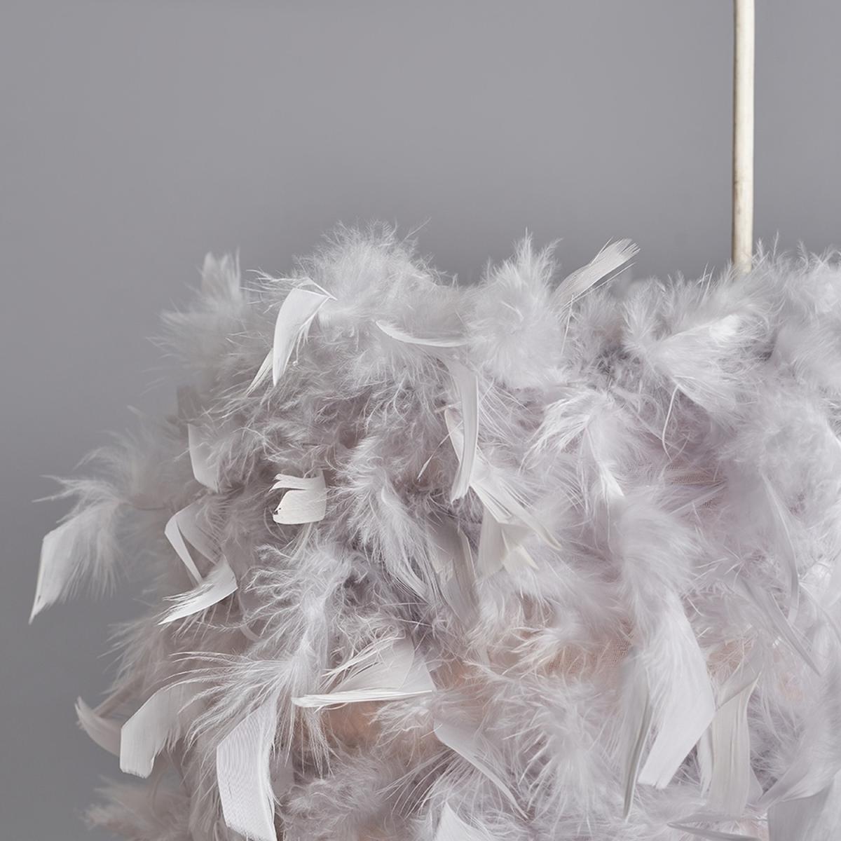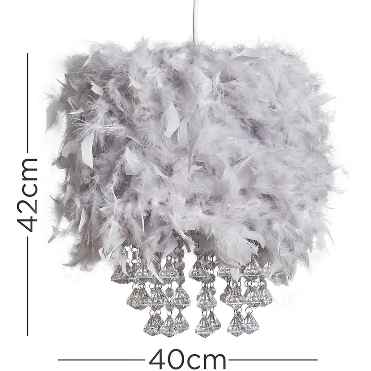 Modern cylinder shaped ceiling pendant light shade in a grey real feather finish with elegant clear acrylic droplets. This unique shade will become the main talking focal point of any room. The right fitting can make a real style statement and complete your living space look. Ideal for living rooms, bedrooms, dining rooms and hallways. Easily fits to your standard light socket - no electrical installation wiring required.