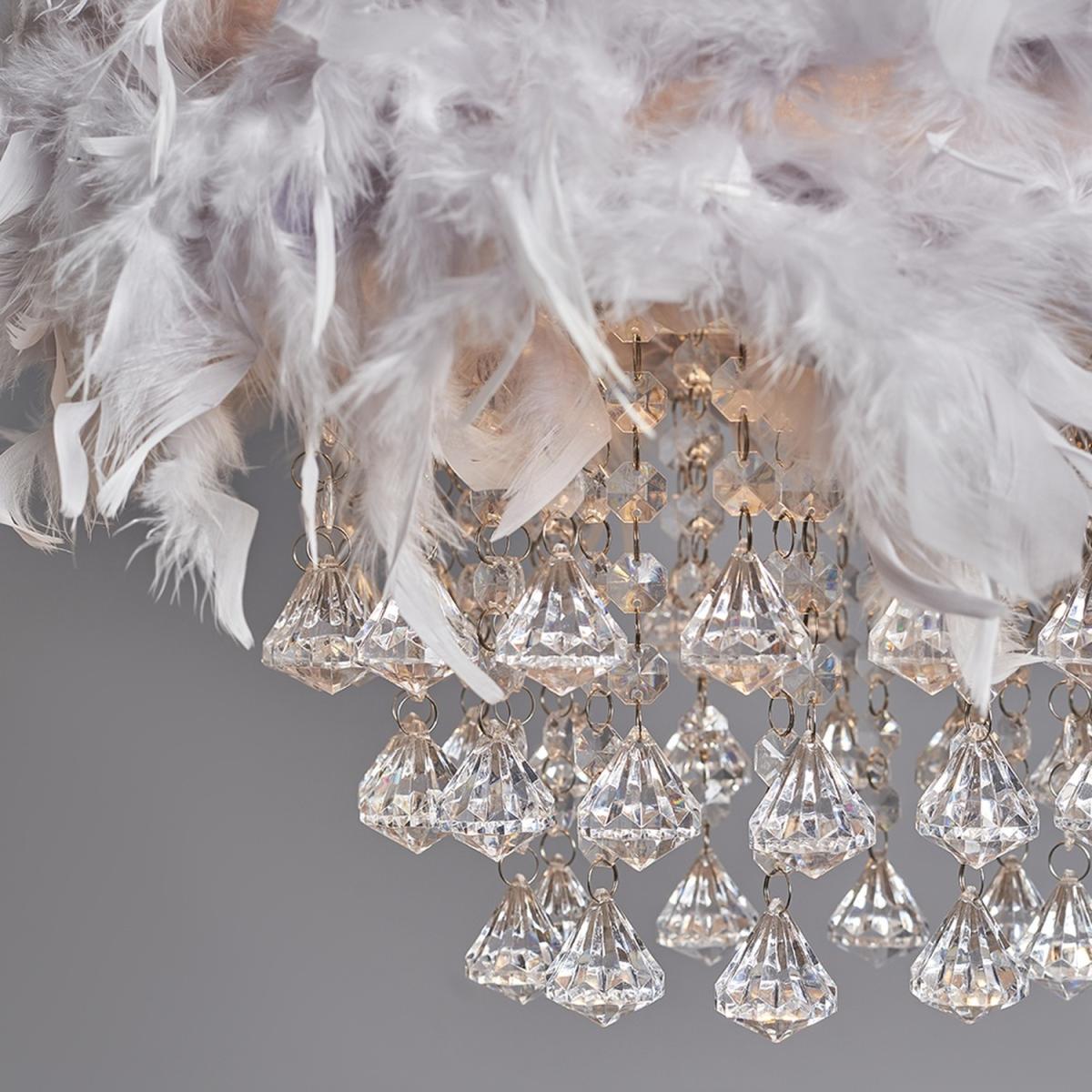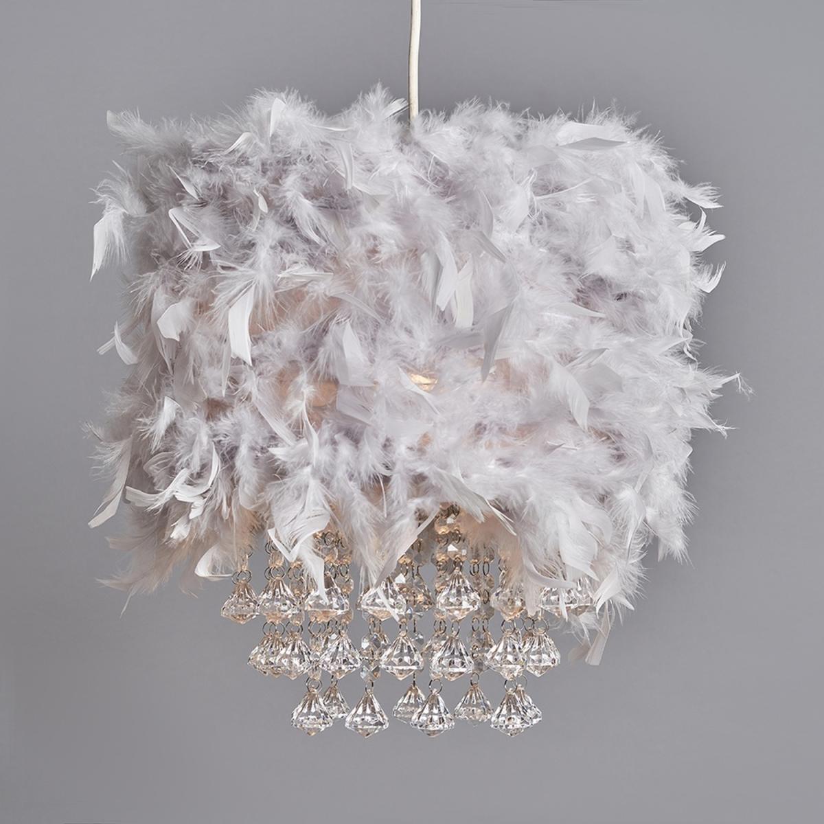 Grey Real Feather Drum Ceiling Pendant Light Shade With Clear Acrylic Droplets - Grey
