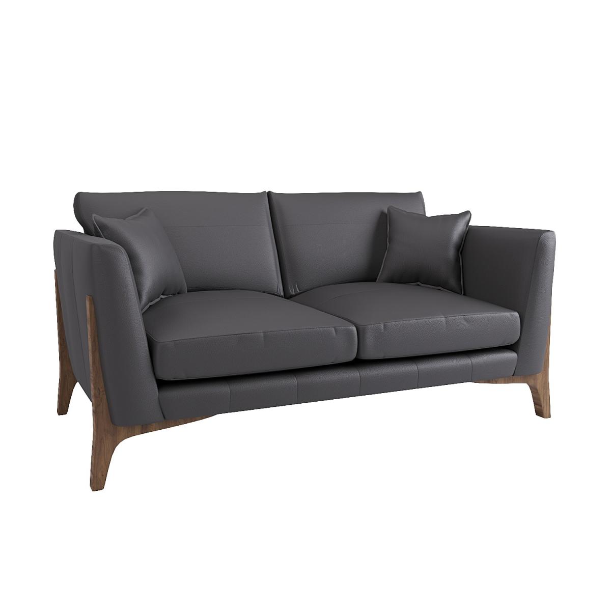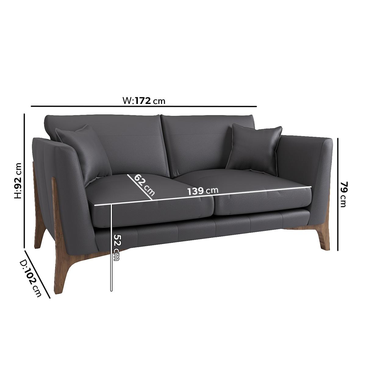 All about me Introducing our mid-century Adley two-seater leather sofa. With clean lines, plump cushions, angled arms and crafted with a beautiful combination of natural walnut wood and sustainable leather upholstery. The extended walnut wood legs showcase its sophistication and add a modern edge. The back cushions are secured with zips to prevent them from slipping down, and the seat cushions can be detached from the sofa for regular plumping to keep their shape. The innovative and award-winning foamflex seat interior and fibre-filled backs make for a durable and truly comfortable seat. Above all, its versatility and hard-wearing design would elevate any living space, and it's perfect for families. Need to know Dimensions: W172 x D102 x H95 cm Seat height: 52cm Colour:Dark grey Finish: Upholstered, powder-coated (legs) Material: Hardwood frame, genuine leather fabric, fibre-filled backs, foamflex seat interior For use: Indoors (suitable for wooden floors) Product weight: 58.5kg Assembly required: Yes, just the legs to attach What is foamflex? It's the latest engineered foam seat interior designed to give you the comfort of fibre with the retention of foam.
