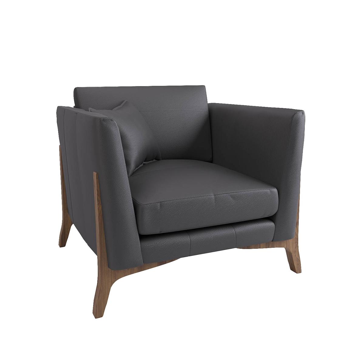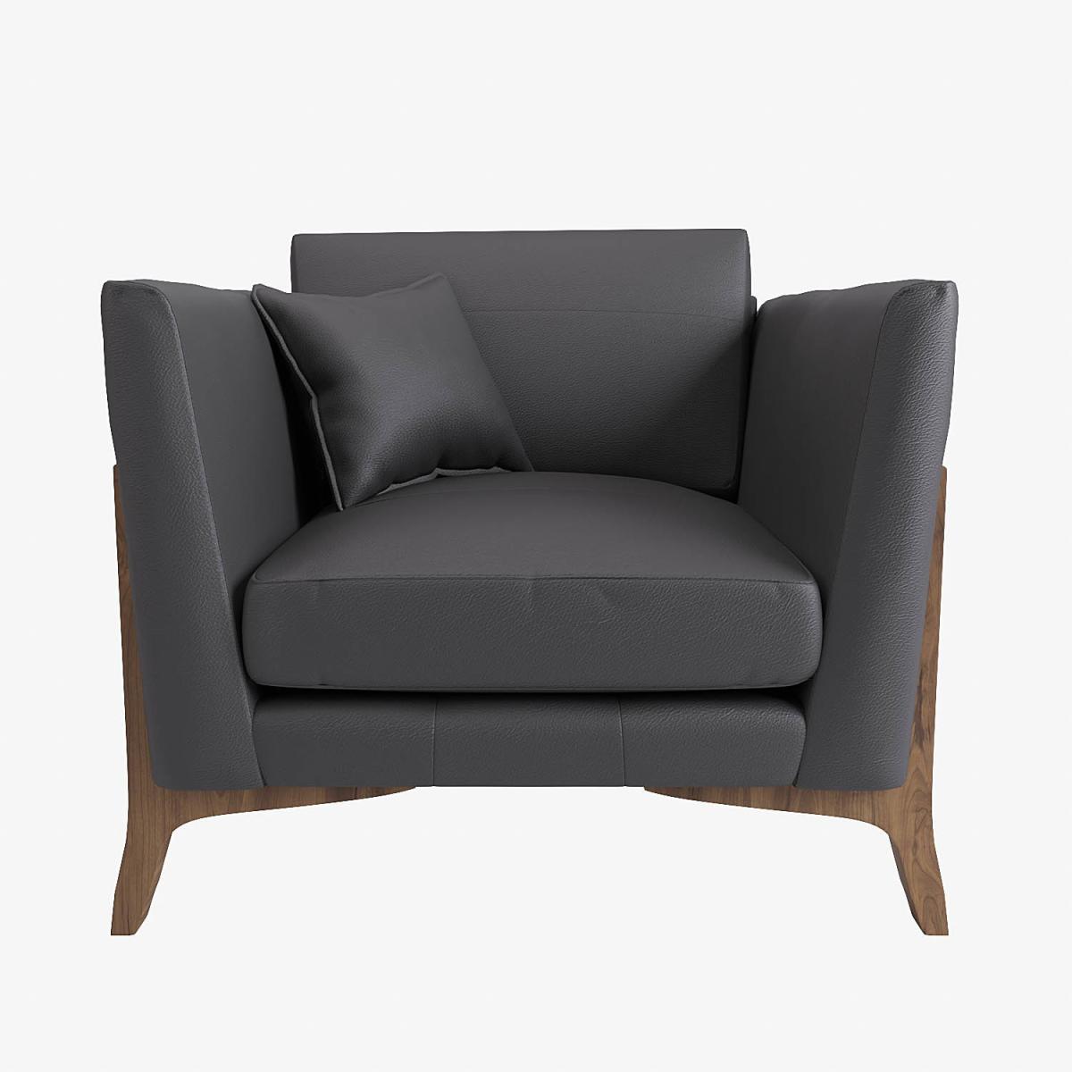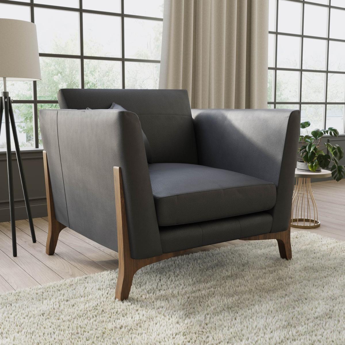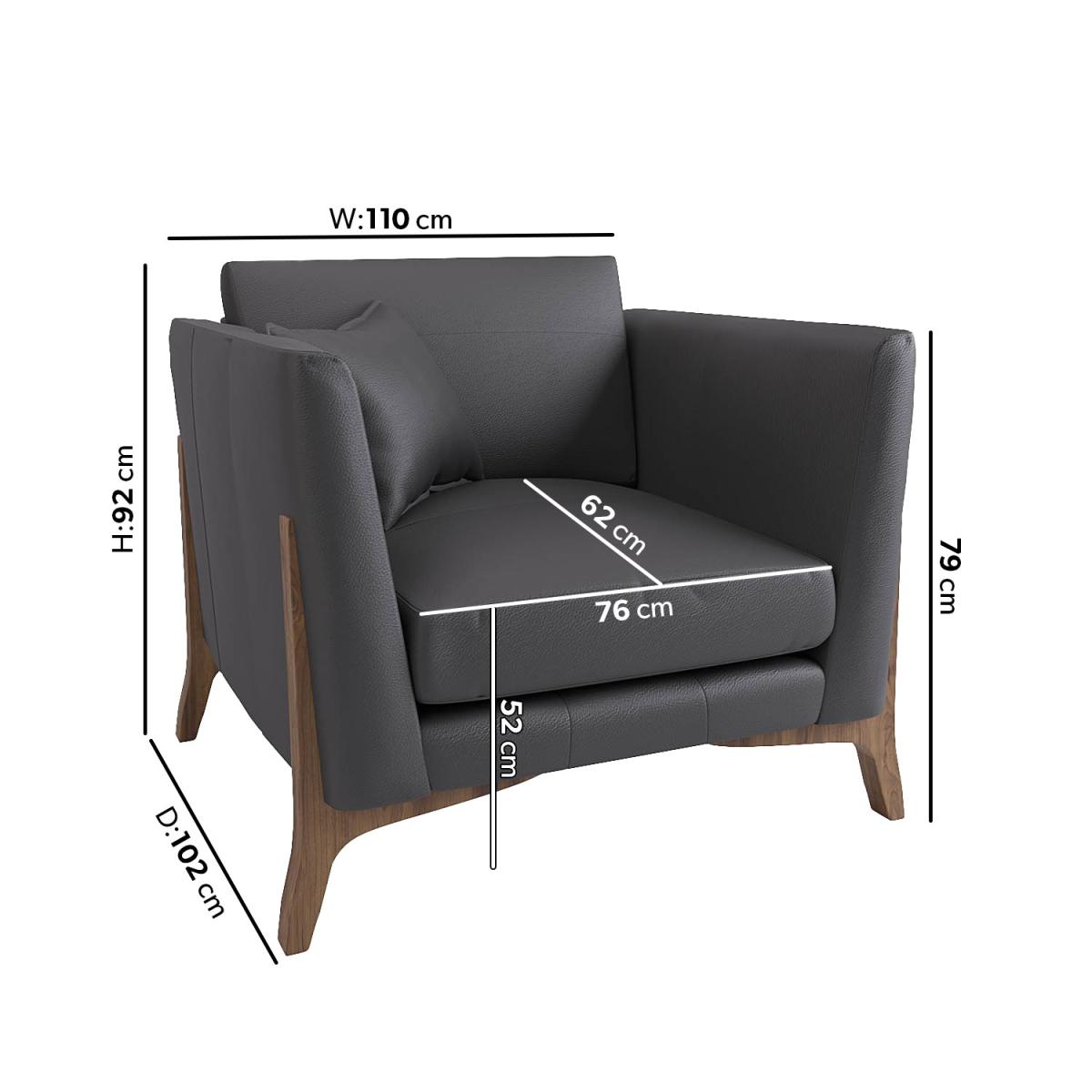 All about me Introducing our mid-century Adley leather armchair. With clean lines, plump cushions, angled arms and crafted with a beautiful combination of natural walnut wood and sustainable leather upholstery. The extended walnut wood legs showcase its sophistication and add a modern edge. The back cushions are secured with zips to prevent them from slipping down, and the seat cushion can be detached for regular plumping to keep its shape, making it perfect to lounge on. The innovative and award-winning foamflex seat interior and fibre-filled backs make for a durable and truly comfortable seat. Above all, its versatility and hard-wearing design would elevate any living space and ideal for family homes. Need to know Dimensions:W110 x D102 x H92 cm Seat height: 52cm Colour:Dark grey Finish: Upholstered, powder-coated (legs) Material: Hardwood frame, genuine leather fabric, fibre-filled backs, foamflex seat interior For use: Indoors (suitable for wooden floors) Product weight: 47.5kg Assembly required: Yes, just the legs to attach What is foamflex? It's the latest engineered foam seat interior designed to give you the comfort of fibre with the retention of foam.