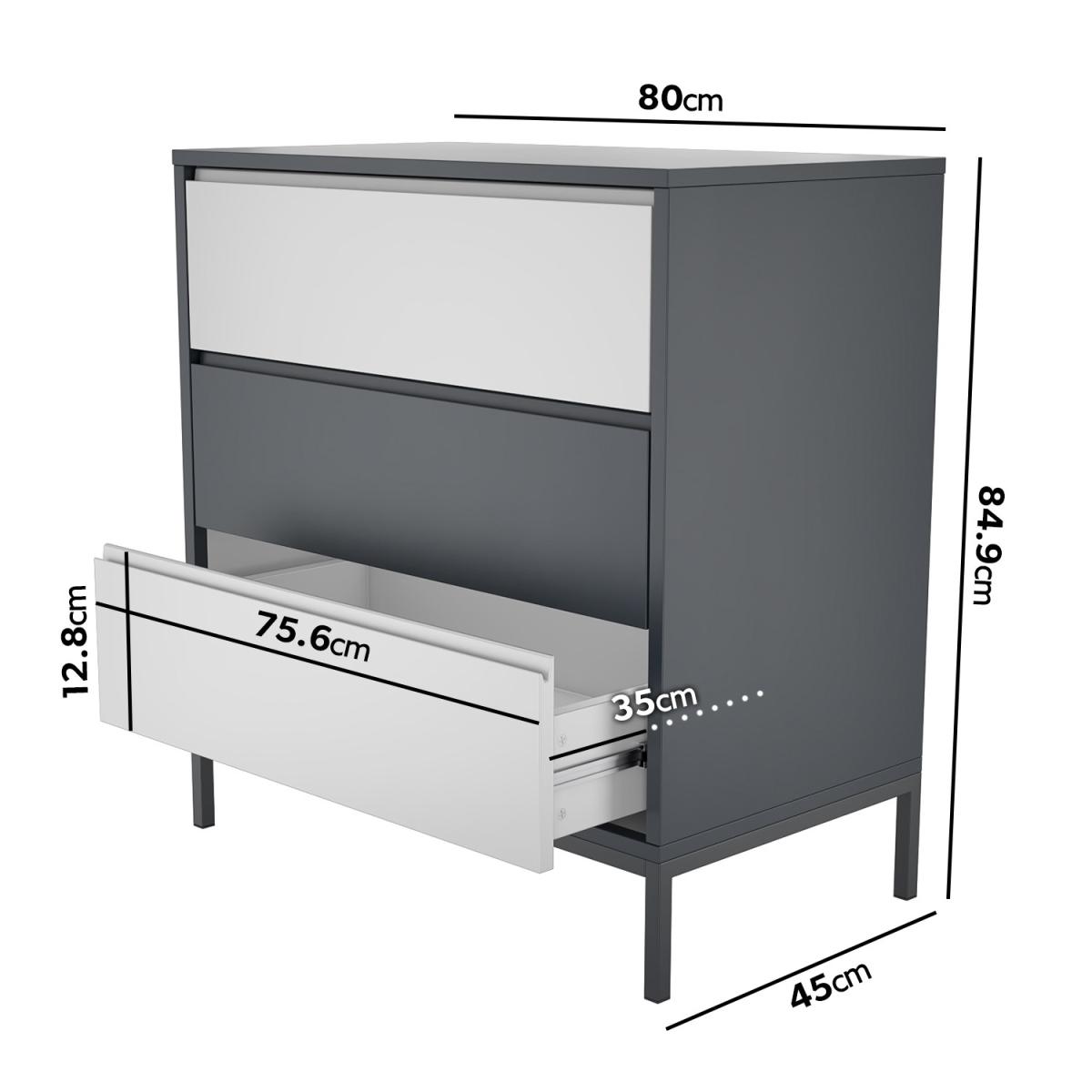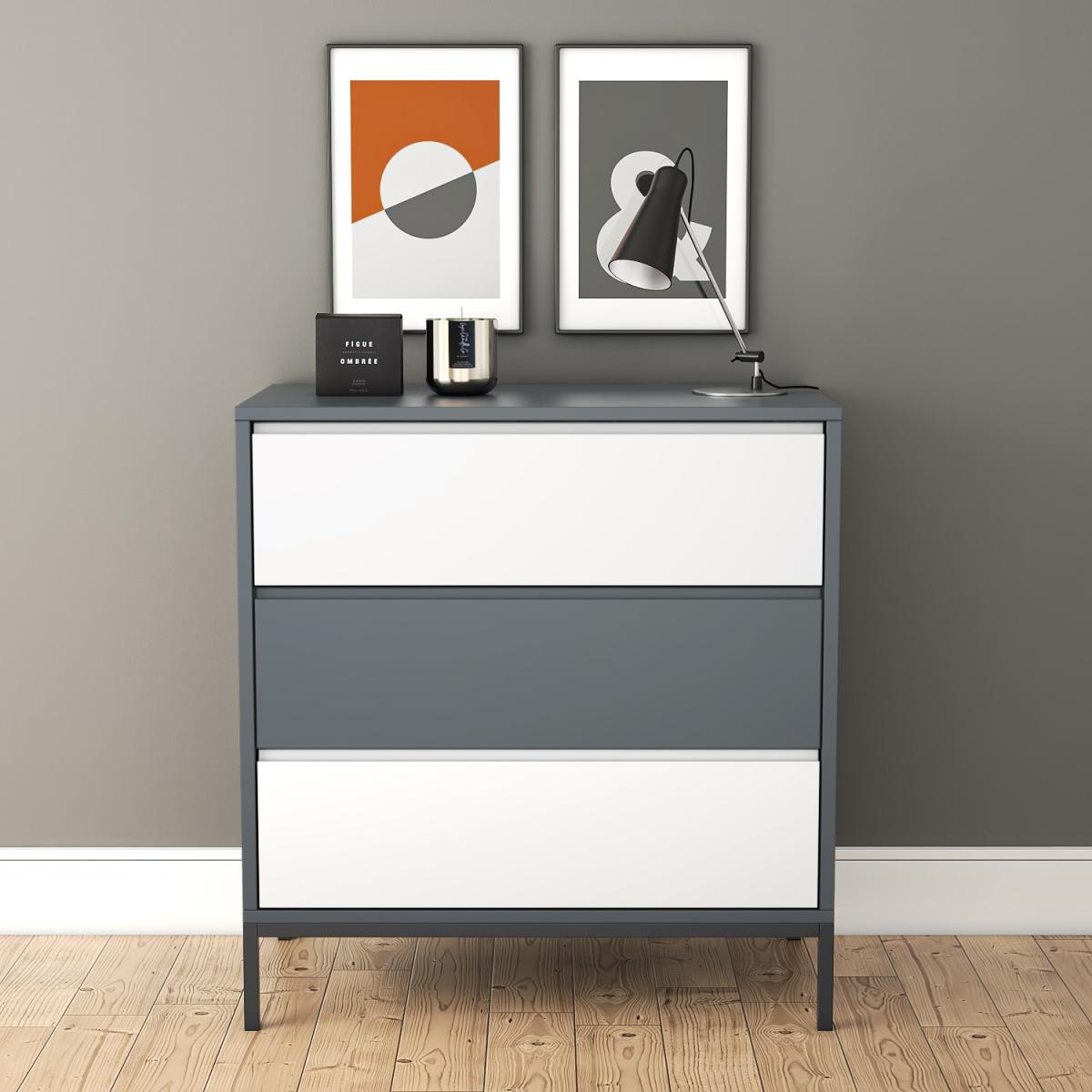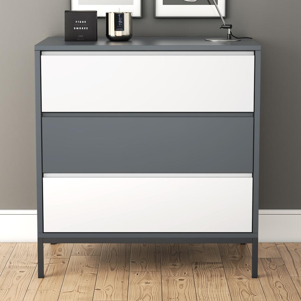 Retro chest of drawers in dark grey and light grey 3 spacious drawers with ample room for folded clothing Drawers are made with quality ball-bearing runners The handleless design gives the piece a sleek look Matching furniture available in the Aiko collection Add a retro feel to any room in the house with these grey and white drawers. With 3 large drawers, there is plenty of space for storage, and the handleless design finishes the design off. The monochrome colour palette allows you to style the drawers in any interior setting and add a complementary pop of colour alongside them. Why not complete your room with the matching items? Just search Aiko on our website to discover more. Need to know Number of drawers: 3 Colour: Dark grey and light grey Cabinet finish: Lacquered Leg finish: Powder-coated metal legs Material: MDF and metal Assembly required: Yes