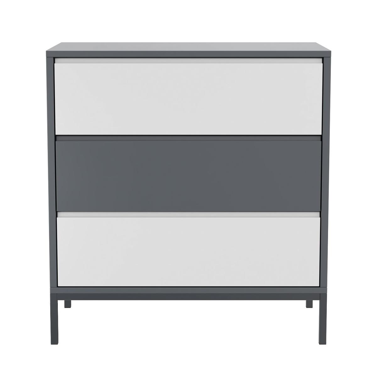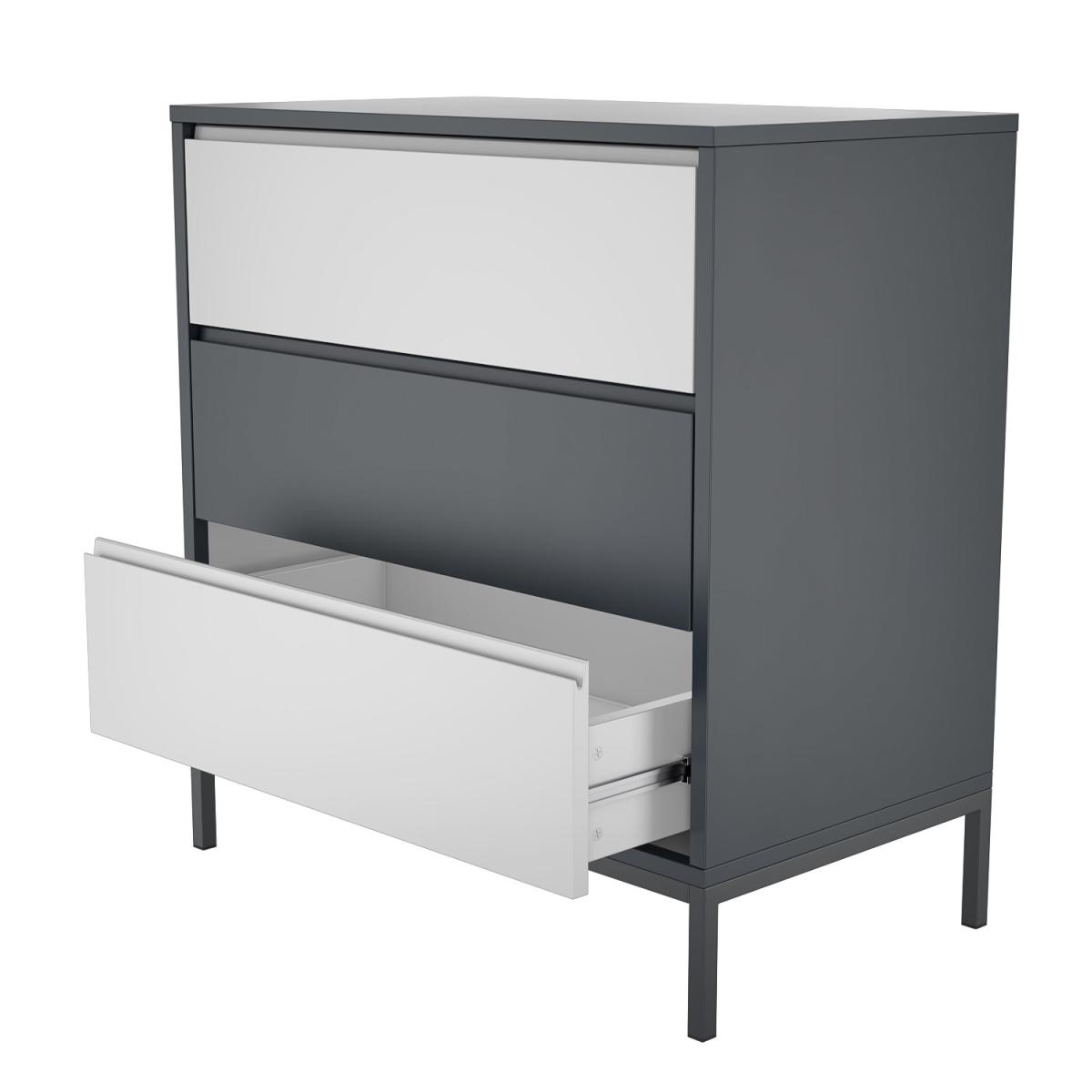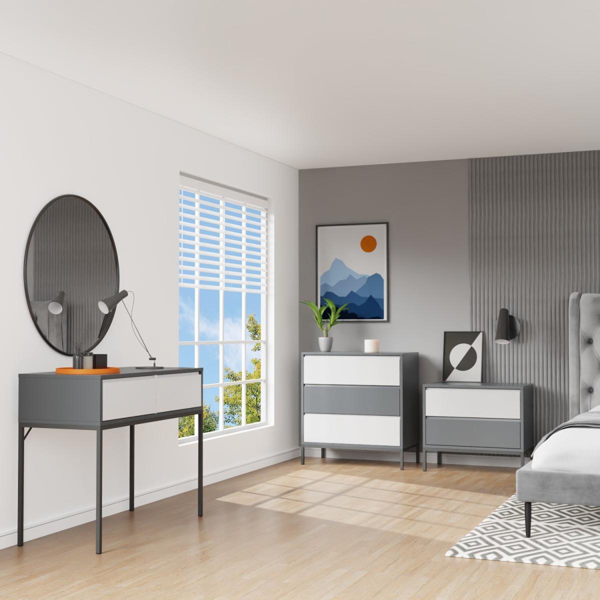 Retro chest of drawers in dark grey and light grey 3 spacious drawers with ample room for folded clothing Drawers are made with quality ball-bearing runners The handleless design gives the piece a sleek look Matching furniture available in the Aiko collection Add a retro feel to any room in the house with these grey and white drawers. With 3 large drawers, there is plenty of space for storage, and the handleless design finishes the design off. The monochrome colour palette allows you to style the drawers in any interior setting and add a complementary pop of colour alongside them. Why not complete your room with the matching items? Just search Aiko on our website to discover more. Need to know Number of drawers: 3 Colour: Dark grey and light grey Cabinet finish: Lacquered Leg finish: Powder-coated metal legs Material: MDF and metal Assembly required: Yes