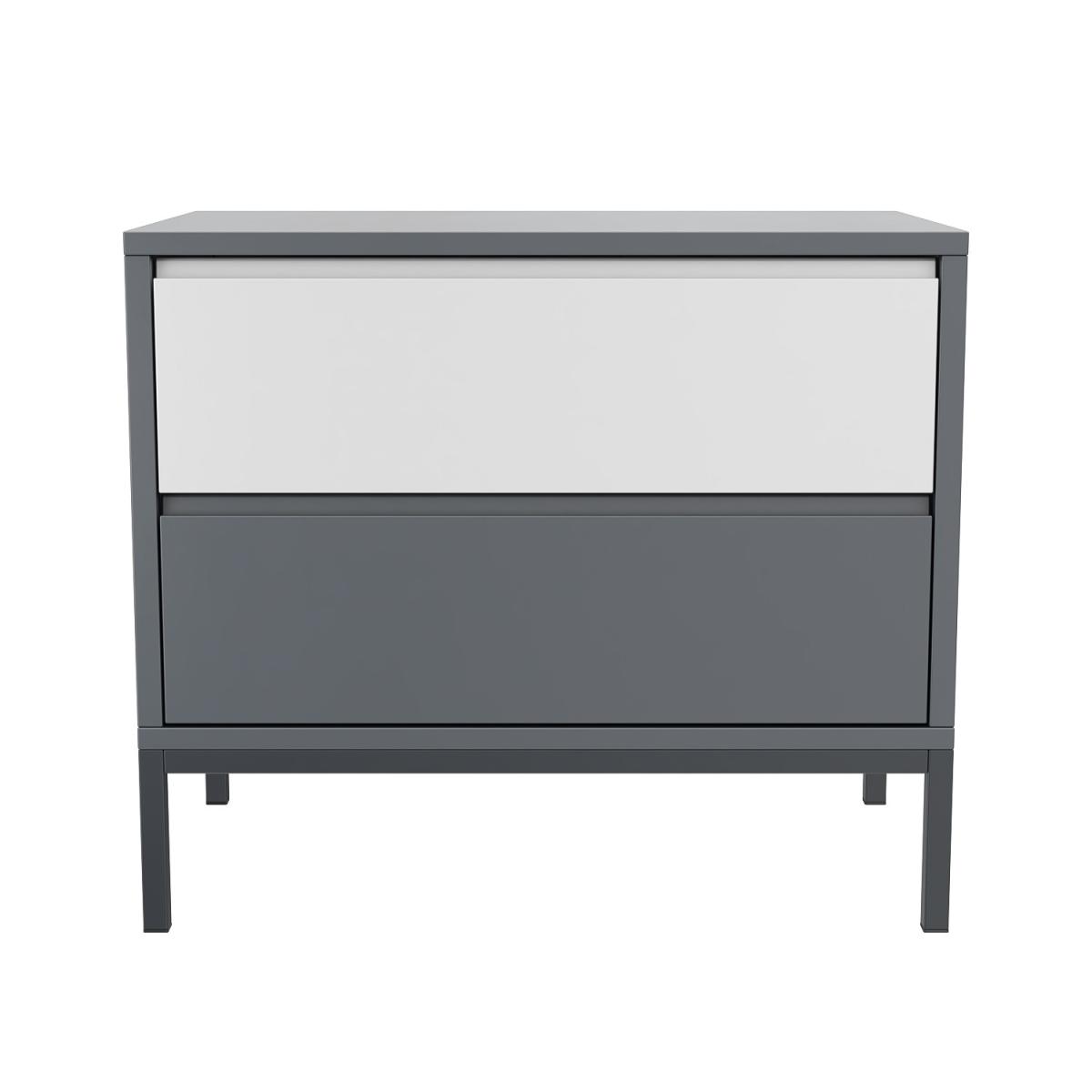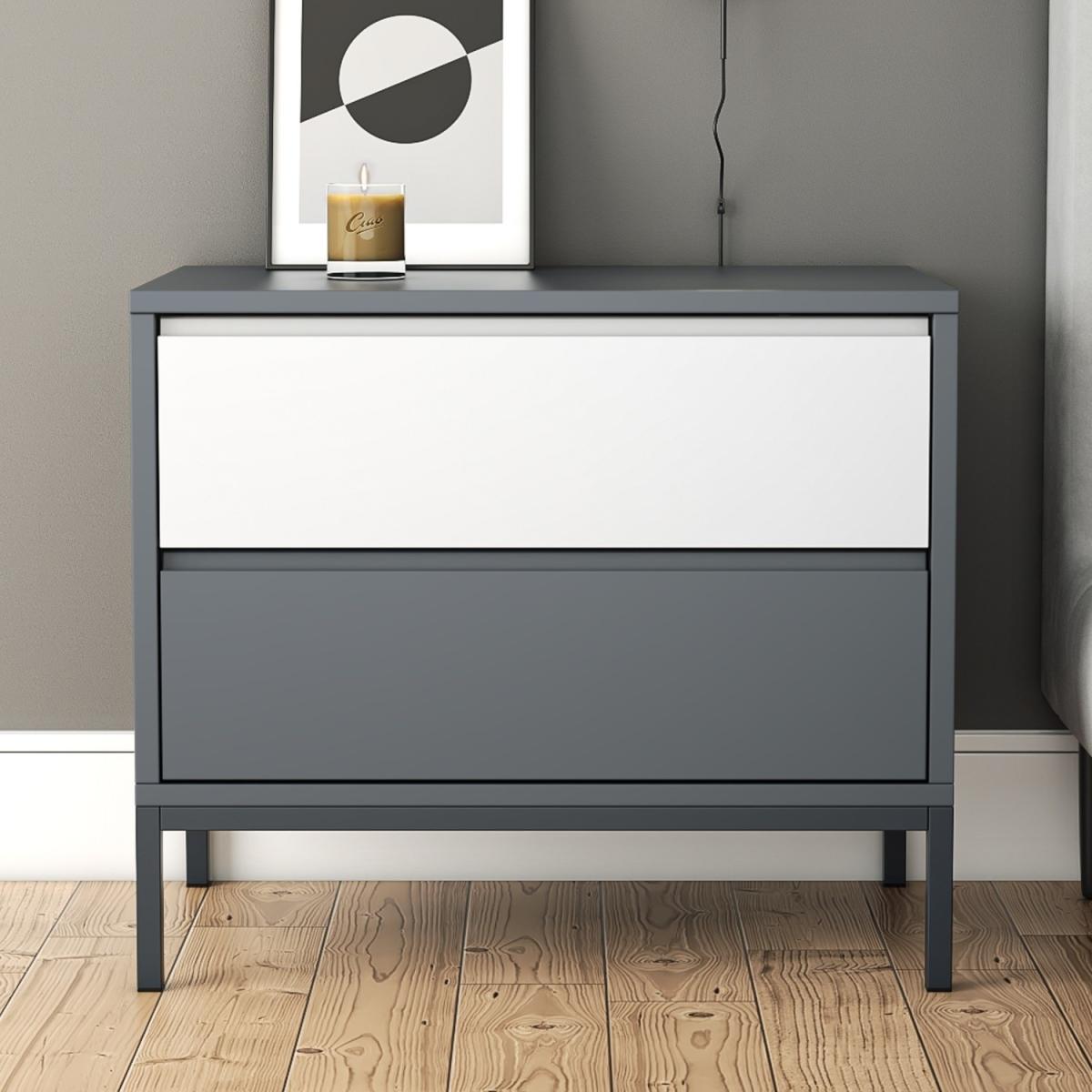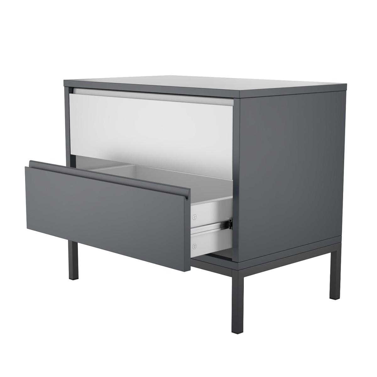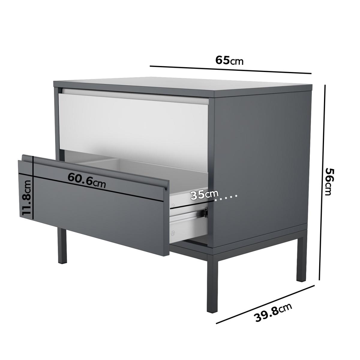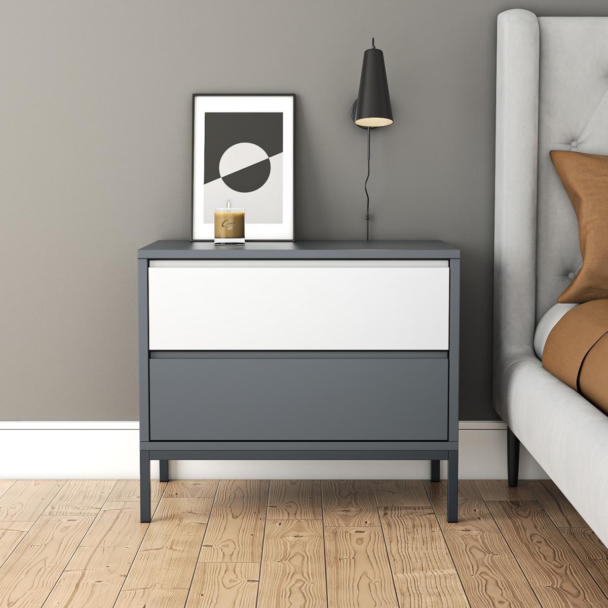 Retro bedside table in dark grey and light grey The 60cm width allows for 2 wide, spacious drawers The drawers are made with quality ball-bearing runners Integrated handles add to the modern seamless design Matching pieces available in the Aiko bedroom range The Aiko 2-drawer bedside table can be effortlessly styled in many ways. Its retro appearance makes it perfect for a young gamer's bedroom/chill out space, or add a fresh and modern touch to your home office. The powder-coated metal legs set this piece at the perfect height so your bedside essentials are easily accessible. Need to know Number of drawers: 2 Colour: Dark grey and light grey Cabinet finish: Lacquered Leg finish: Powder-coated metal legs Material: MDF and metal Assembly required: Yes