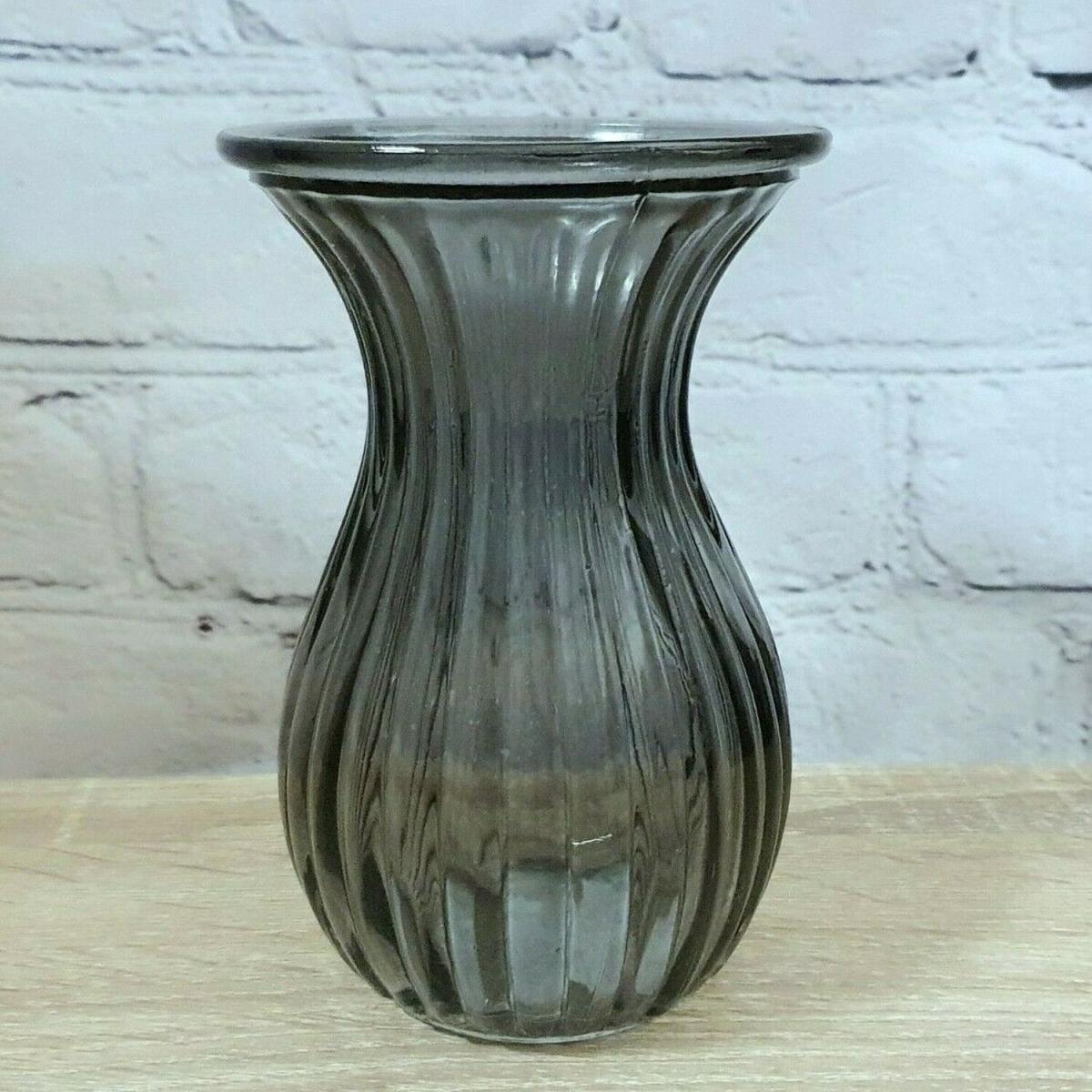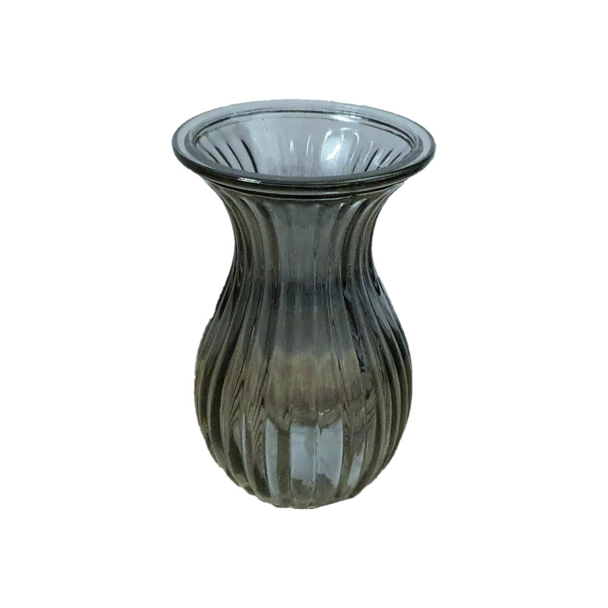 Grey ribbed glass posy vase, use with small stem flower arrangements, use in any room with real or artificial flowers. Elegant shape.