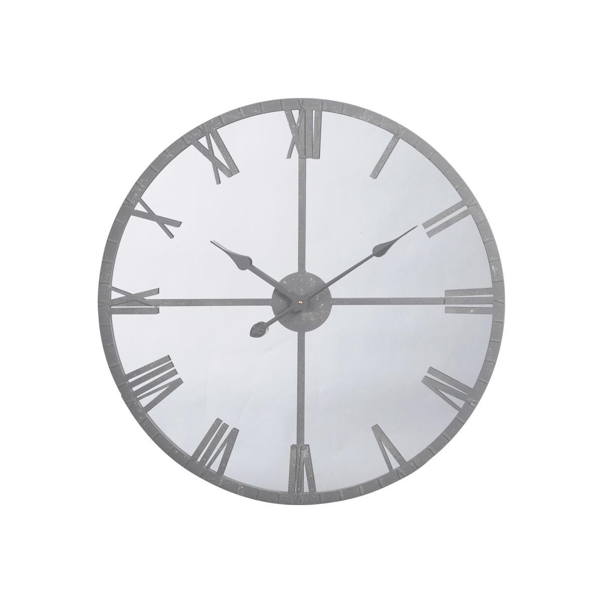 Design. Wonderfully simplistic with lots of contemporary appeal, this mirror-based wall clock looks truly stunning. Featuring classic roman numerals which are in keeping with the subtleness of the mirrors design, the weathered iron is offset perfectly allowing your attention to be drawn to both mirror and time.