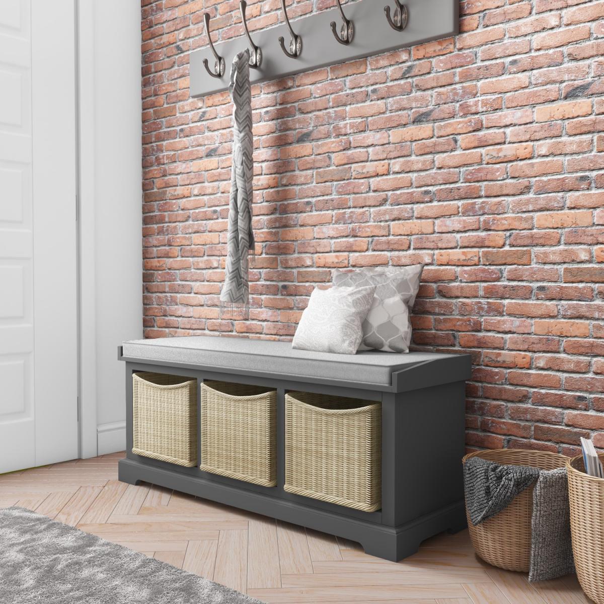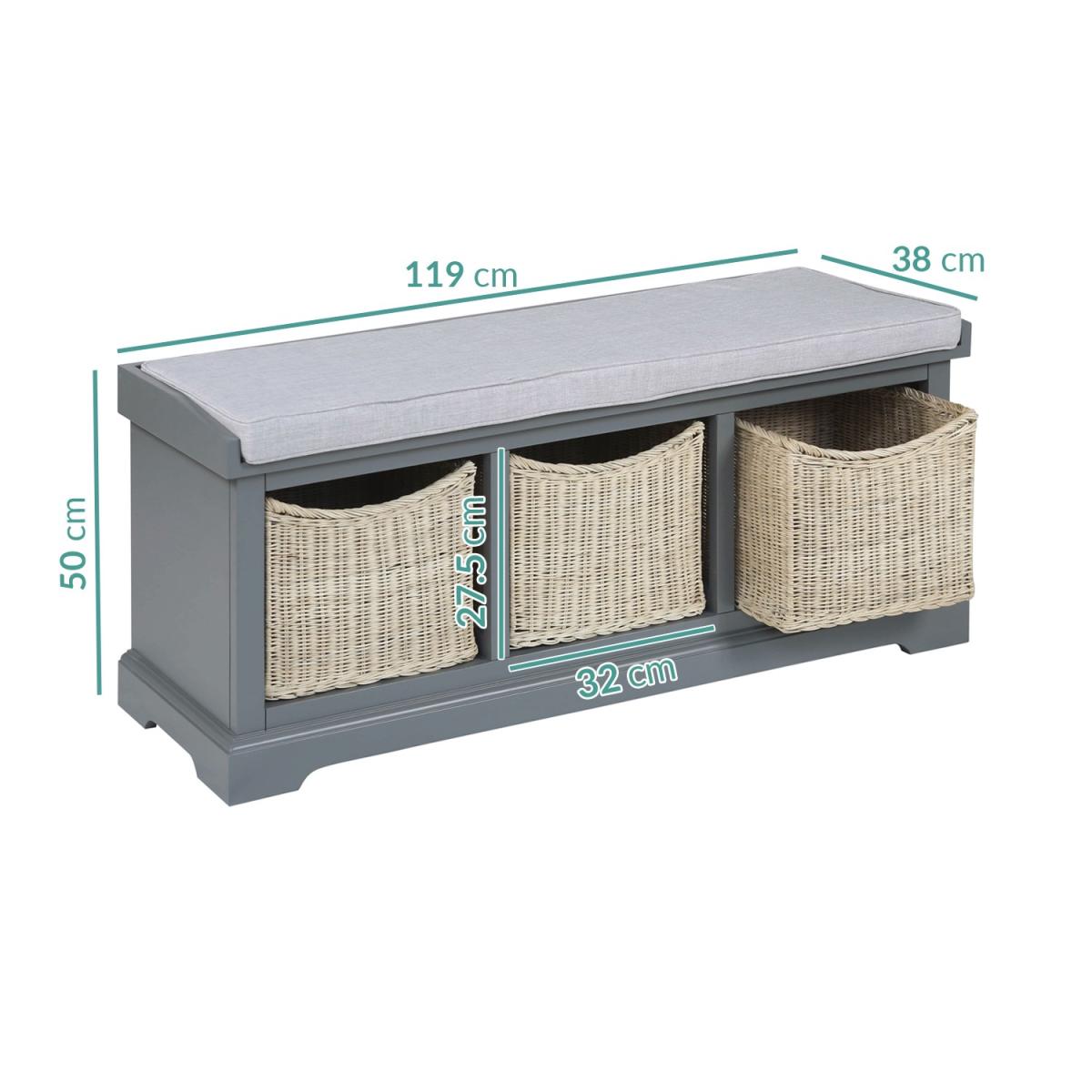 Features we love Designed to offer maximum storage space without taking up too much room. Three storage spaces offer the perfect space for shoes and other items. Removable handwoven wicker baskets are ideal for hiding away clutter. A comfy cushion provides a great place to put on your shoes. Its classic farmhouse design produces a warm homely feel. There's absolutely no assembly required! All about me. Give your guests the best first impression as soon as they walk through the door with this elegant farmhouse style bench. Neatly designed to help keep your hallway tidy this handy piece offers the perfect space to hide away shoes umbrellas and anything else you need within easy reach near the front door. It features three cubbyholes and perfectly sized handwoven wicker baskets to help hide away any clutter. A cushion stretches across the top of the bench giving you the perfect place to perch as you put your shoes on or help the kids with theirs. With a hand painted dark grey finish grey cushion and natural wicker this bench is fitting for any décor style. Crafted from a combination of acacia wood and a strong wood combination this bench is really solid and will withstand everyday wear and tear. And best of all it's fully assembled so you can use it right away!. Need to know. Dimensions. H 50 x W 119 x D 31.5cm Cubbyhole dimensions. H 27.5 x W 32 x D 31.5cm Material. Acacia wood and; a solid wood combination Finish. Hand painted dark grey. No assembly required More info Neat and compact design. Full length cushioned top with removeable cushion cover easy to wash. Three storage spaces. Three handwoven wicker baskets. Perfect for shoes and clutter Ideal for smaller spaces.