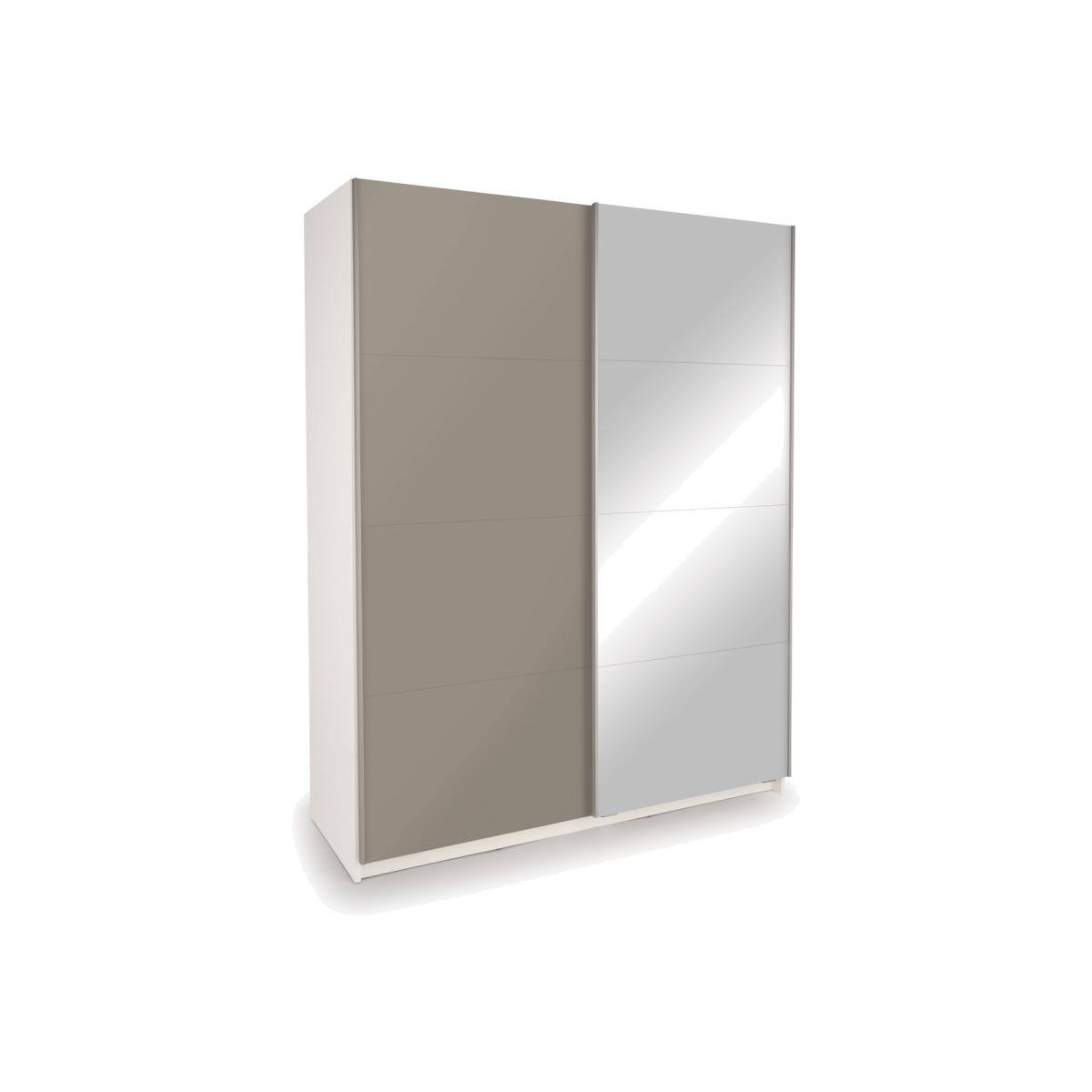 This modern sliding door wardrobe is finished in crisp Alpine White. The 2 large doors feature 1 High Gloss Grey finish and 1 full mirror door, the reflective mirror enhances any room. Both the grey door and the mirror door come in 4 panels each, which can be put put in any configuration.