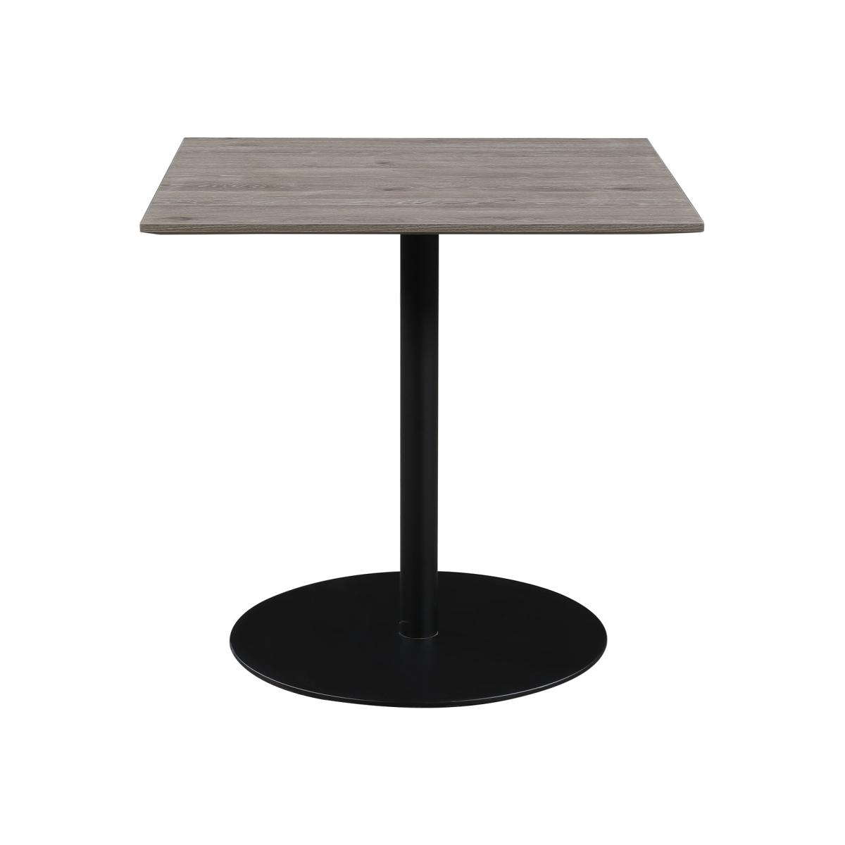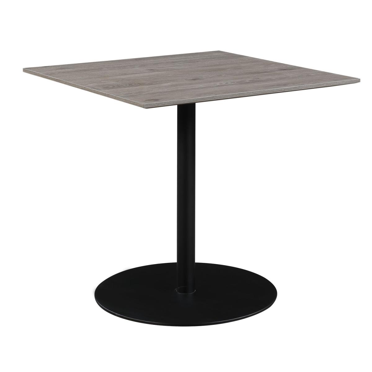 Dimensions:H76 x W80 x D80 cm This stylish and industrial small square dining table will add a contemporary touch to any kitchen or dining room. This design easily coordinates with various modern home decors and dining chairs, giving you the perfect place to comfortably have meals for 2 while making an eye catching statement. Features: Grey wash wood effect finished top Beautifully crafted Slim Pedestal with round base in Black metal Seats 2 to 4 people Heat, scratch and stain resistant top Assembly required
