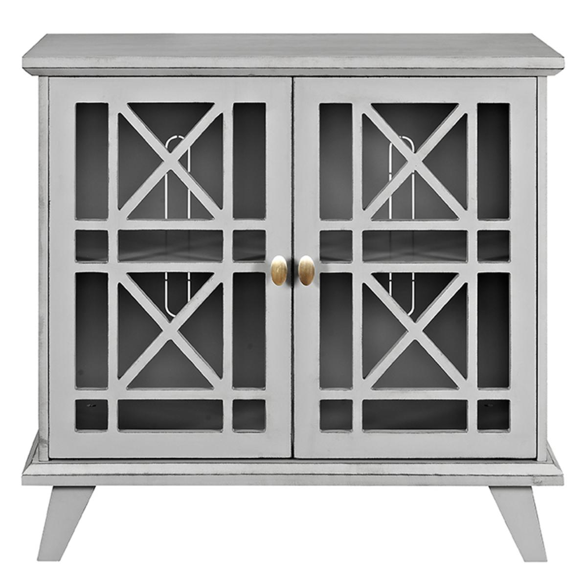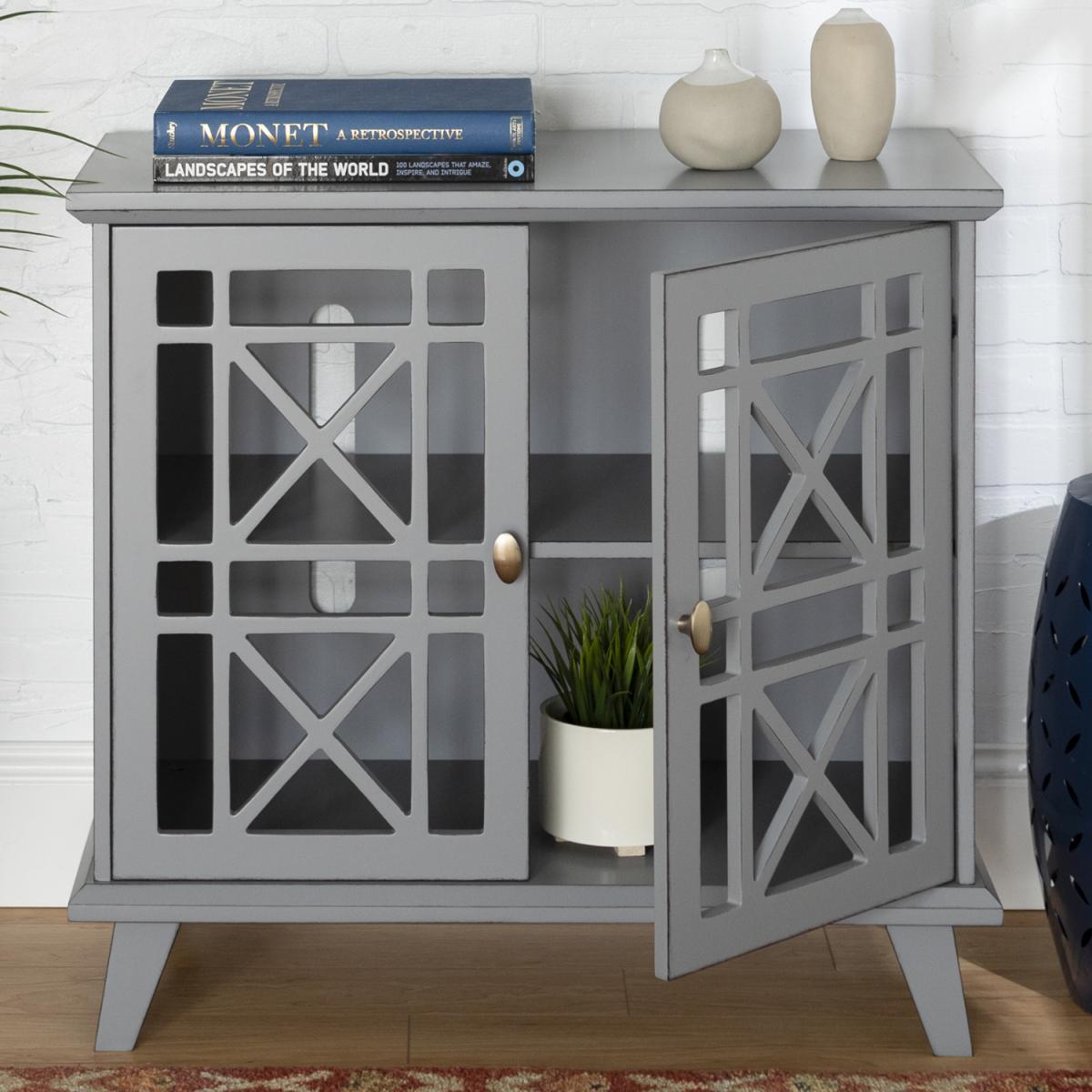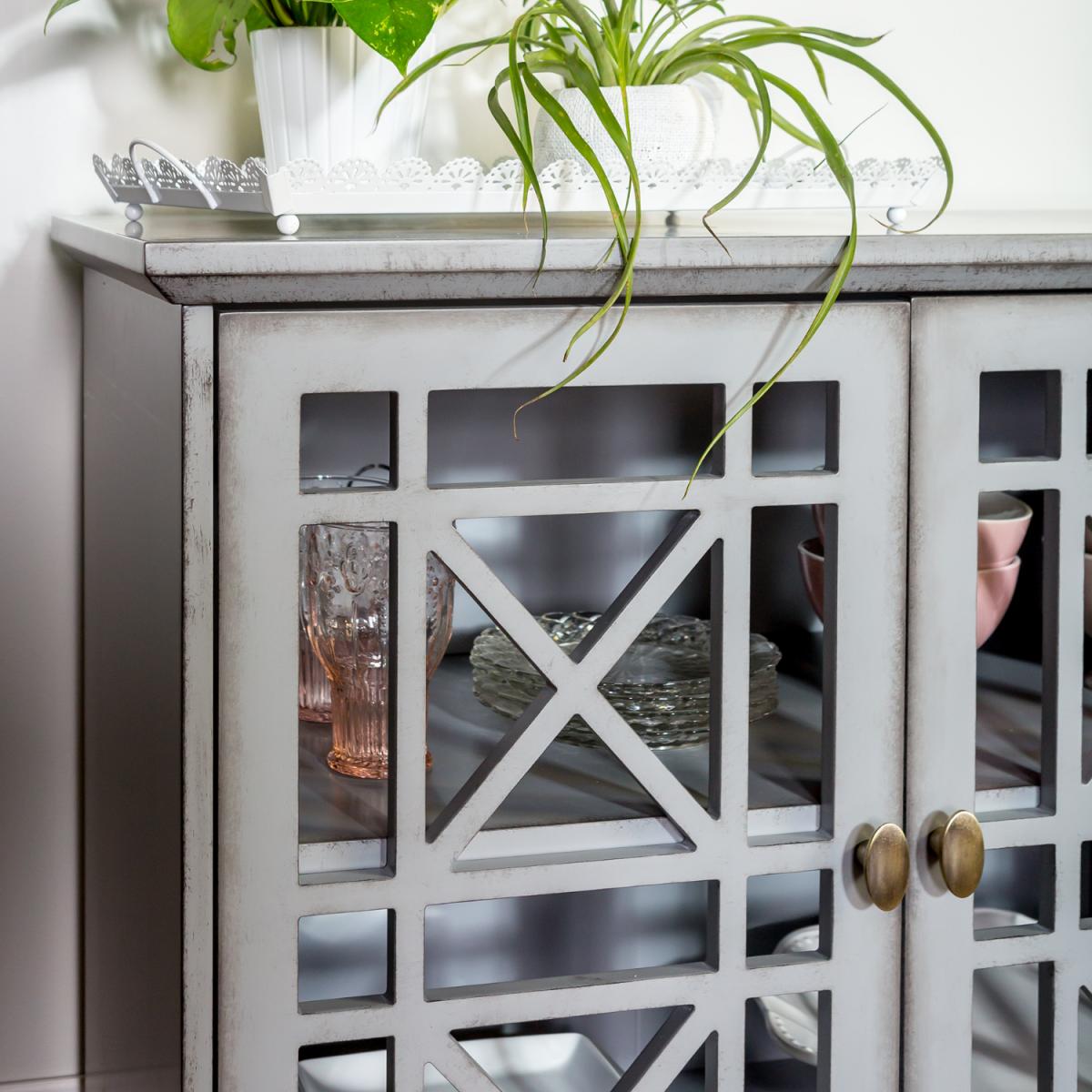 Dimensions H97cm x W81 x D41cm. Add character your home with this decorative grey storage hall cupboard. The fretwork doors add an intriguing design for a look that is sure to be talked about. Made of solid wood high-grade MDF with wood veneer and painted for a classic look. This combination of practical and decorative create a beautiful accent storage cupboard that will compliment any hallway. Features. In a contemporary design style to be an accent in your home Stylish modern design. In a durable long-lasting and versatile design to complement your home décor. With burnished and distressed edges to add to the style Perfect grey storage cupboard for hallway. Step by step instructions Assembly required..