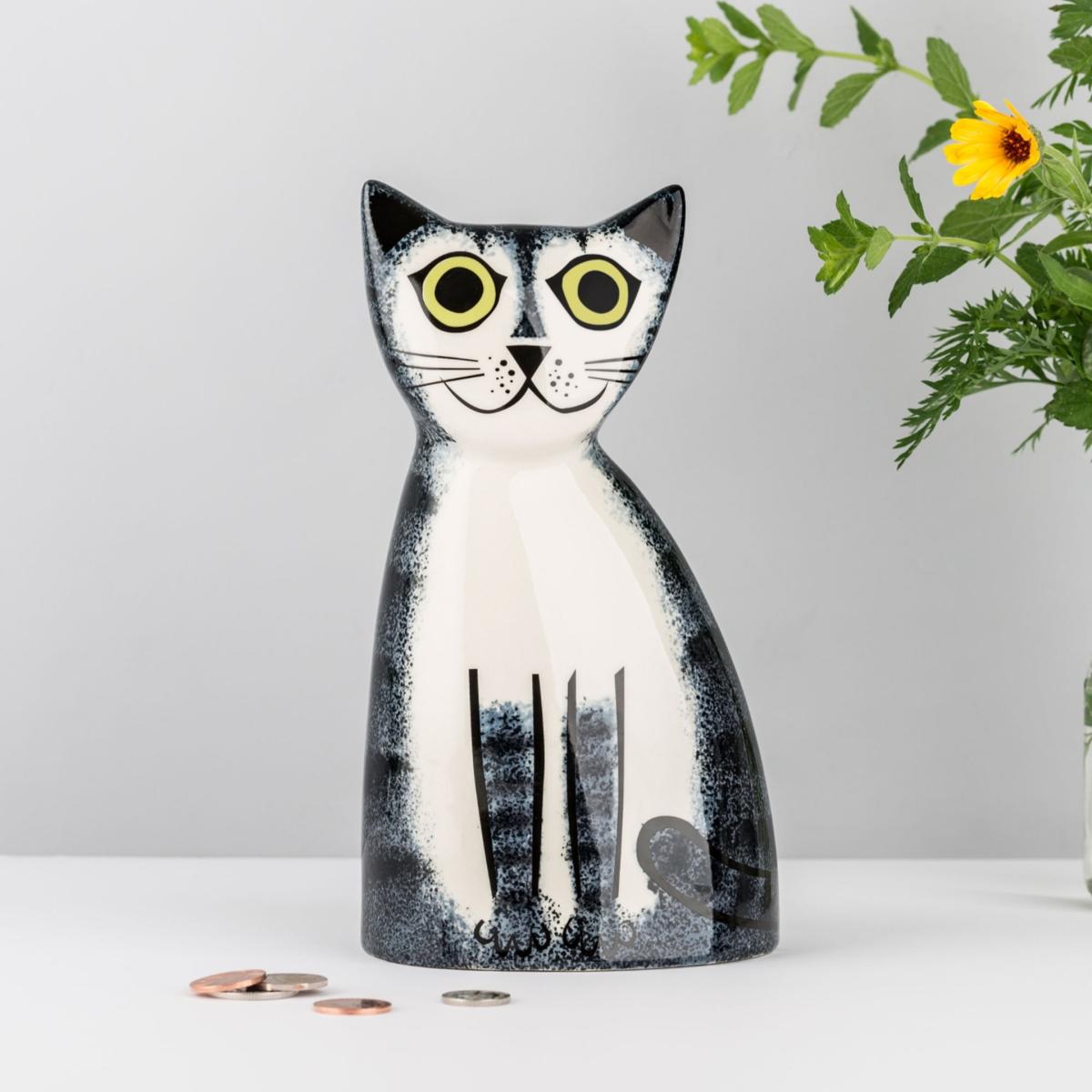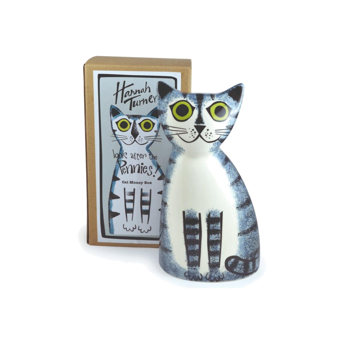Meowww!! Meet the Grey Tabby Cat money box, designed by Hannah Turner. Hand-painted with Hannah's classic kitty expressions, these pottery pussy cats are here to help you to look after your pennies and pounds. Hannah’s Cat Coin Bank has enormous feline appeal for adults and children alike and will capture the heart of any cat lover. The retro style of this Cat has a very nostalgic feel and Hannah’s comic graphic style creates a characterful gift with bags of charm. There is a slot on the back of the head for the pennies or pounds and a rubber stopper in the base for emergencies!