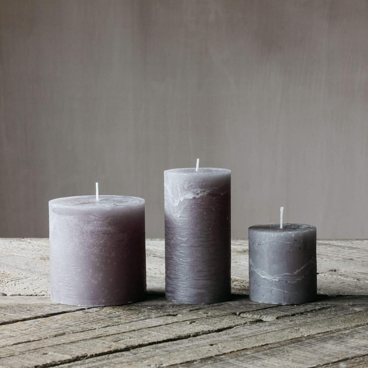 A collection of rustic pillar candles in a cool grey colour. Cluster them together on your dining table or mantlepiece for a contemporary Scandi-inspired look.