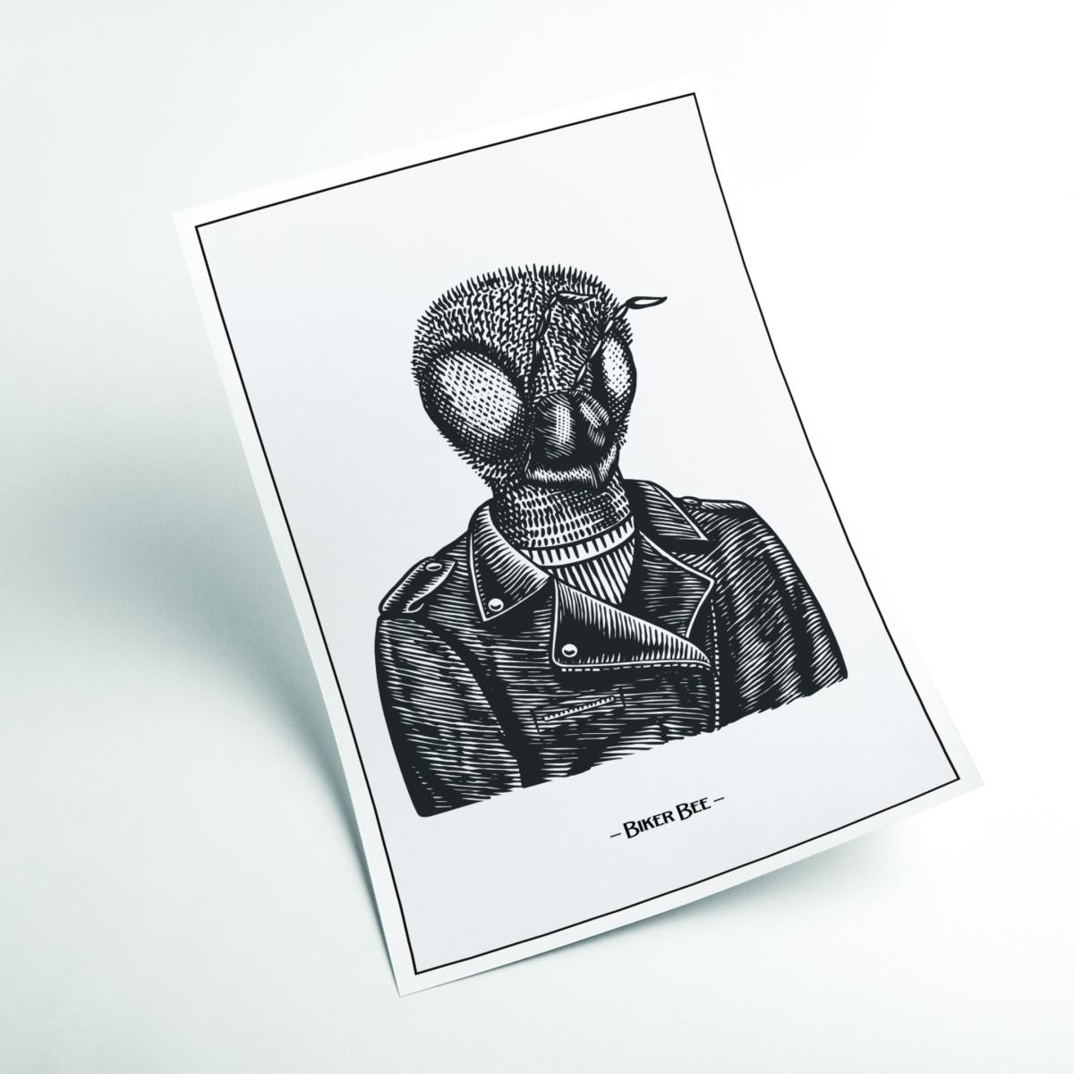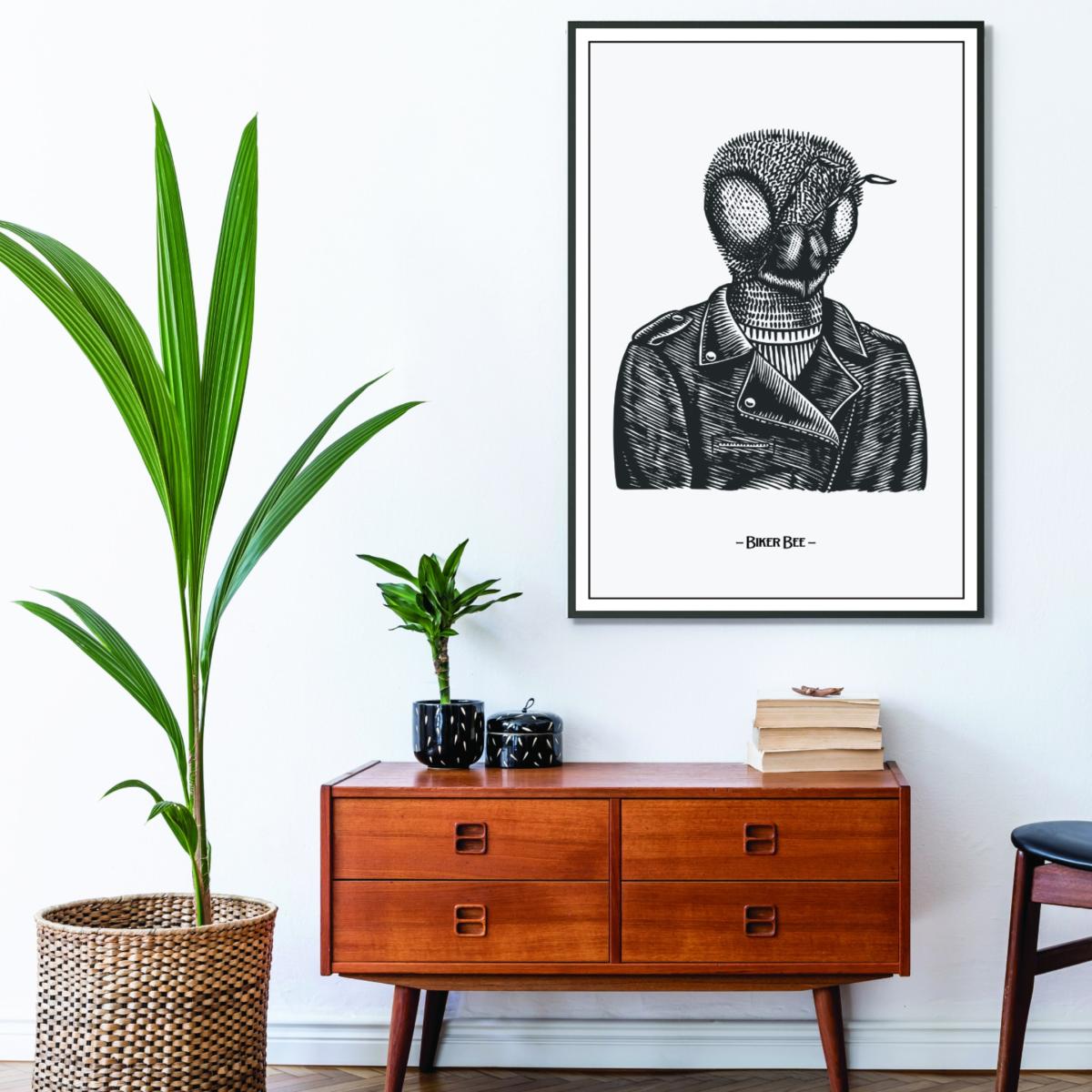 I really like the Biker Bee print for adding a quirky, contemporary touch to a space. Its monochrome palette makes it versatile, working well in modern, industrial, or monochromatic interiors. It can serve as a statement piece on a neutral wall or complement other black and white artwork for a curated gallery look. Practical styling tips include pairing it with minimalist frames or displaying it as part of a mixed-media wall to create visual interest. It's especially suited for casual living spaces, home offices, or eclectic schemes where a bit of personality and a touch of humour are welcomed.