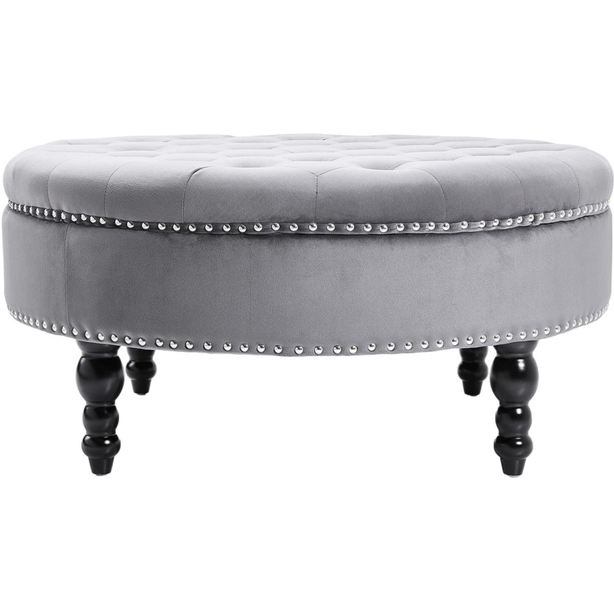 Brimming with sophistication, the Livingandhome tufted round cocktail ottoman makes a glamorous addition to your stylish seating ensemble. This ottoman stands on black gourd wood legs and boasts a round silhouette, working well in a variety of aesthetics from traditional to contemporary. With added premium tufting details and two rows of silver nailhead trim design, this upholstered ottoman can act as an extra bench, a stand-in coffee table, or just a place to prop your feet on.