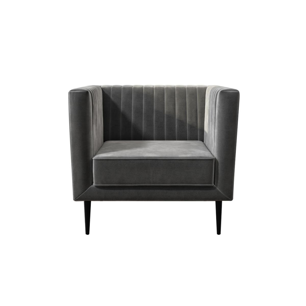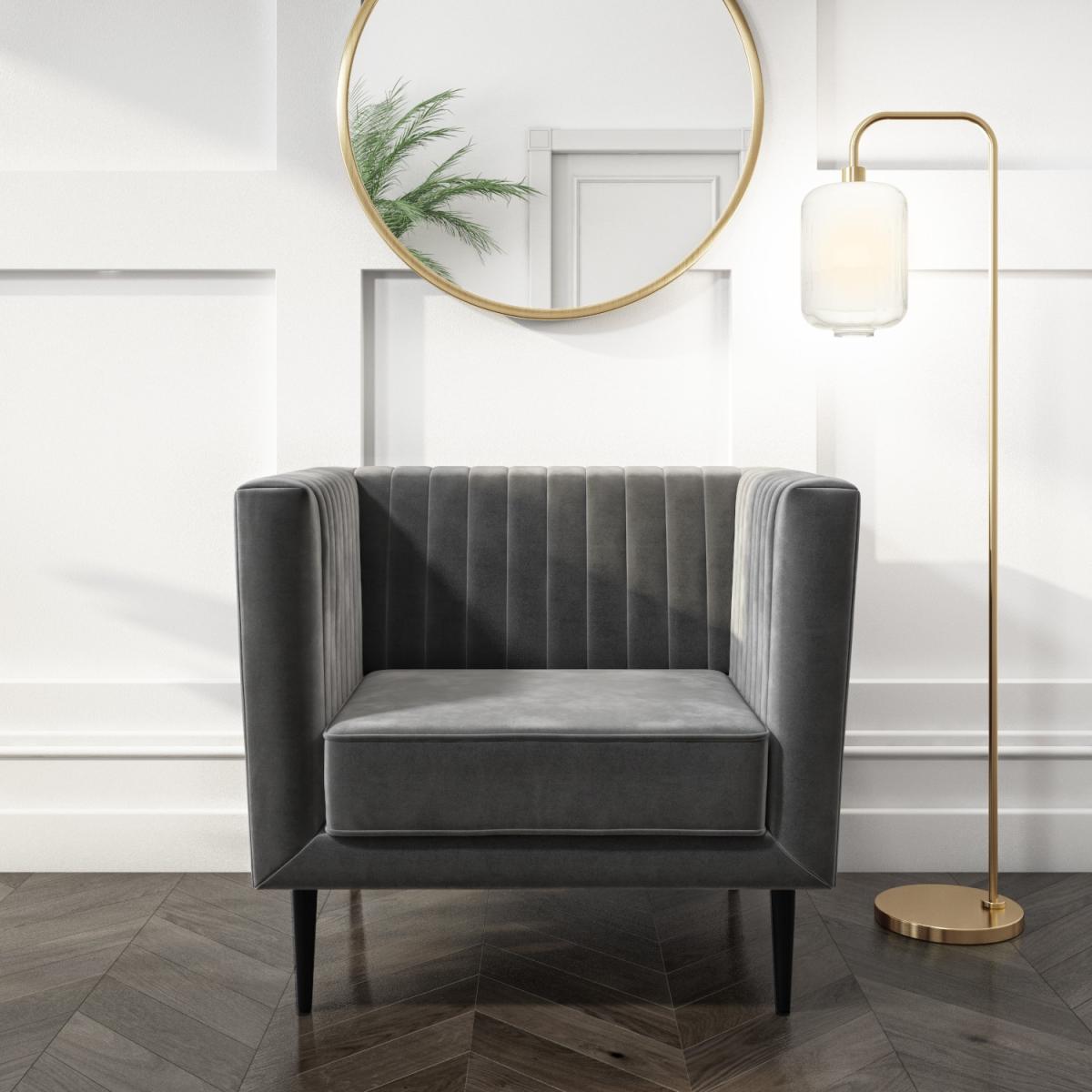 Features we love This mid-century inspired armchair combines style and comfort. Soft-touch velvet gives this chair an even more comfortable feel. Contrasting black tapered legs produce a contemporary finish. Fluted detailing creates an opulent look suited to any living room or bedroom style. Also available in striking orange All about me. This mid-century inspired design armchair is the perfect addition to any living room set or as an accent chair in a bedroom. Clean square lines produce a bold and individual shape while the contemporary fluting on the backrest adds to the chair's stunning appearance. Mounted on tapered black legs to round off a stunning appearance this chair ultimately offers style and comfort wherever it sits in your home. Need to know. Dimensions. W88 x H77 x D75 cm Floor to seat dimensions. 46 cm Colour. Charcoal grey Finish. Velvet upholstery Material. Velvet wood and metal (base) Weight. 19kg Assembly required. Yes Assembly time. Up to 20 minutes.
