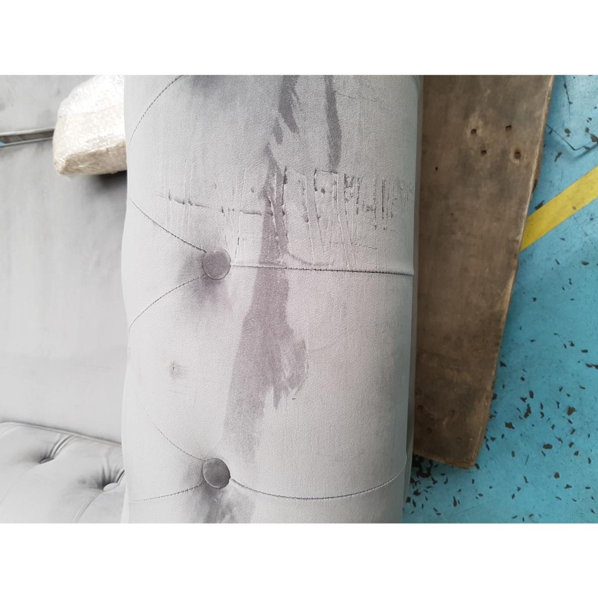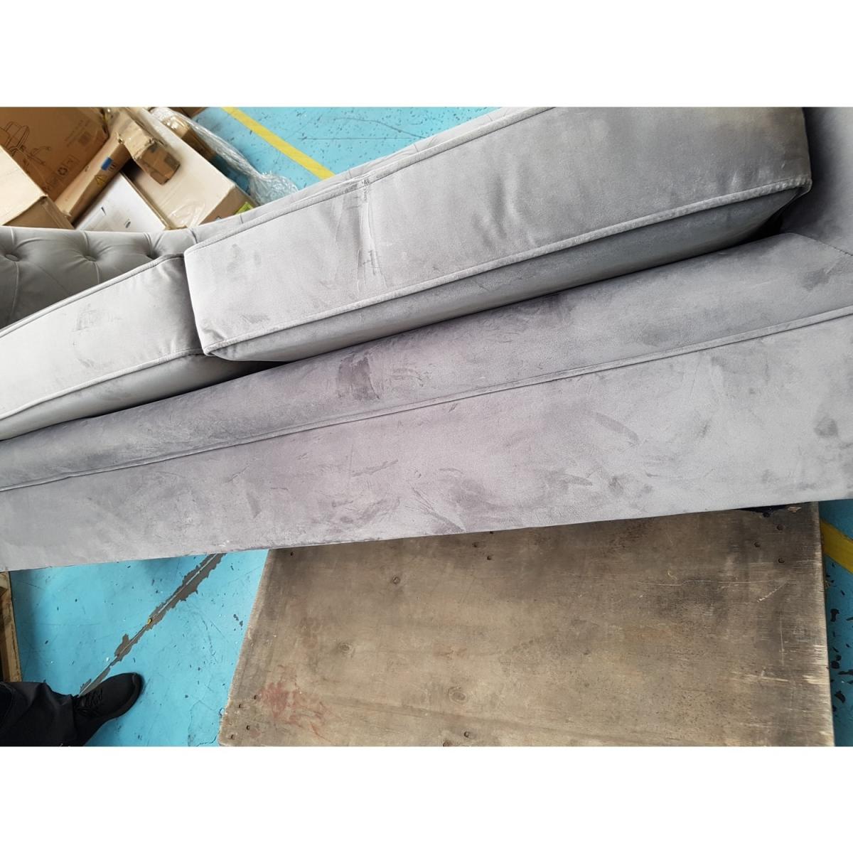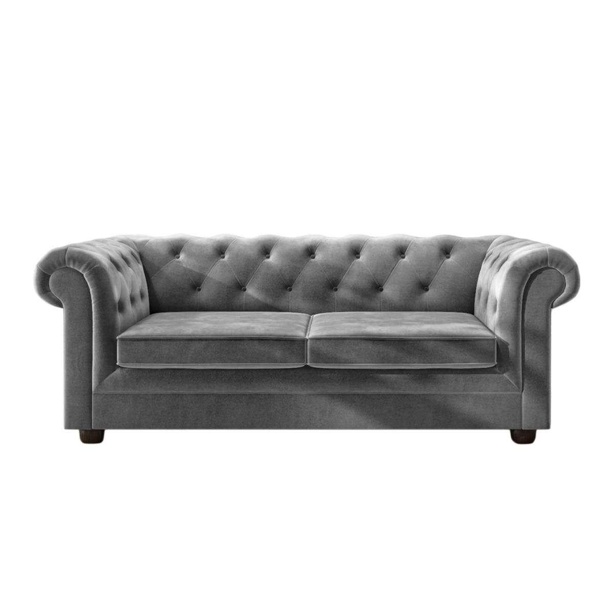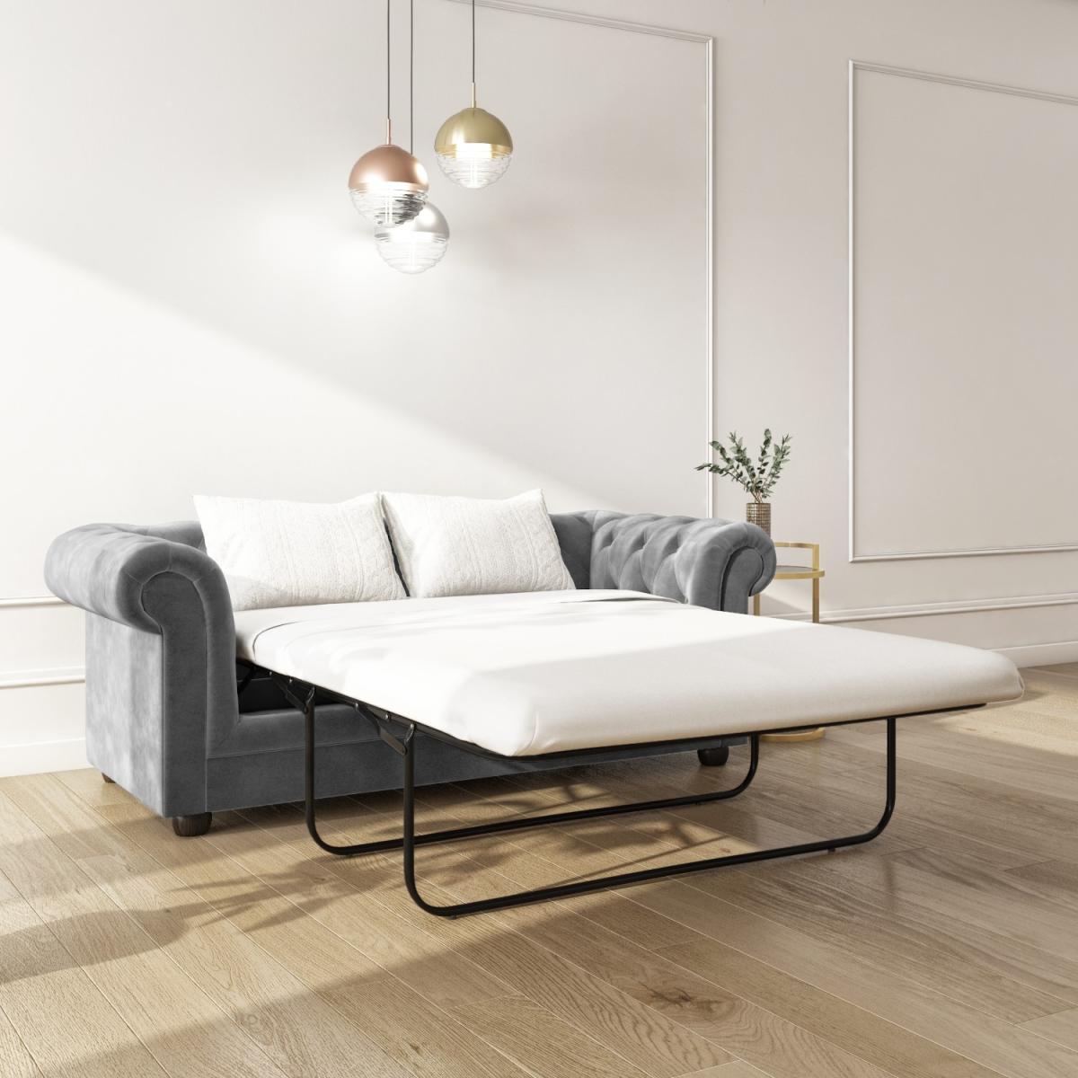 Chesterfield inspired sofa bed has a traditional feel Upholstered in luxuriously soft, grey velvet Stud buttoning and scrolled arms create a classic look Quick assembly – ideal for last-minute guests Mattress included: W 113cm x D180cm (6cm thick) Polished wooden feet round the look off perfectly Equally as perfect for spare bedrooms and multiuse rooms Need to know Seat height: 45cm Colour: Grey Finish: Velvet upholstery Material: Velvet fabric, Wooden sofa frame, Metal bed frame Assembly required: Yes