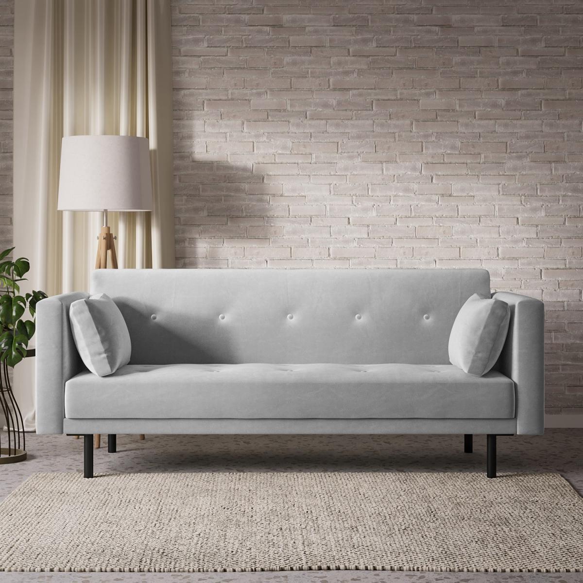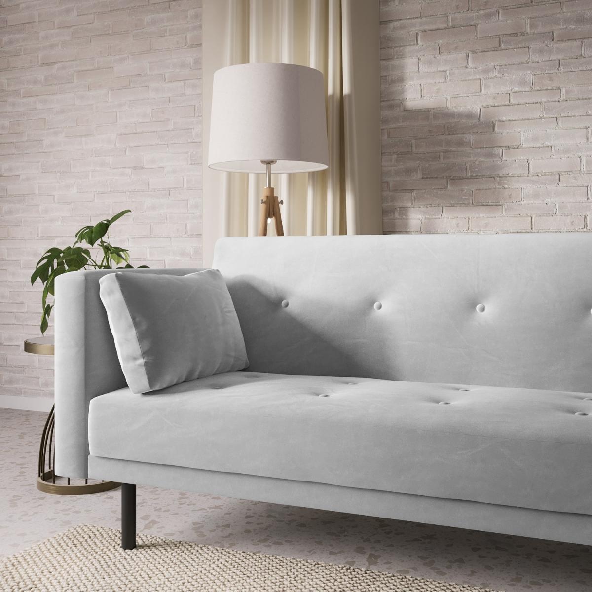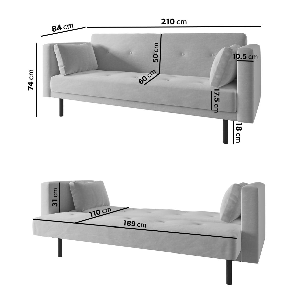 This click-clack sofa bed is perfect for those last-minute guests. It is beautifully upholstered in a soft touch grey velvet, it's guaranteed to make an impact, and it'll easily coordinate with other furnishings and décor. The dark metal legs add a final finishing touch. This sofa can seat up to 3 people and it also turns into a bed, the Rory is practical and convenient. Also, the 2 scatter cushions are included providing extra comfort.
