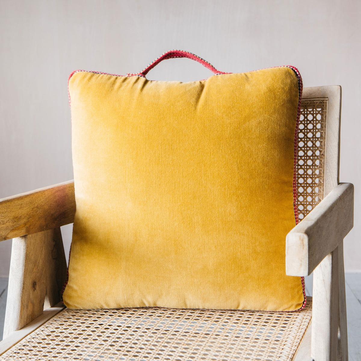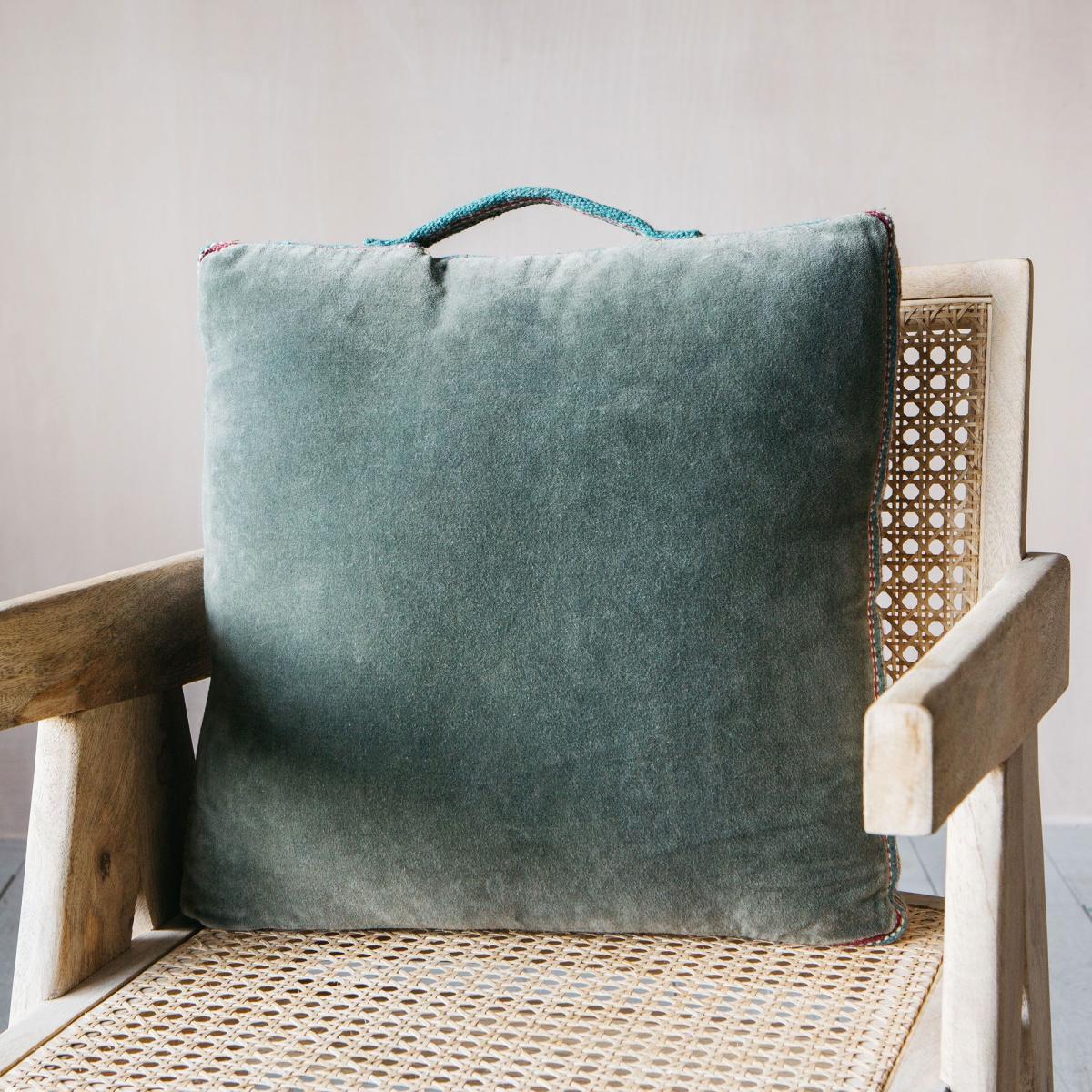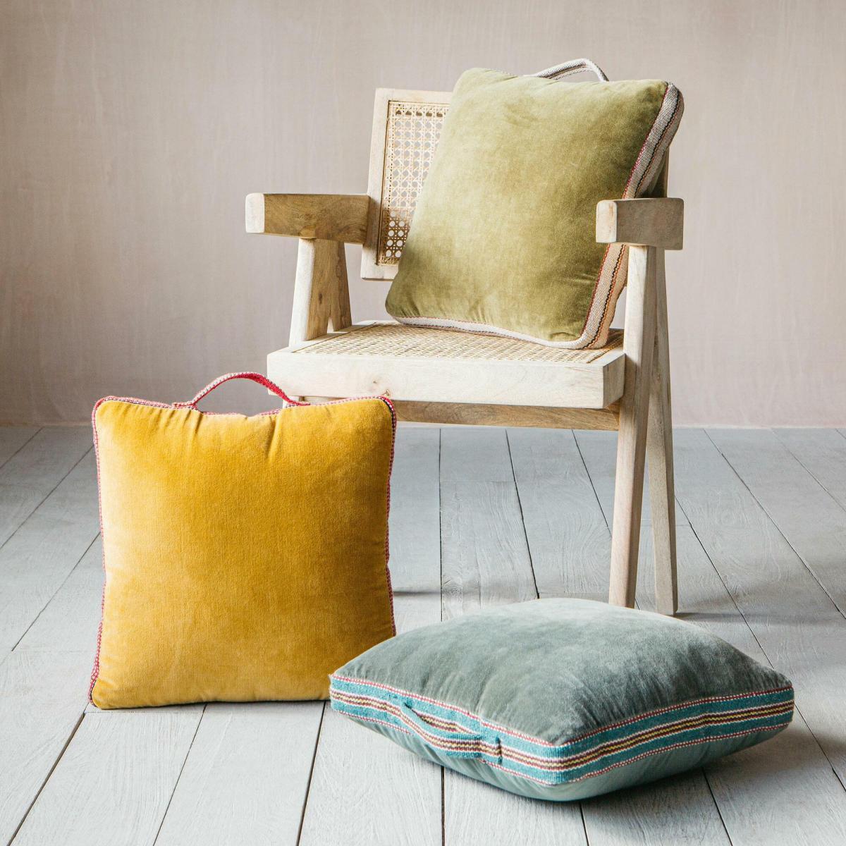 A collection of vibrant cushions handmade from sumptuous velvet with a contrasting trim and stitched handle. Perfect as plush seat pads or stylish floor cushions.