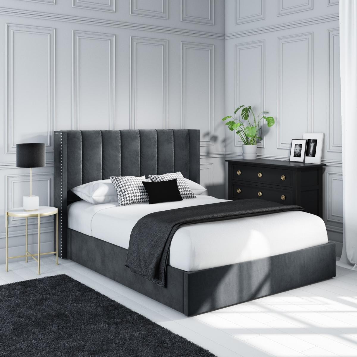 Features we love Front opening storage space with gas lift mechanism provides effortless access. The entire area beneath the mattress can be used as storage!A cushioned headboard gives you the perfect place to rest and delve into a good book. Upholstered in high-quality soft touch velvet brings an air of elegance to your bedroom. Studded detail creates an instant focal point in your bedroom. Fabric base helps to protect your stored items from dust All about me. This Maddox Ottoman has it all! Style comfort and convenience. Upholstered in a soft anthracite grey velvet it'll co-ordinate with all bedroom décor and furnishings. The elegantly winged headboard is lusciously cushioned giving you the perfect place to rest as you read a book or watch TV. Studded detailing finishes off the look creating a focal point in your bedroom. Lift up the mattress and you're greeted with a generous storage space ideal for spare bedding shoes clothes or just about anything you need to store! It's a practical solution for those storage problems we all face. And with a gas mechanism that makes lifting the mattress easy you'll be able to get to those stored items in no time. The storage space features a fabric base helping to keep the area free from dust and your items clean and ready to use. It's a high quality build too with a durable wooden frame a sturdy wooden sprung slatted base and supported by central legs for extra stability you'll have assured mattress support! This bed fits a UK standard double mattress which isn't included so you'll be able to choose one that's perfect for you. Need to know. Total dimensions. W 146 x D 204 x H 123 cm Storage dimensions. W 137 x D 192 x H 22cm Height from floor to mattress. 30 cm Mattress height should not exceed 25cm. Bed mattress size. Standard UK double (135 x 190cm / 4ft) Colour. Anthracite grey Material. Solid wood combination of MDF Finish. Upholstered in soft velvet Bed base. Wooden sprung slatted Assembly required. Yes Mattresses included. No.