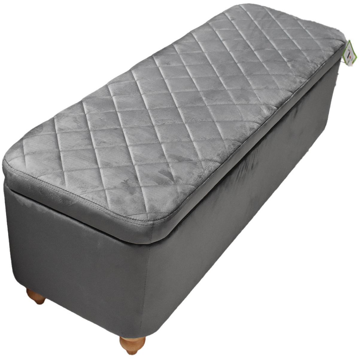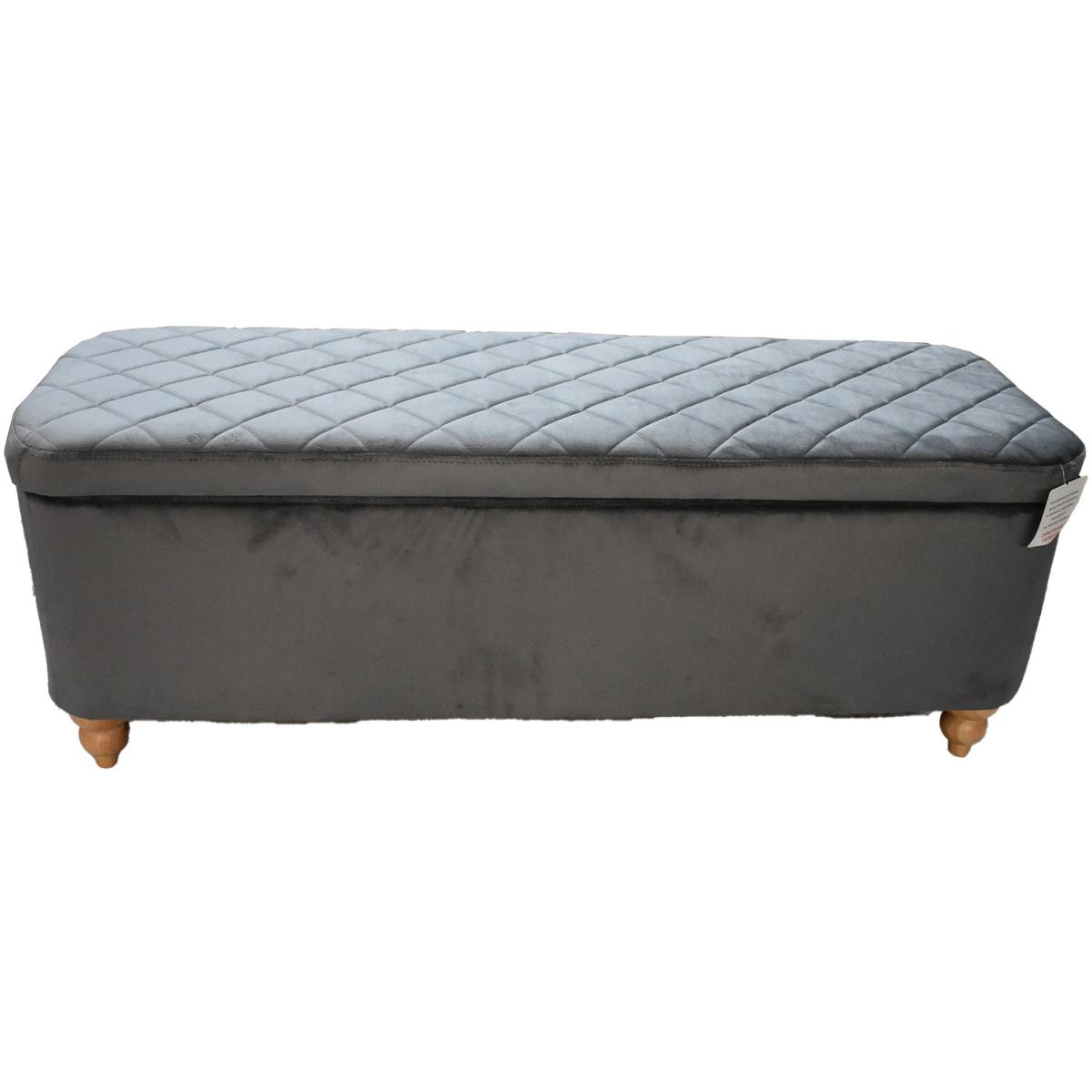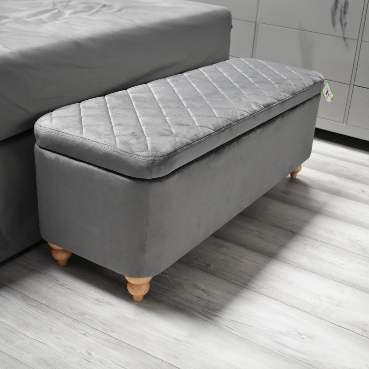 Introducing our Grey Velvet Ottoman Storage Bench with Spindled Wooden Legs, the perfect blend of style and functionality for your living space. Upholstered in a luxurious soft grey velvet finish, this bench exudes elegance and offers a touch of sophistication to any room. The hidden lift-up storage compartment, equipped with robust metal hinges, provides ample space to stow away your belongings, keeping your living area neat and organized. The bench stands on strong solid wooden spindled legs, ensuring durability and stability. To add to its visual appeal, the bench features a beautiful patterned padded seat, offering both comfort and aesthetics.