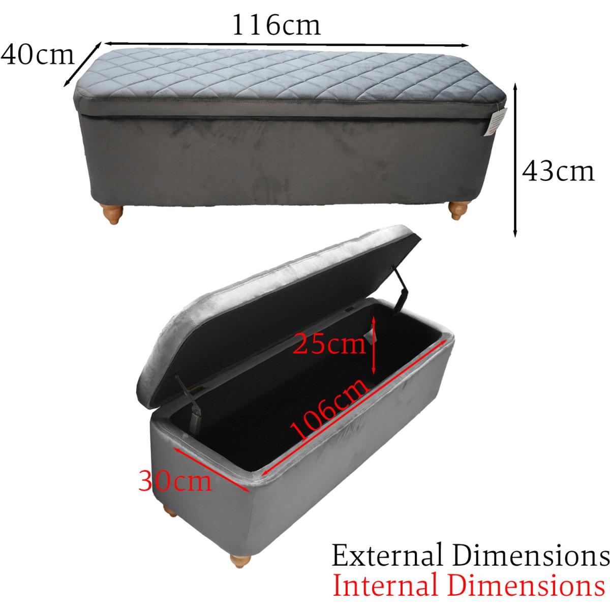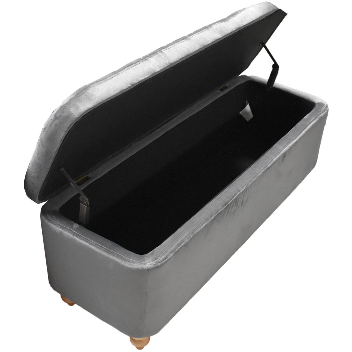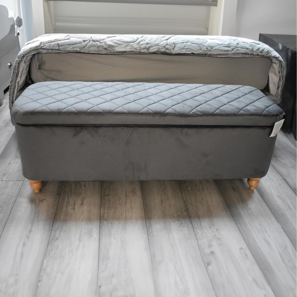 Introducing our Grey Velvet Ottoman Storage Bench with Spindled Wooden Legs, the perfect blend of style and functionality for your living space. Upholstered in a luxurious soft grey velvet finish, this bench exudes elegance and offers a touch of sophistication to any room. The hidden lift-up storage compartment, equipped with robust metal hinges, provides ample space to stow away your belongings, keeping your living area neat and organized. The bench stands on strong solid wooden spindled legs, ensuring durability and stability. To add to its visual appeal, the bench features a beautiful patterned padded seat, offering both comfort and aesthetics.