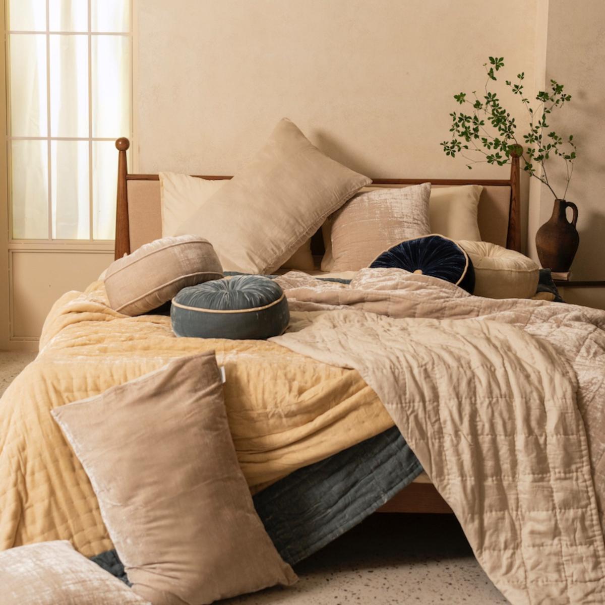 Crafted from luxury velvet on both sides, perfect for coveted moments of relaxation, the inviting softness of the Annam House hand quilt is irresistible. Lending an extra layer of dream-like comfort to bedspreads or couches, its sumptuous luxury velvet plush call for lazy days with loved ones. H:240cm, W:260cm Storage bag included 65% Silk 35% Polyester Outer 100% Polyester filling Dry Clean only.
