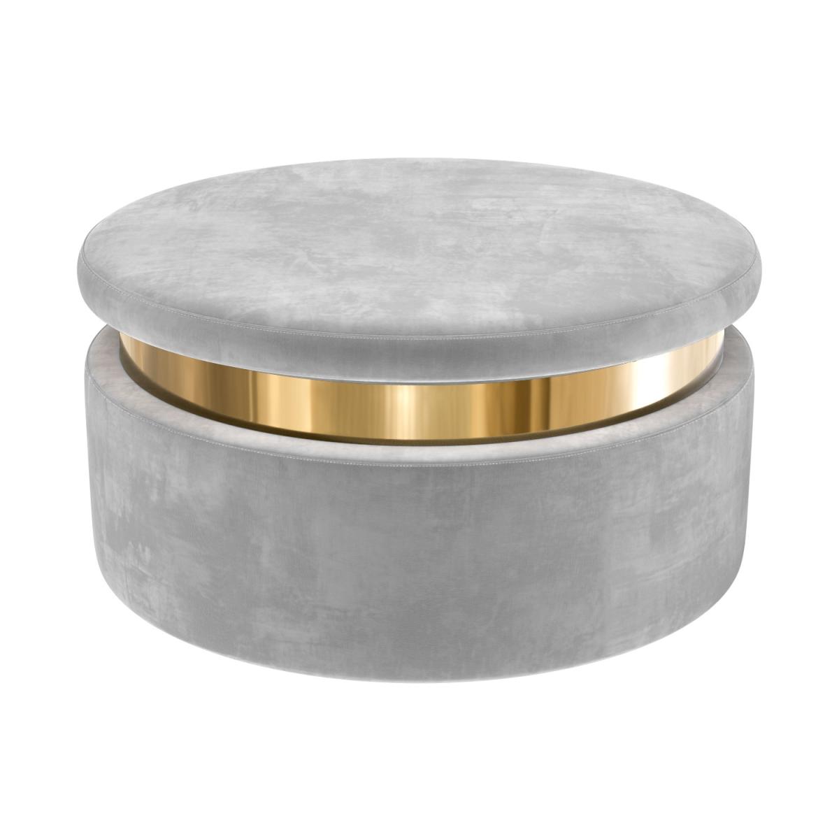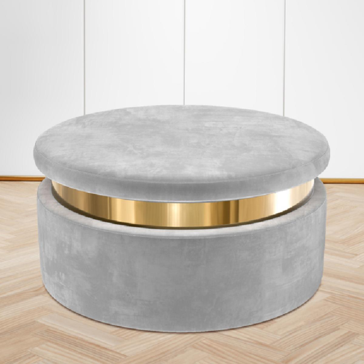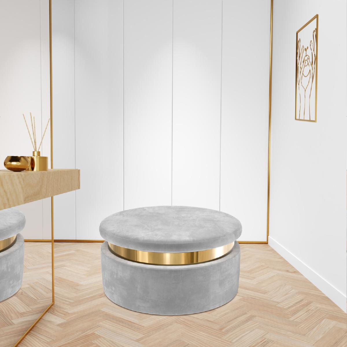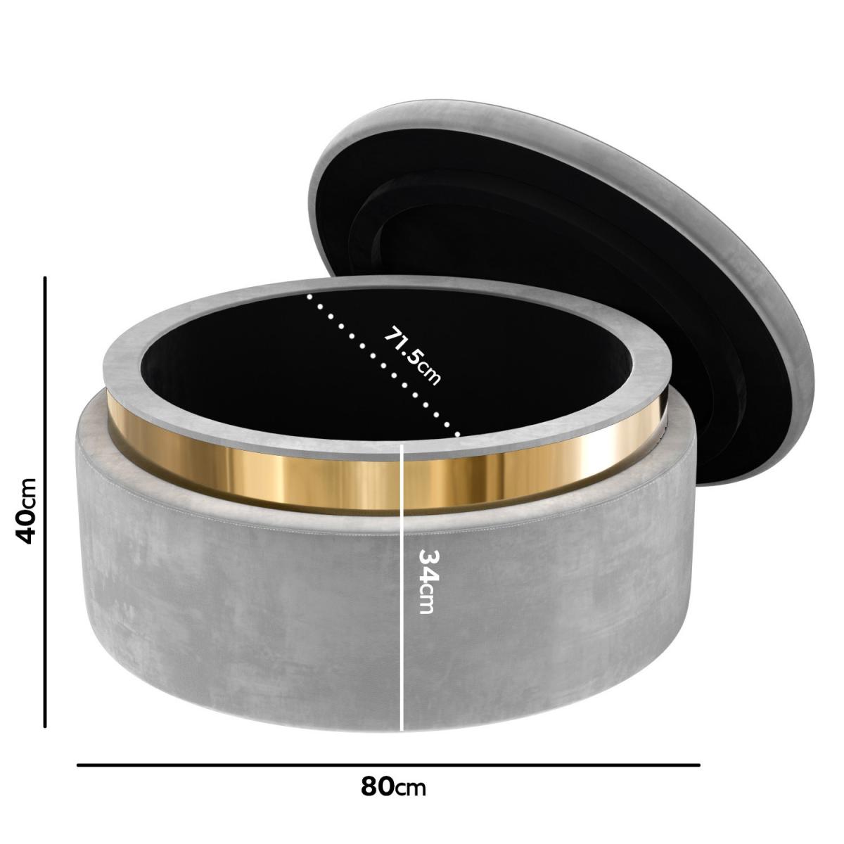 Features we love Round storage pouffe upholstered in soft grey velvet Internal compartment offers plenty of storage. Gold plinth adds art deco style to any room. Looks stylish as a footstool or stool. Also available in baby pink and cream All about me. Add a touch of style and elegance to your home with the Zendaya storage pouffe. Upholstered in soft to touch velvet not only does it offer ample discreet storage it also brings a stylish feel to any room. Use your storage pouffe as a footstool or stool in any living area or even as a feature in your dressing room. The gold plinth brings the piece together and conceals the fastening. Simply lift the lid to reveal the storage compartment. Need to know. Dimensions. H40 x W80 x D80cm Internal dimensions. 71.5cm Colour. Grey Finish. Upholstered Material. Fabric Assembly required. No.
