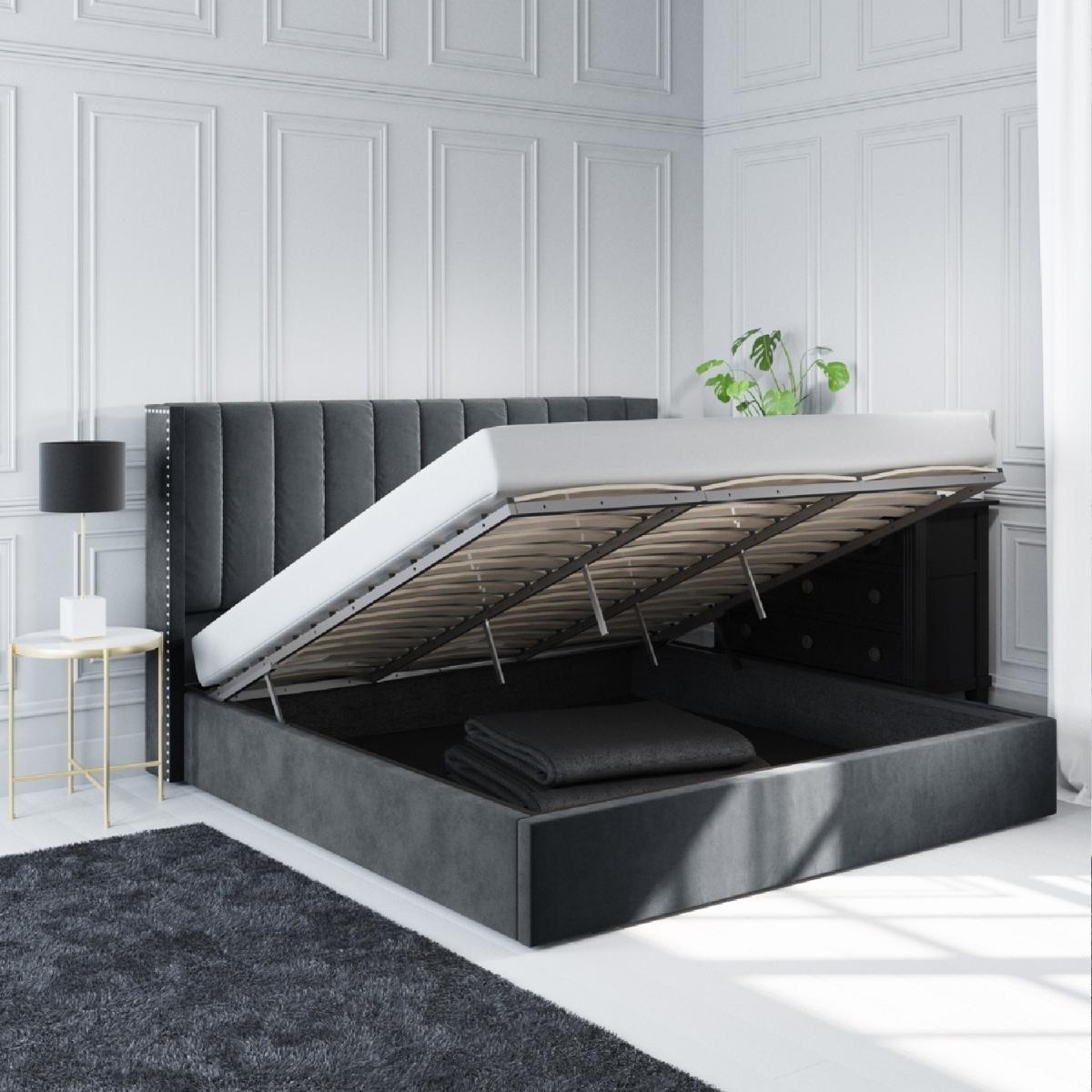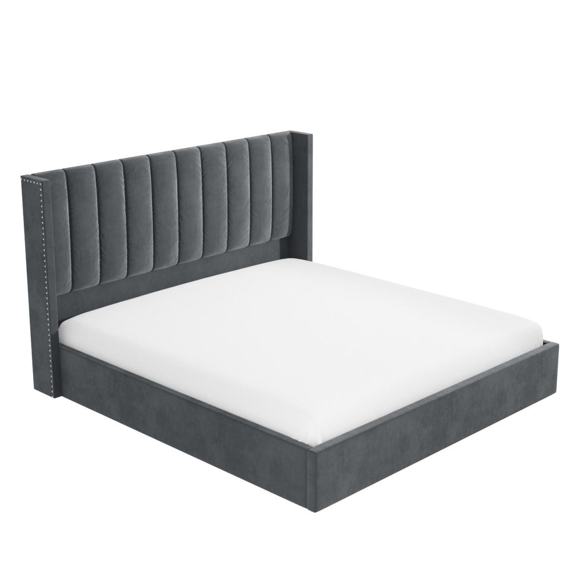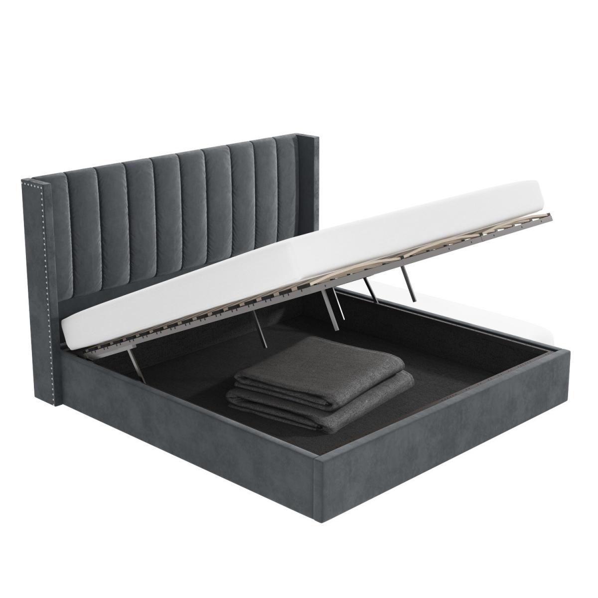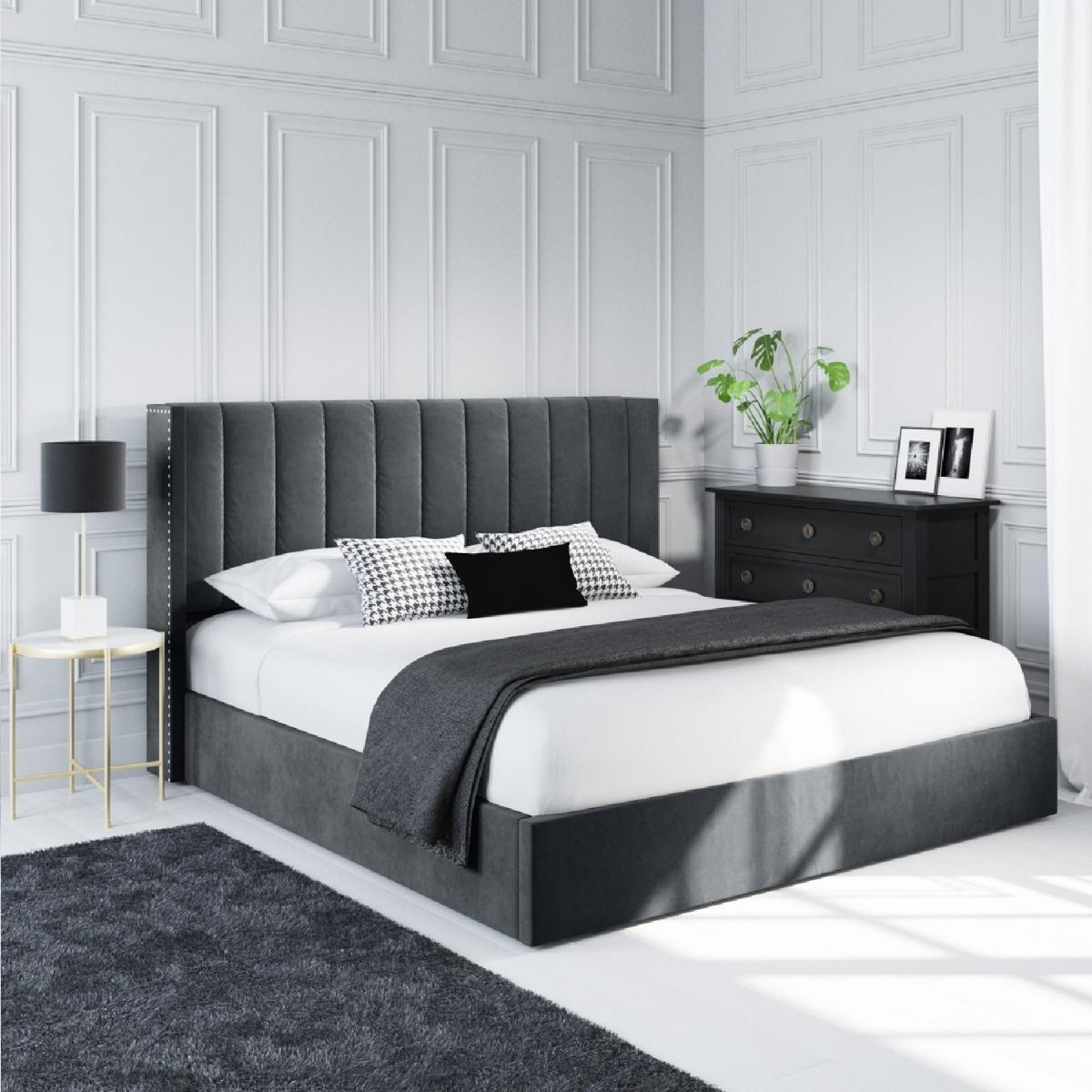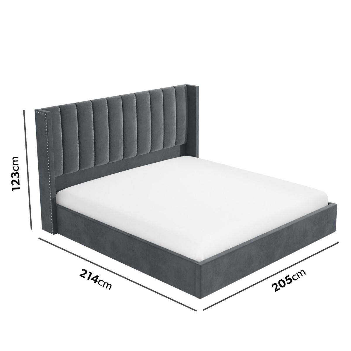 Features we love Front opening storage space with gas lift mechanism provides effortless access. The entire area beneath the mattress can be used as storage!A cushioned headboard gives you the perfect place to rest and delve into a good book. Upholstered in high-quality soft touch velvet brings an air of elegance to your bedroom. Studded detail creates an instant focal point in your bedroom. Fabric base helps to protect your stored items from dust All about me. This Maddox Ottoman has it all! Style comfort and convenience. Upholstered in a soft anthracite grey velvet it'll co-ordinate with all bedroom decor and furnishings. The elegantly winged headboard is lusciously cushioned giving you the perfect place to rest as you read a book or watch TV. Studded detailing finishes off the look creating a focal point in your bedroom. Lift up the mattress and you're greeted with a generous storage space ideal for spare bedding shoes clothes or just about anything you need to store! It's a practical solution for those storage problems we all face. And with a gas mechanism that makes lifting the mattress easy you'll be able to get to those stored items in no time. The storage space features a fabric base helping to keep the area free from dust and your items clean and ready to use. It's a high quality build too with a durable wooden frame a sturdy wooden sprung slatted base and supported by central legs for extra stability you'll have assured mattress support! This bed fits a UK standard Super King mattress which isn't included so you'll be able to choose one that's perfect for you. Need to know. Total dimensions. W 205 x D 214 x H 123 cm Storage dimensions. W 182 x D 202 x H 22cm Height from floor to mattress. 30 cm Mattress height should not exceed 25cm. Bed mattress size. Standard UK Super King (180 x 200cm / 6ft) Colour. Anthracite grey Material. Solid wood combination of MDF Finish. Upholstered in soft velvet Bed base. Wooden sprung slatted Assembly required. Yes Mattresses included. No.