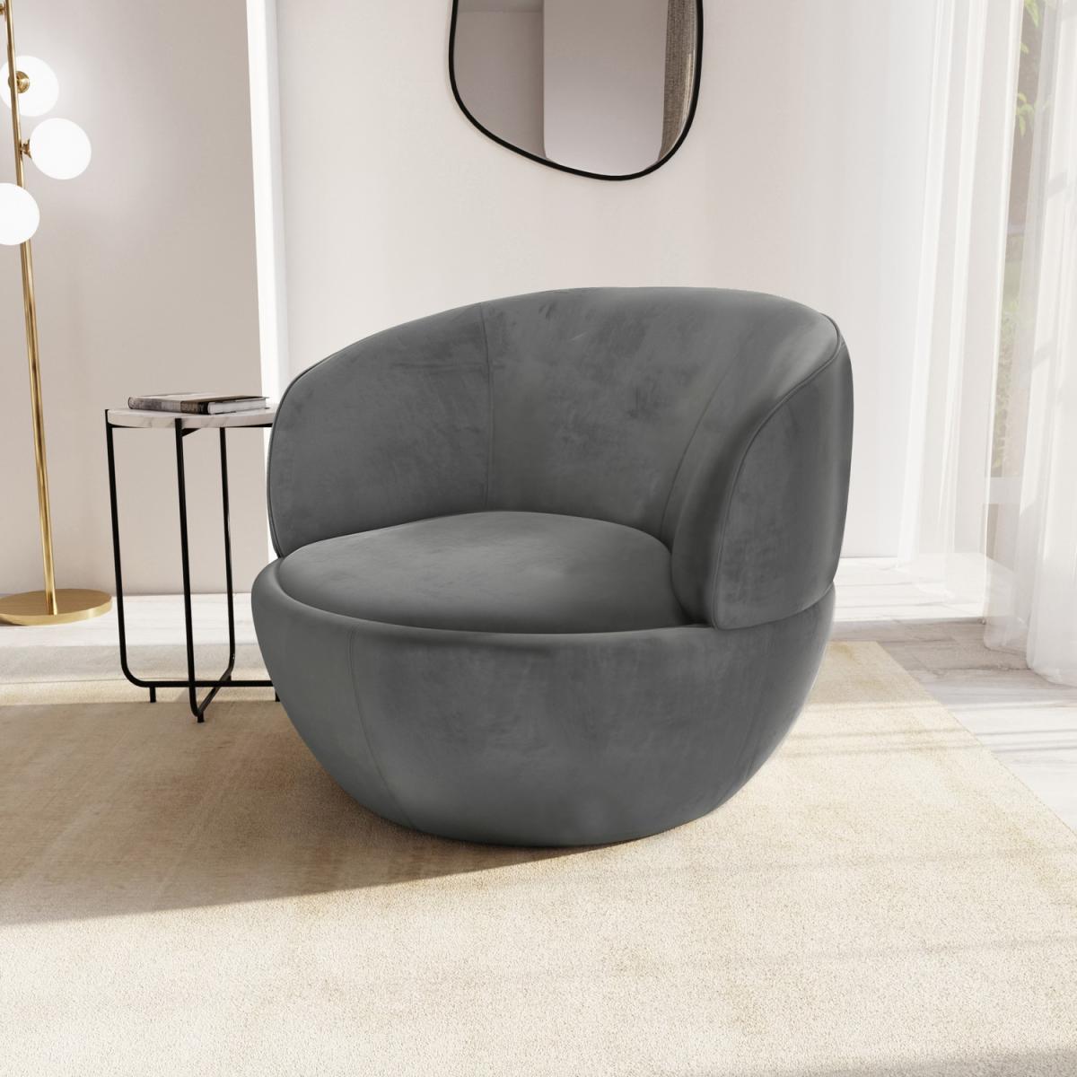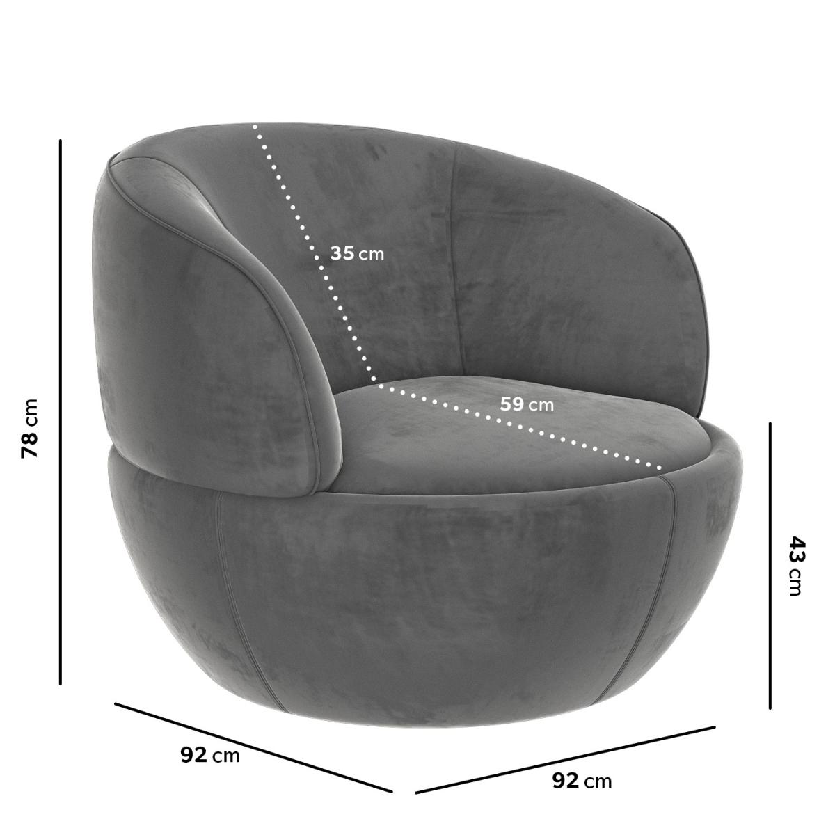 Grey velvet curved tub armchair with black legs Comfy, foam-filled seat upholstered in plush velvet Modern compact design to save space Its unique design makes a statement in any room Available in Beige or Grey to suit your style All About Me The Grey velvet Lorna armchair has style in every curve. Its stylish plump circular silhouette provides the perfect statement piece for any room, as well as providing a great space-saving solution for the smaller space. Need to know Material: Velvet Fabric Main Colour: Grey Product Weight: 22 kg Packed Weight: 25 kg Number of seats: 1 Max supported weight: 110kg Assembly required: No