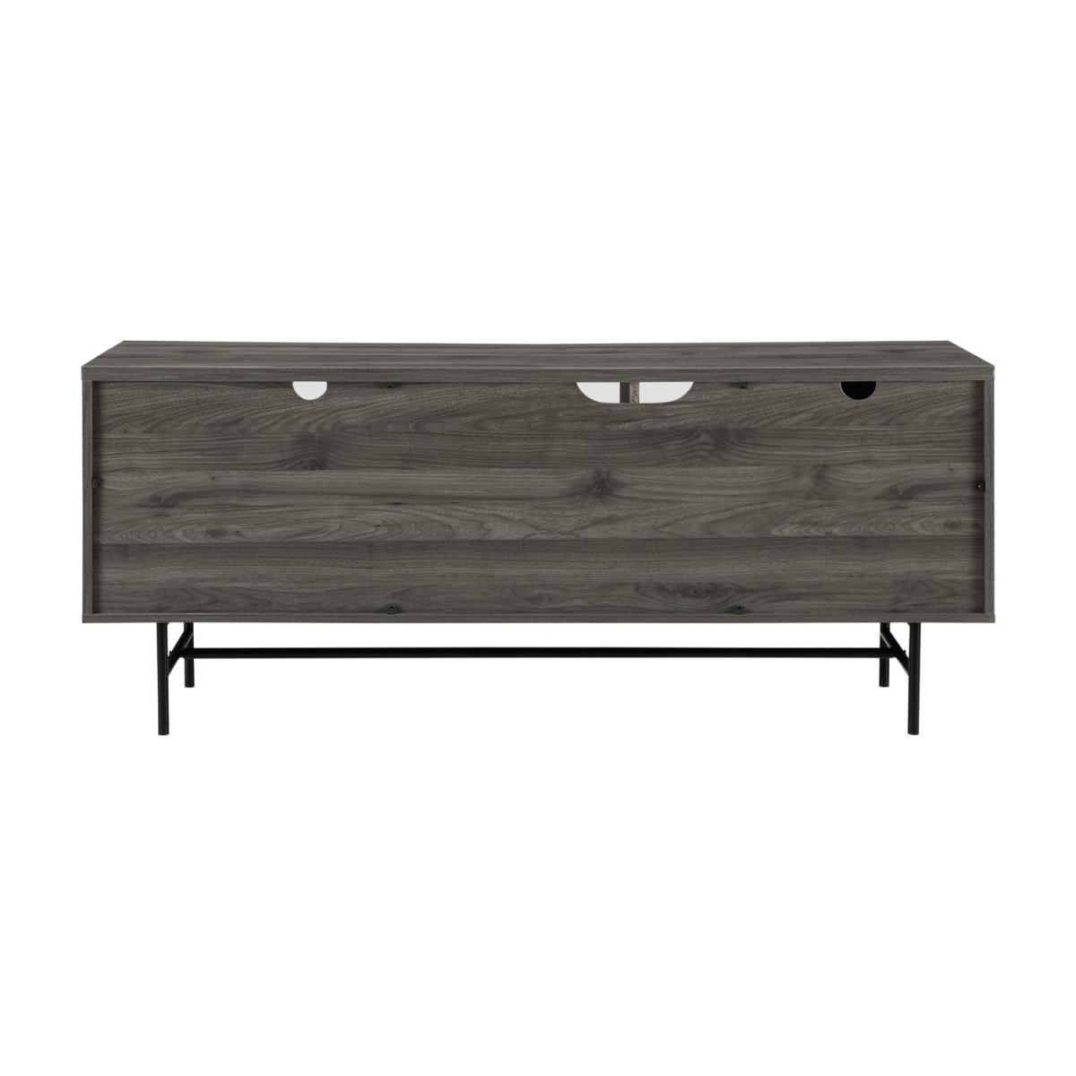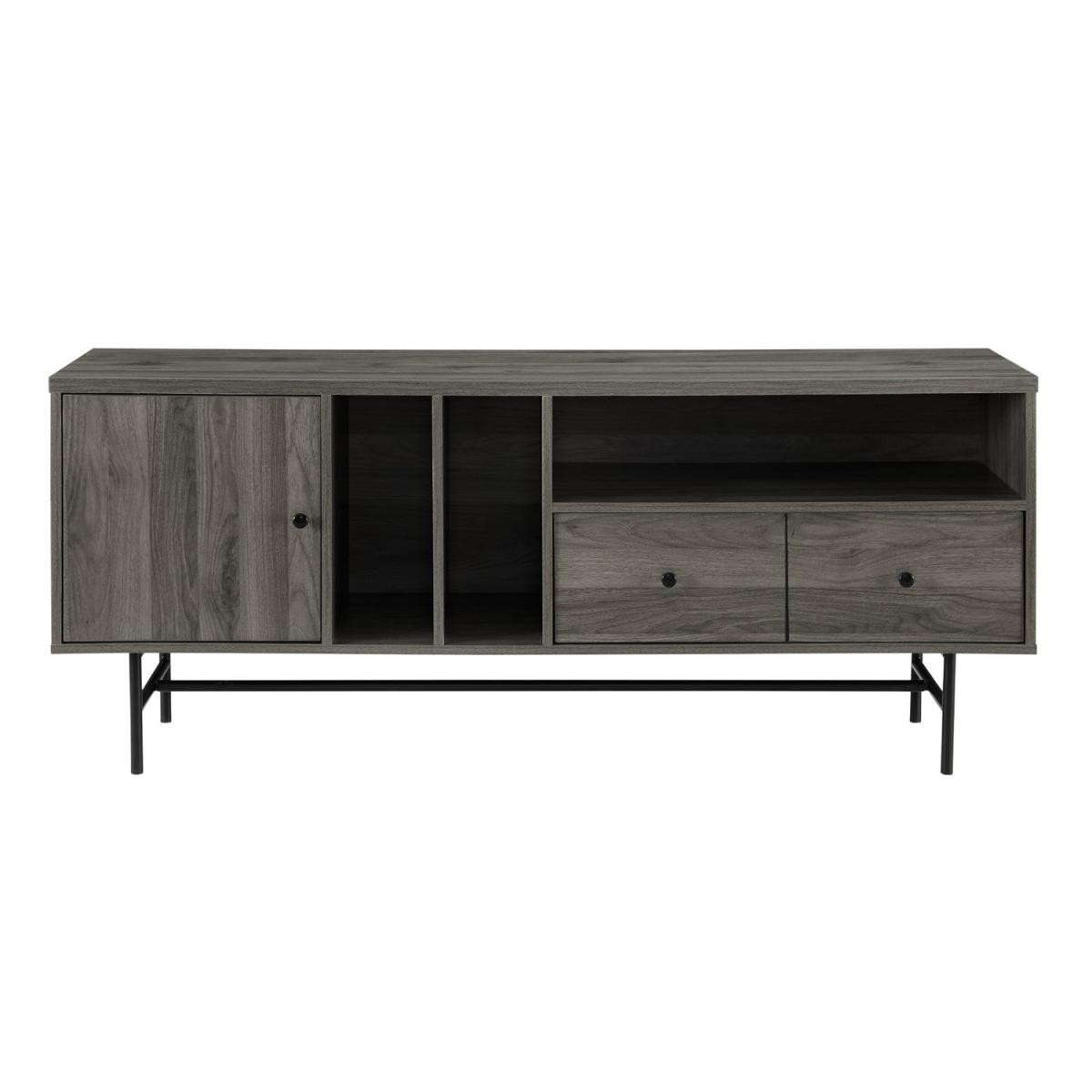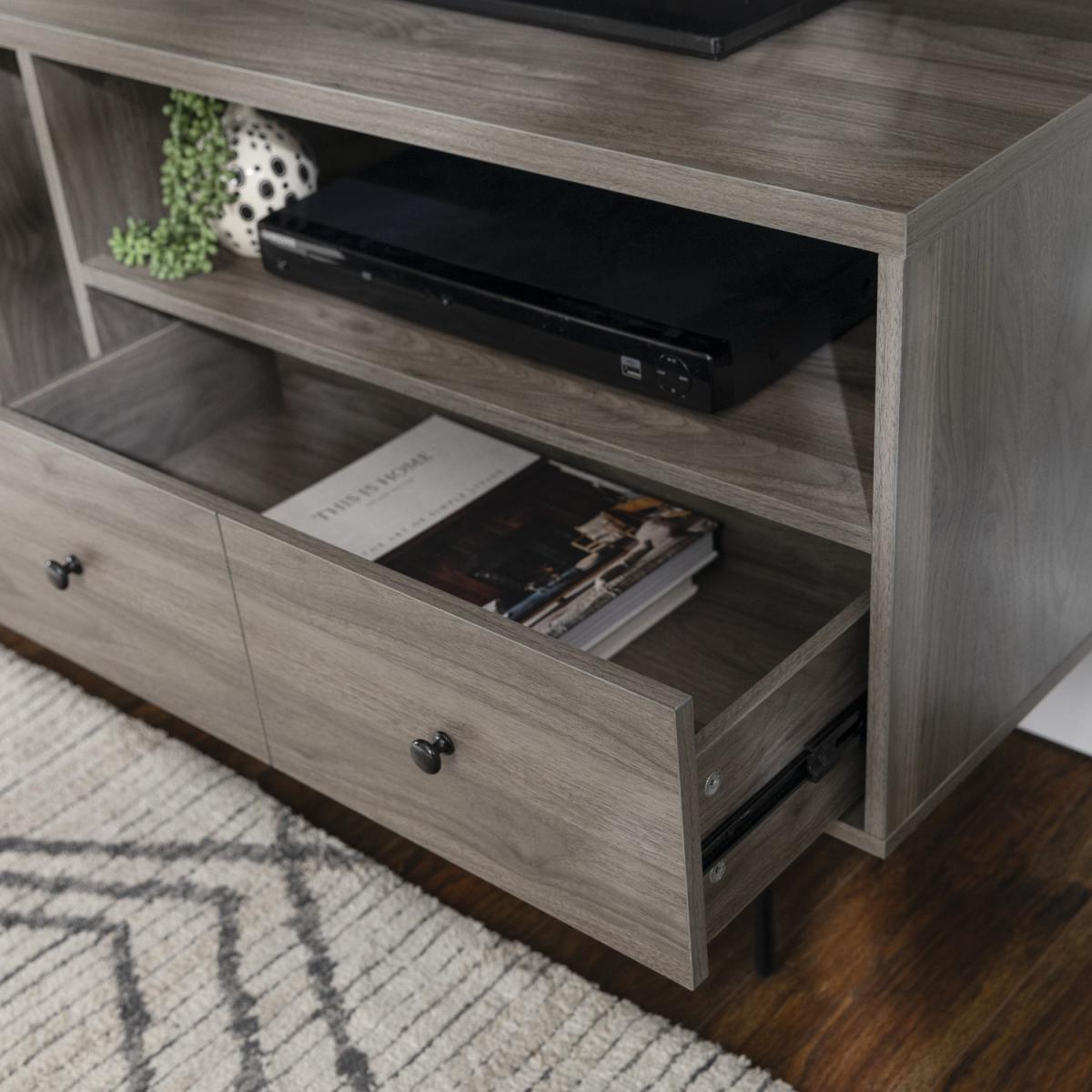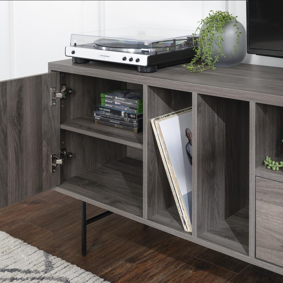 This fully finished vintage inspired media stand is a great place to store records, taller books, or other eclectic finds. There are two vertical cubbies along with one horizontal cubby that provide open storage options that each include cord management holes that allow you to set up gaming consoles, cable boxes, or other media how you'd like. One door with adjustable metal hinges, along with one drawer that looks like two, provides closed storage options. This TV console can accommodate TVs up to 66-inches.