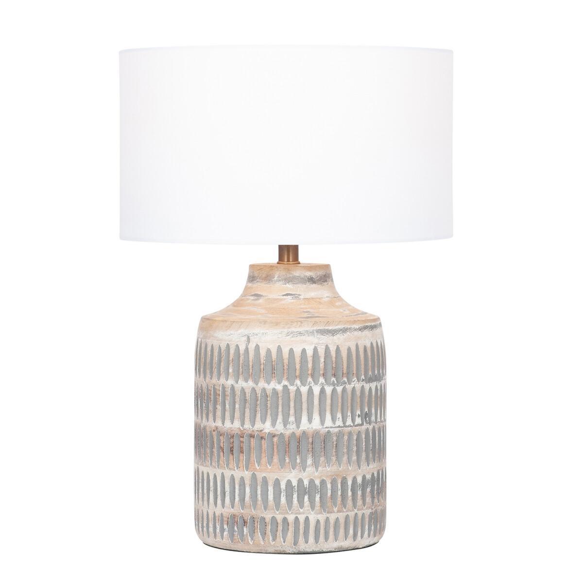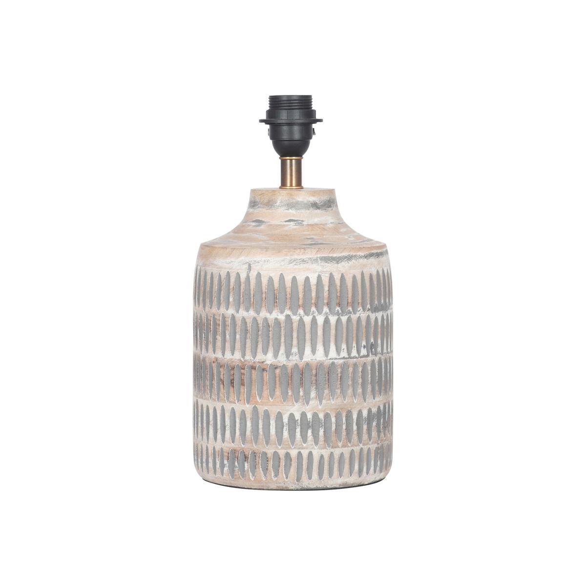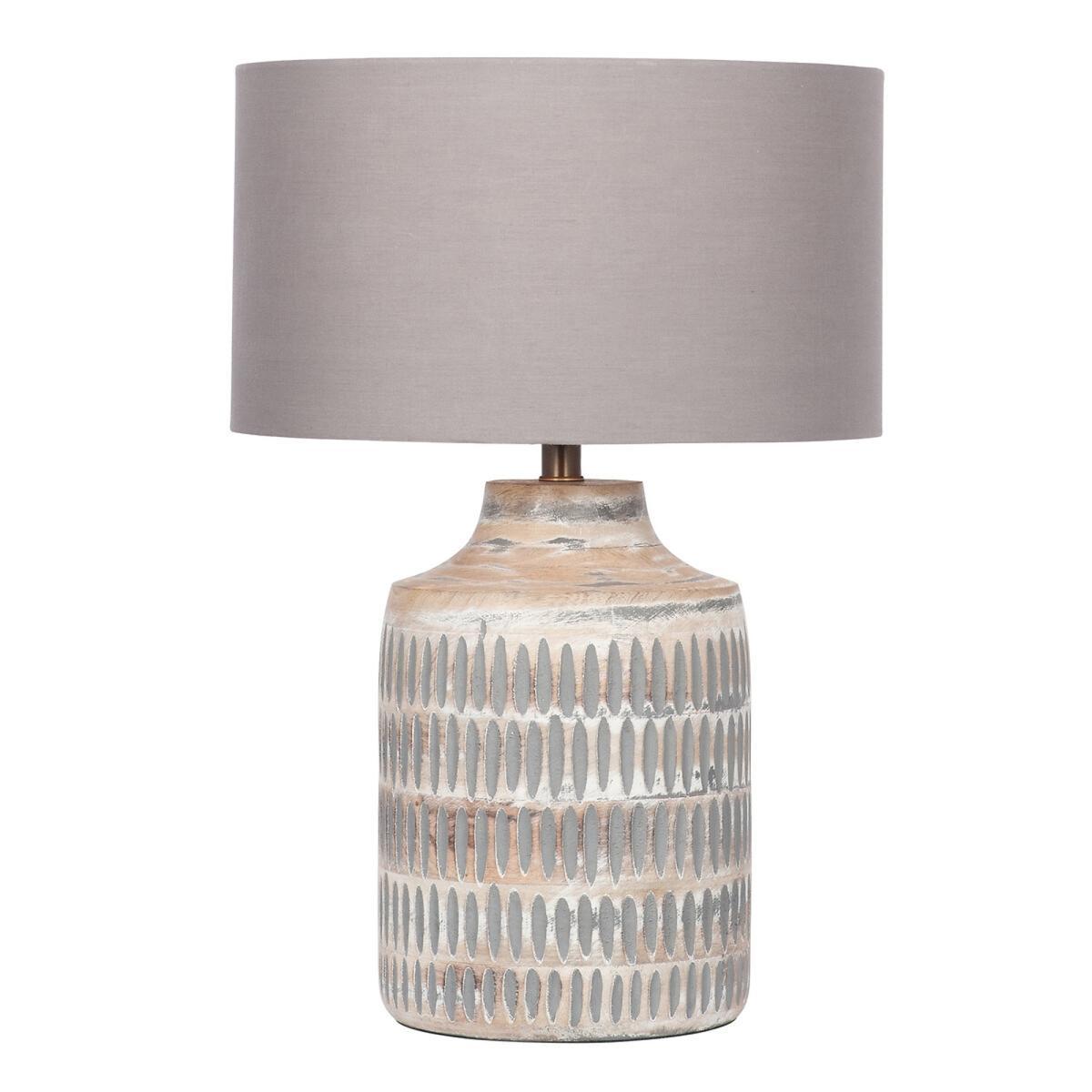 Finished in a grey wash this lamp gives a softer rustic style. Handcrafted in India, the base is made from mango wood and hand carved with an organic stripe design giving each one a unique look. Bulb type required: ES/E27 GLS 60W. Recommended lampshade size: 35cm. Product Dimensions: H 33.5 x W 17 x L 17 cm. Please note Lampshade and Bulb are not included. This product will be dispatched by one of our trusted suppliers. You’ll be contacted by their selected courier about your delivery.