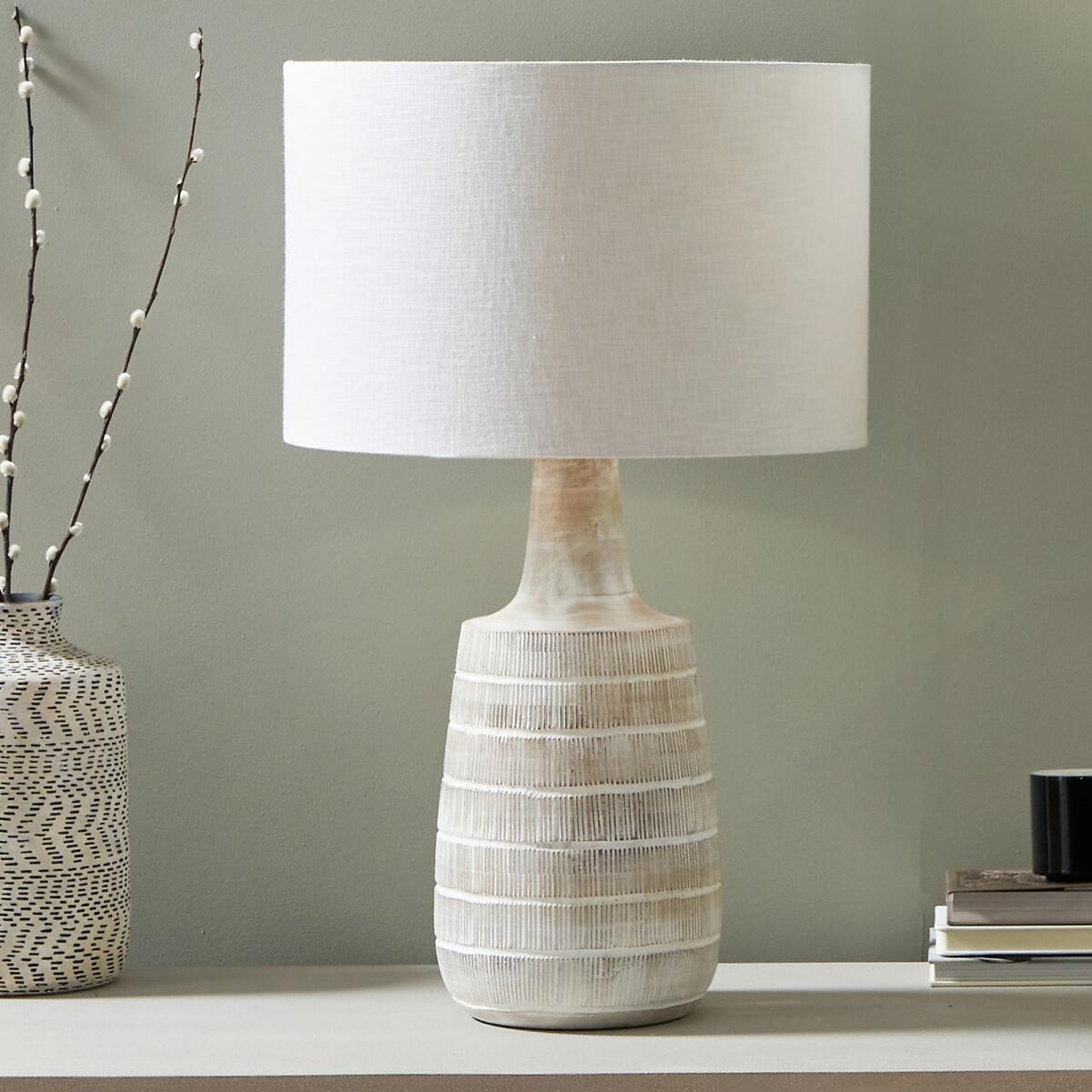 A beautifully tall and elegant wooden lamp base with scandi styling and tactile finish. The lamp base is in a subtle white wash with a hand crafted etched design. Finish with one of our stylish cylinder shades from our extensive range. Product Dimensions: 20x20x47cm Bulb Type:E27 Black plastic Maximum Wattage:60W Bulb Included?:No. Number of Bulbs Required:1Cable/ Switch Info:Black plastic, 2x0.75mm², 2m from base, Black in-line switch (40cm from base)This product will be dispatched by one of our trusted suppliers. You’ll be contacted by their selected courier about your delivery.
