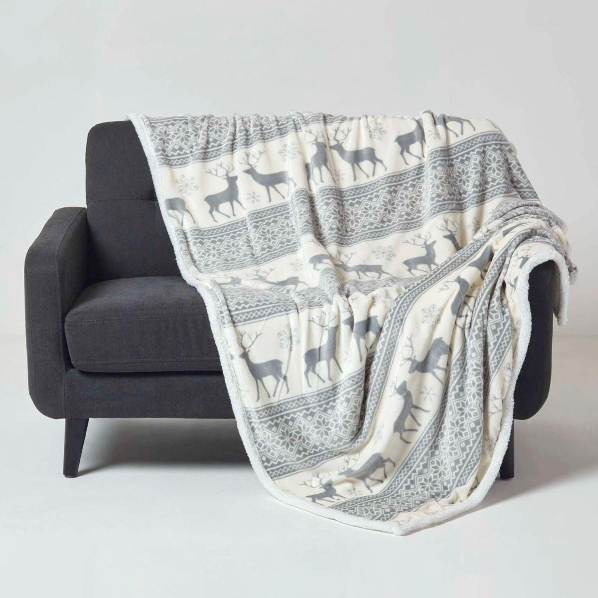 Super soft grey and white stag Sherpa throw. Perfect for keeping cosy during long winter nights, this luxury sofa throw feature a cream Sherpa style reverse and is available in one size (130 x 180 cm) perfect for single and double beds and small sofas. Woven from the softest velvet and featuring a Nordic style winter pattern, each throw is well filled and expertly stitched, resulting in a top quality and durable home accessory. Washable at home, ensure thoroughly dry before use.