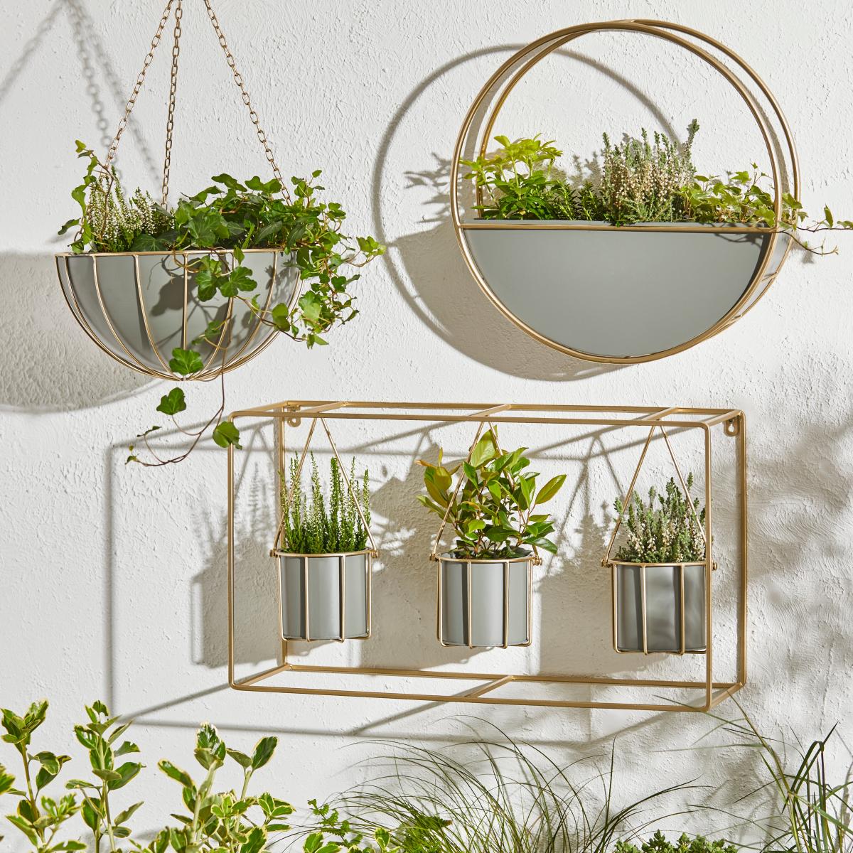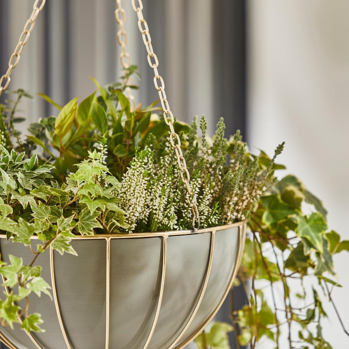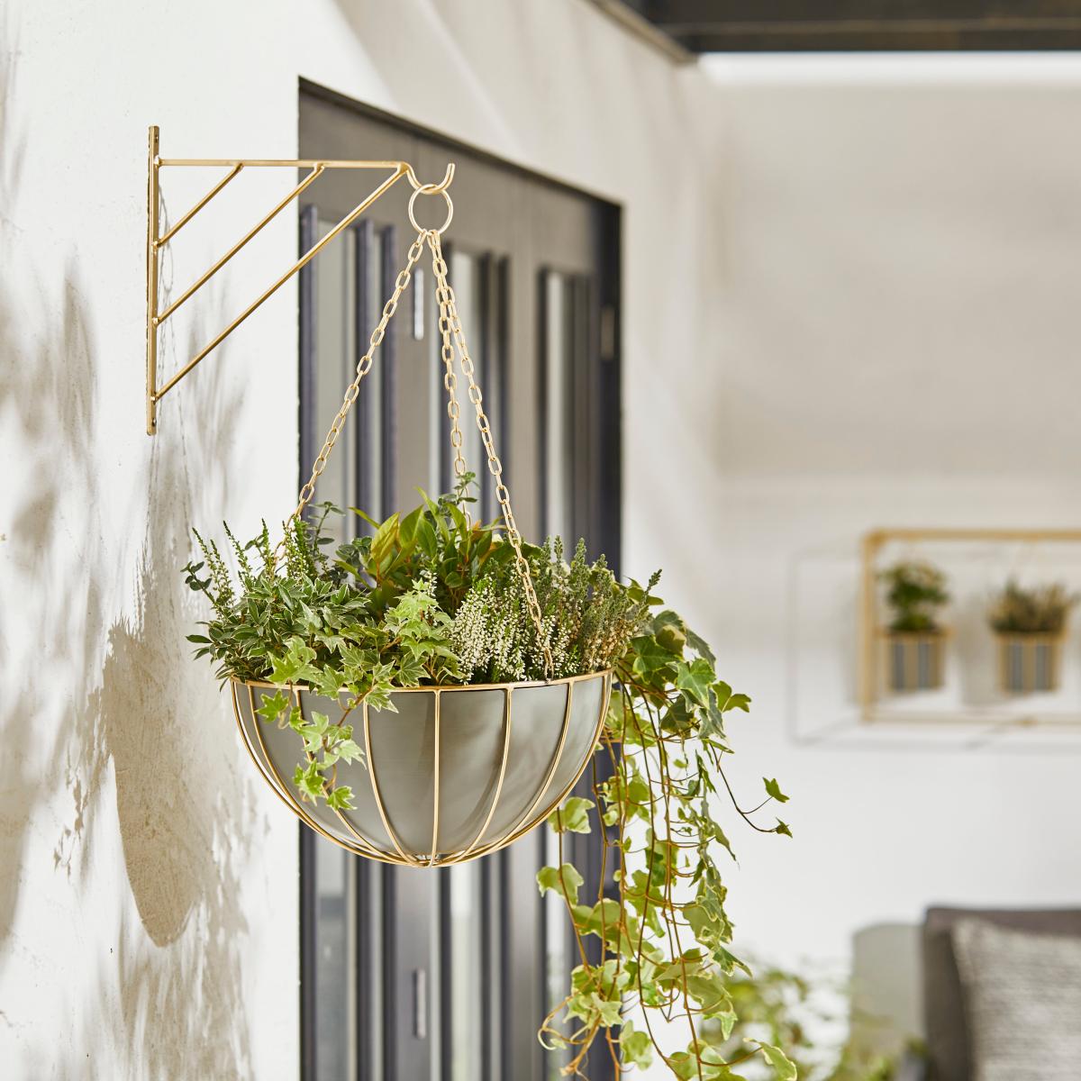 Grey Wire Hanging Basket with Gold Bracket MultiColoured