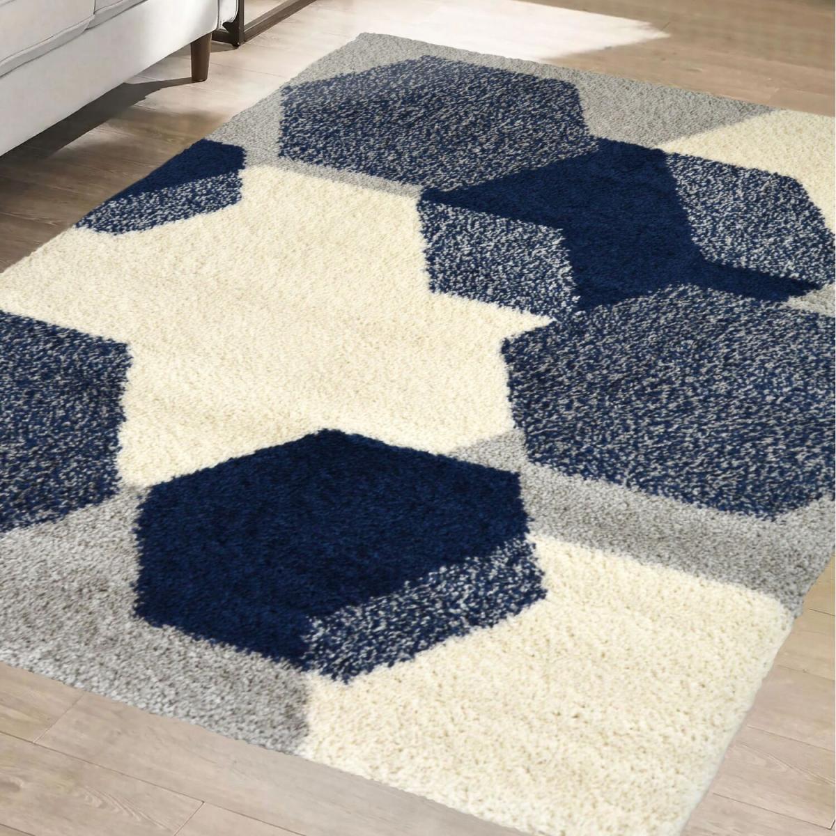 Grey With Navy Geometric Deep Living Room Shaggy Rug - Brae - Blue