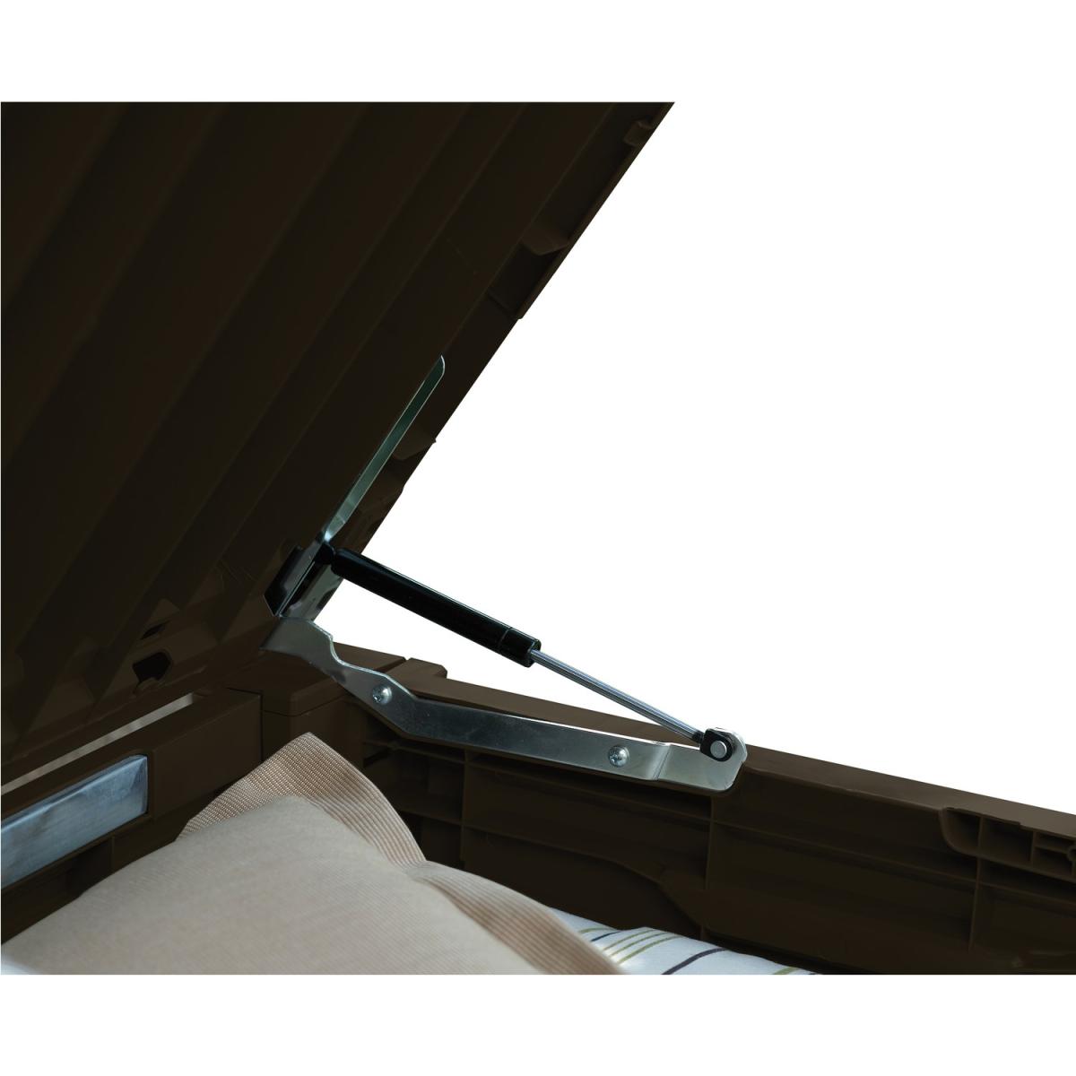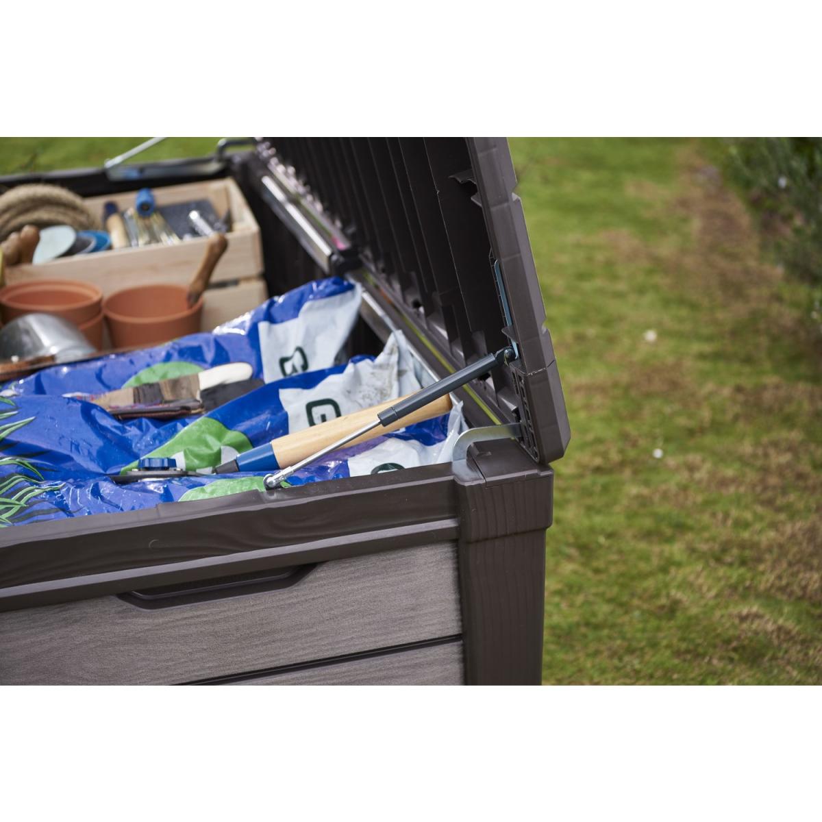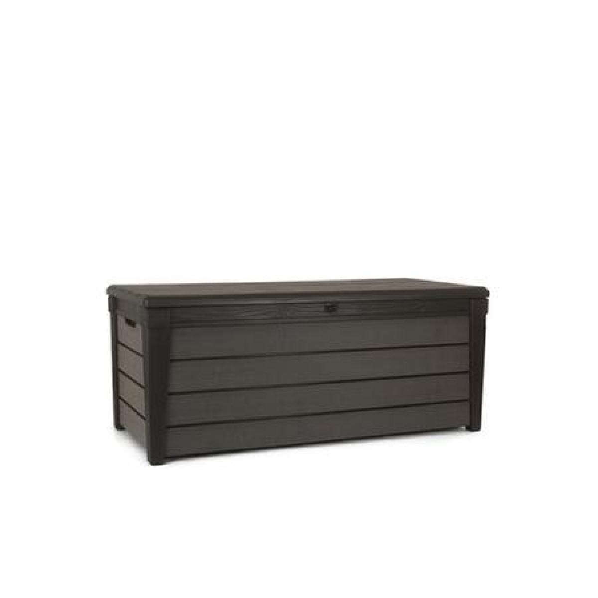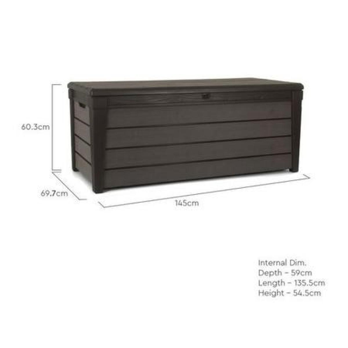 Storage Box Dimensions H60.30cm x W69.70cm x D145cm. Get the sleek look of wood panels without any of the maintenance. With durable resin construction providing style as well as full weather resistance. This extra large storage box seats 2 adults comfortably and automatic opening mechanism and suitable for storing even your largest items. Features. Pistons for easy opening. Water Resistant and Lockable (lock not included)Strong Moulded resin with a textured wood look finish. Internal Dimensions H54.5cm x W135.5cm x D59cm. Flat packed for conveince but easy to assemble. Assembly required..