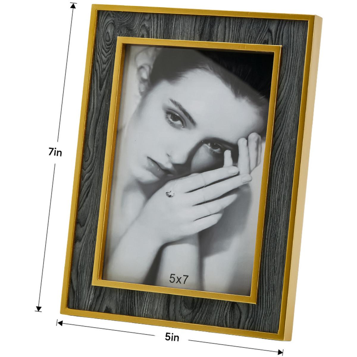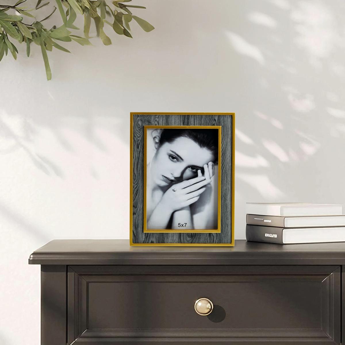 Show off your best moments with this attractive photo frame from Livingandhome. The combination of the cool grey hue and the warm gold trim creates a visually appealing contrast, making this frame a focal point in any room. The frame is designed to hold a 5x7-inch photo and comes with a sturdy easel back for easy tabletop display.